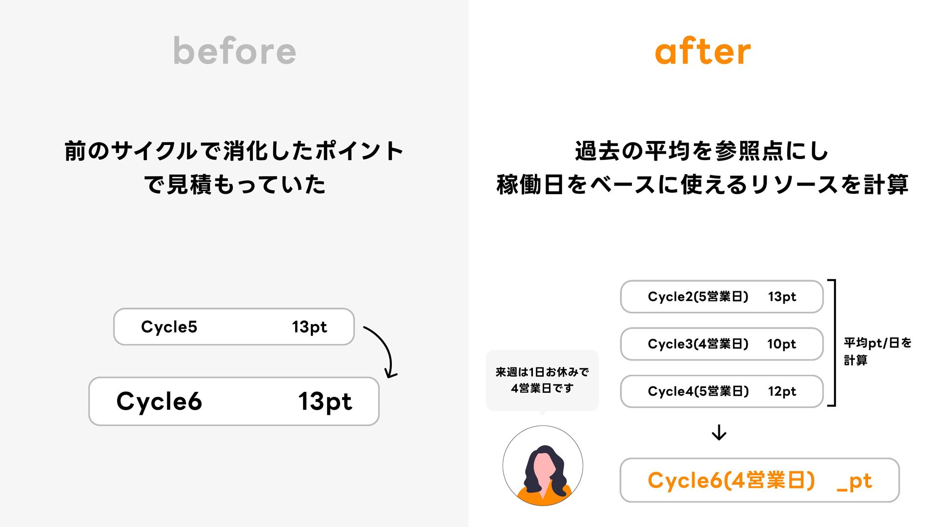 来週は1日お休みで 4営業日です before after 前のサイクルで消化したポイント で見積もっていた 過去の平均を参照点にし 稼働日をベースに使えるリソースを計算 Cycle6 13pt