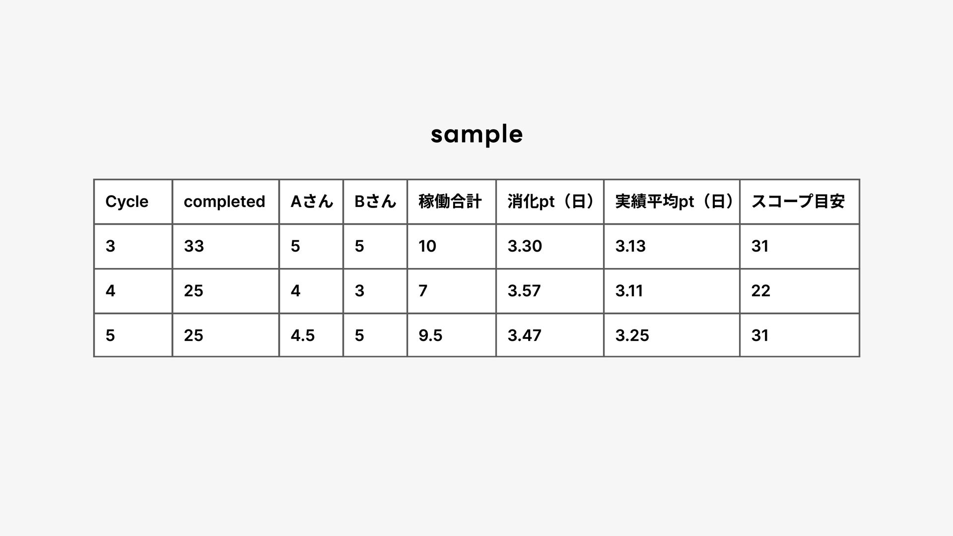 Aさん Bさん 稼働合計 消化pt(日) 実績平均pt(日) スコープ目安 3 33 5 5 10 3.30 3.13 31 4 25 4 3 7 3.57 3.11 22 5 25 4.5 5 9.5 3.47 3.25 31 6 - 5 5 10 - - -