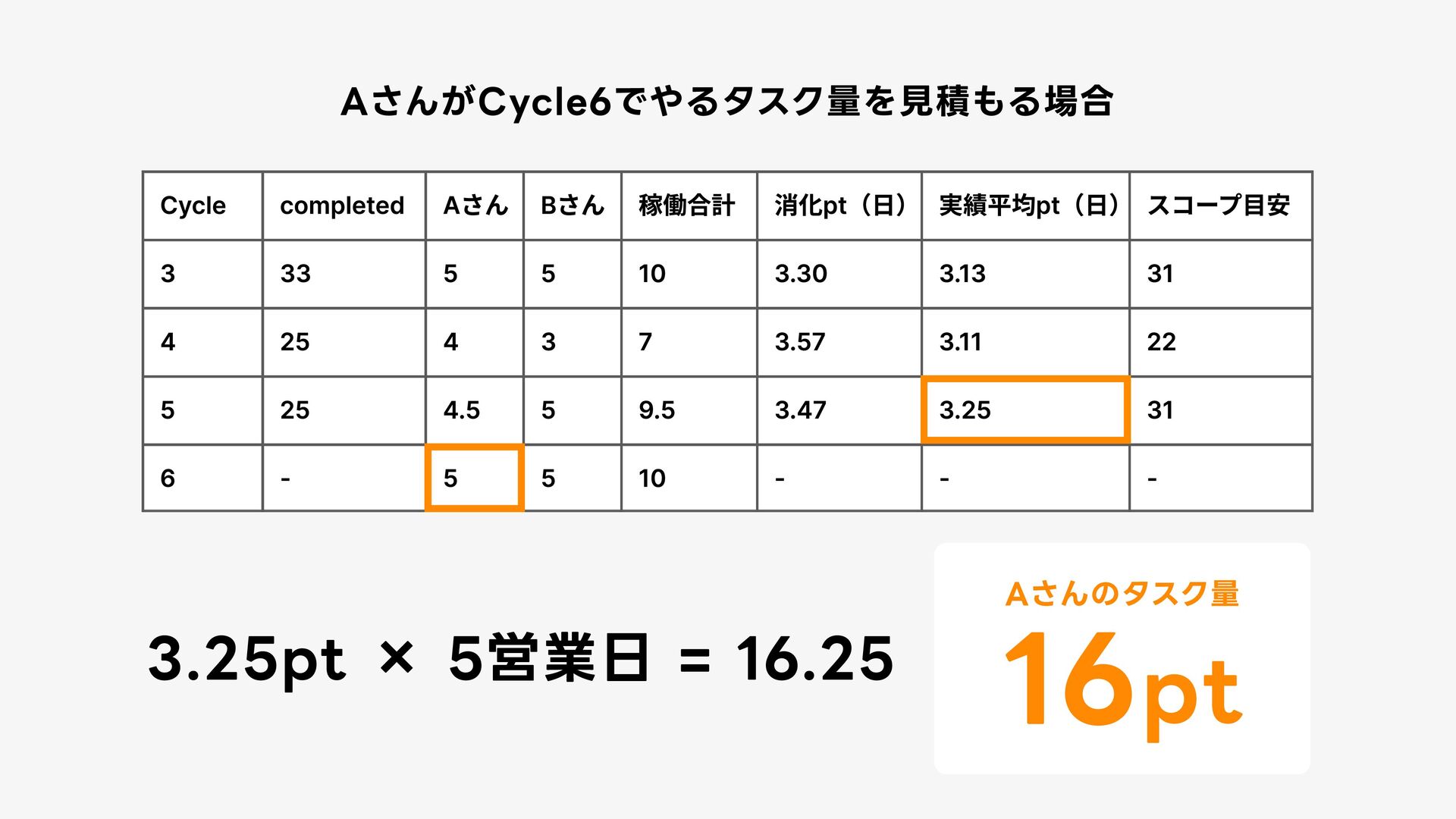 AさんがCycle6でやるタスク量を見積もる場合 3.25pt × 5営業日 = 16.25 Aさんのタスク量 16pt Cycle completed