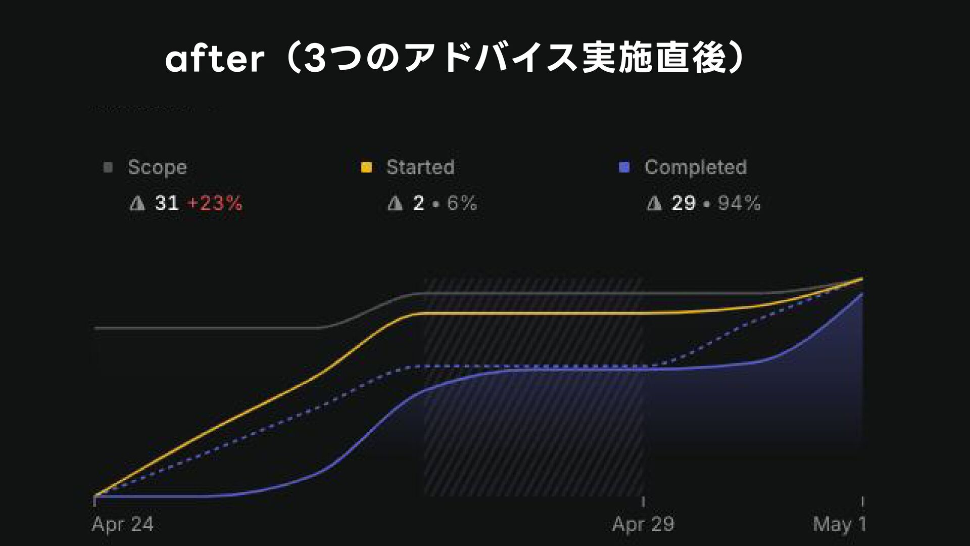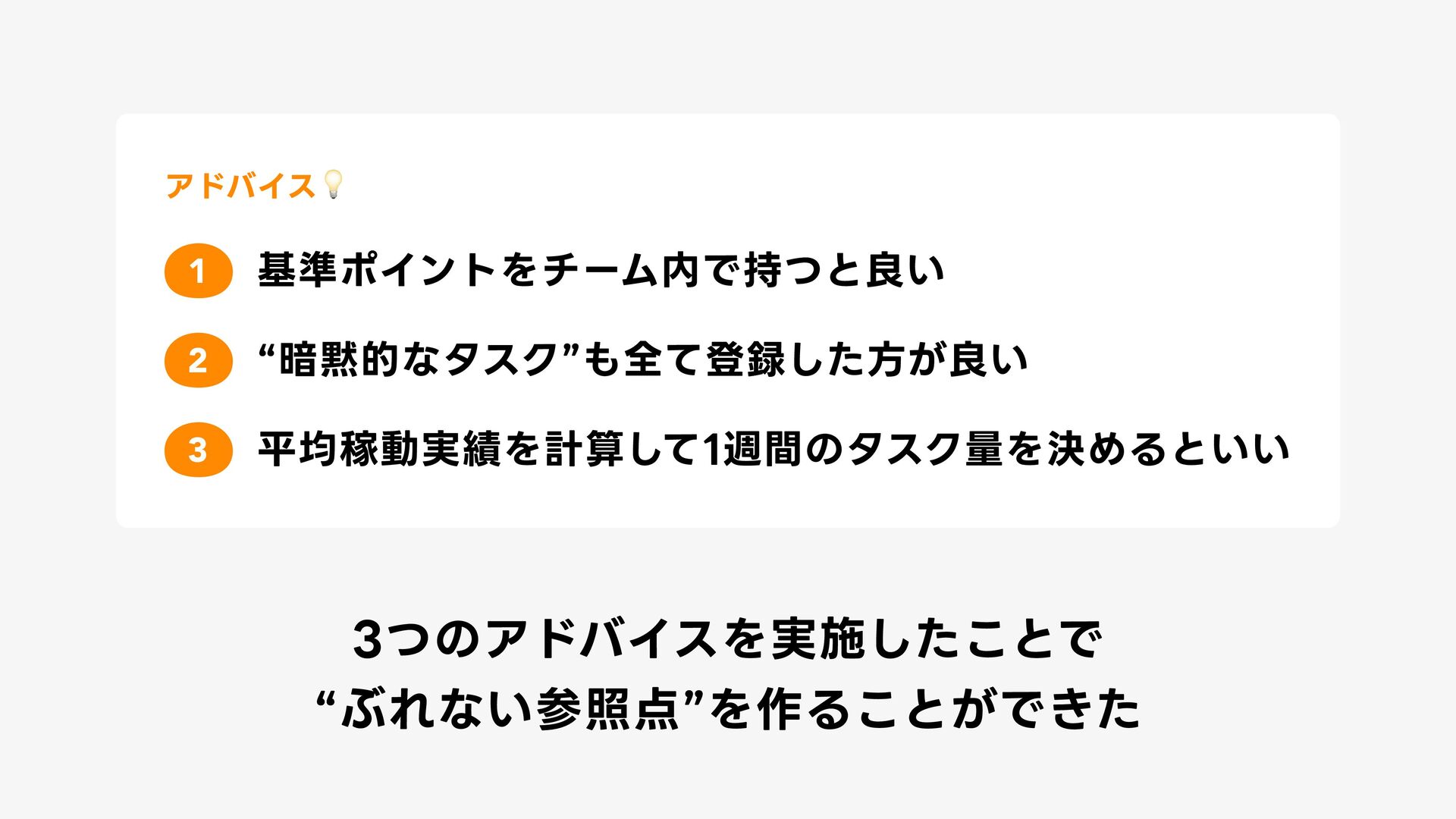 3つのアドバイスを実施したことで “ぶれない参照点”を作ることができた アドバイス 1 基準ポイントをチーム内で持つと良い 2 “暗黙的なタスク”も全て登録した方が良い 3 平均稼動実績を計算して1週間のタスク量を決めるといい