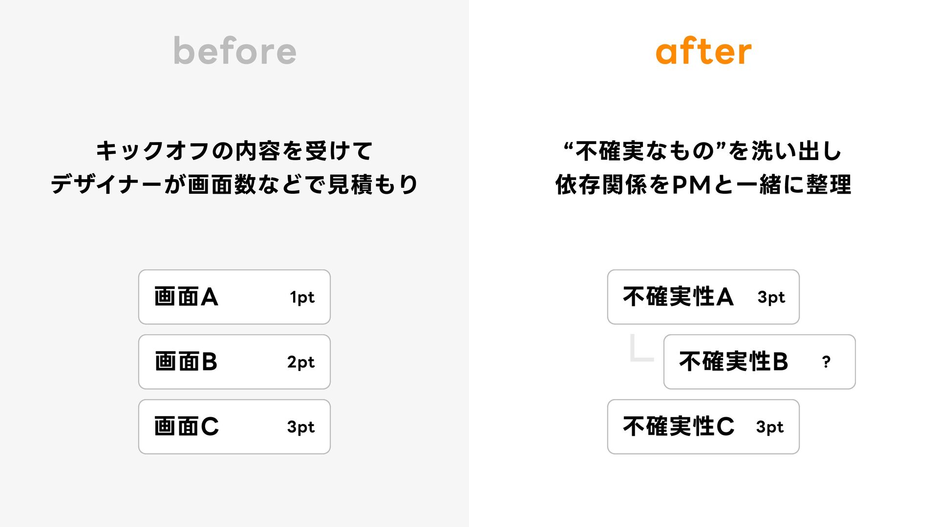 before after “不確実なもの”を洗い出し 依存関係をPMと一緒に整理 キックオフの内容を受けて デザイナーが画面数などで見積もり 画面A 不確実性A 1pt 3pt