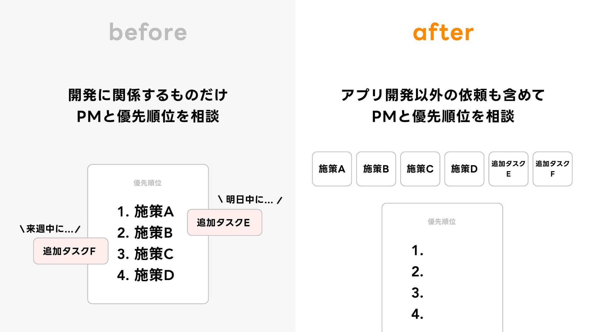 before after アプリ開発以外の依頼も含めて PMと優先順位を相談 開発に関係するものだけ PMと優先順位を相談 eX 施策Y cX 施策b
