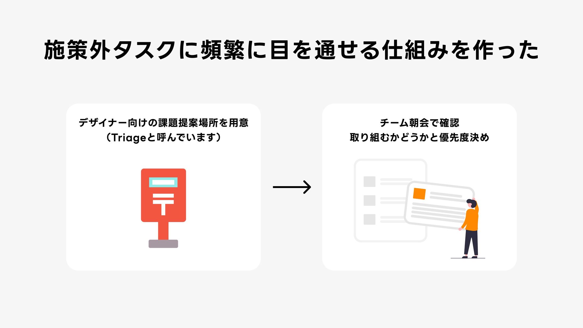 デザイナー向けの課題提案場所を用意 (Triageと呼んでいます) チーム朝会で確認 取り組むかどうかと優先度決め 施策外タスクに頻繁に目を通せる仕組みを作った