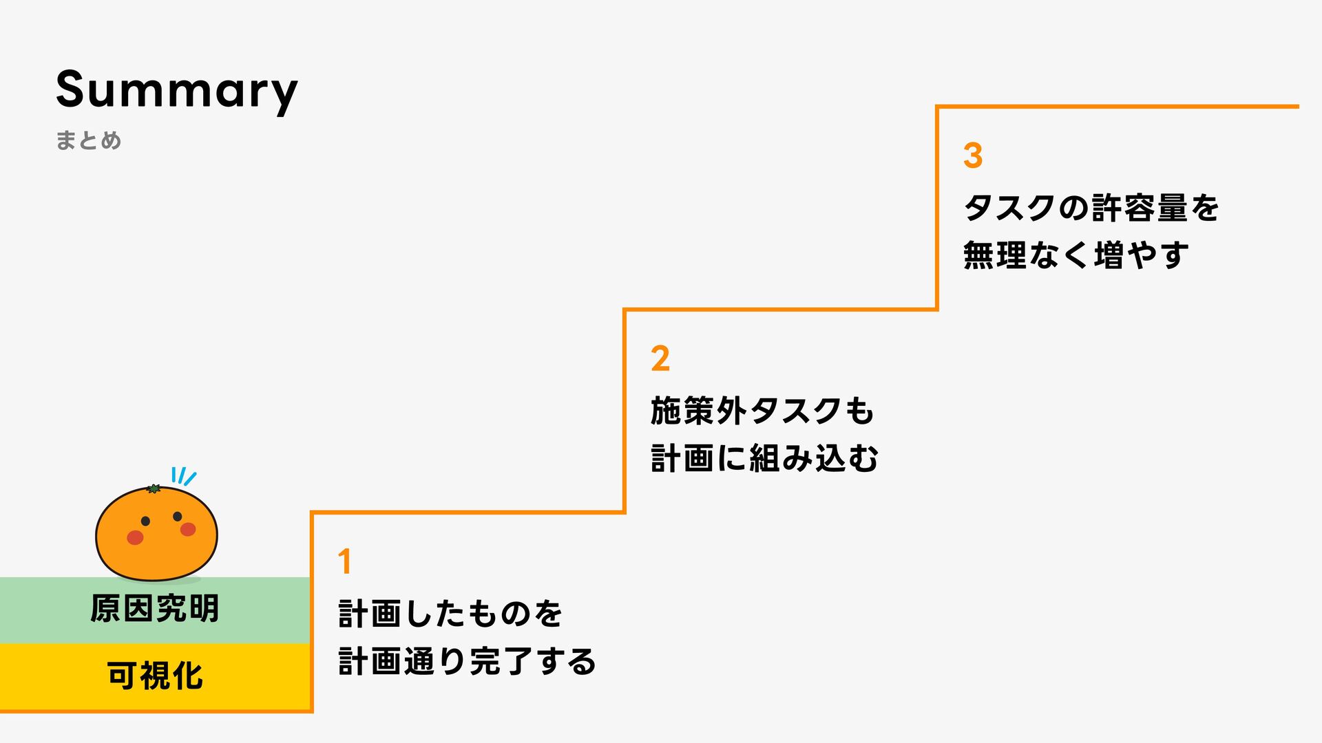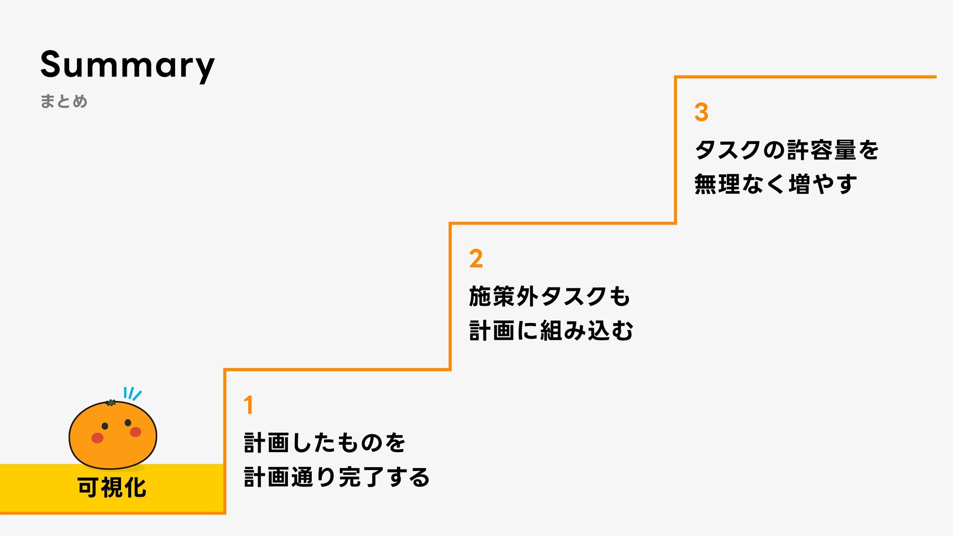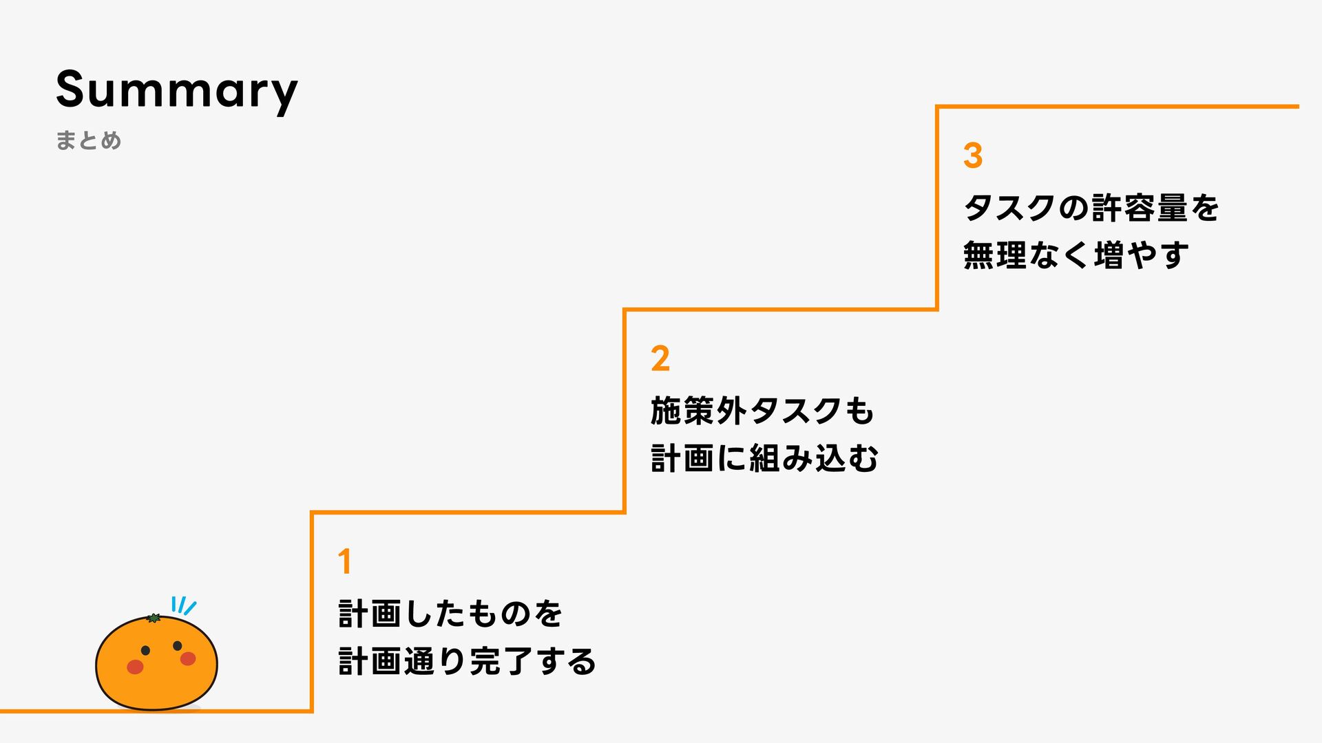 Summary まとめ 1 計画したものを 計画通り完了する 2 施策外タスクも 計画に組み込む 3 タスクの許容量を