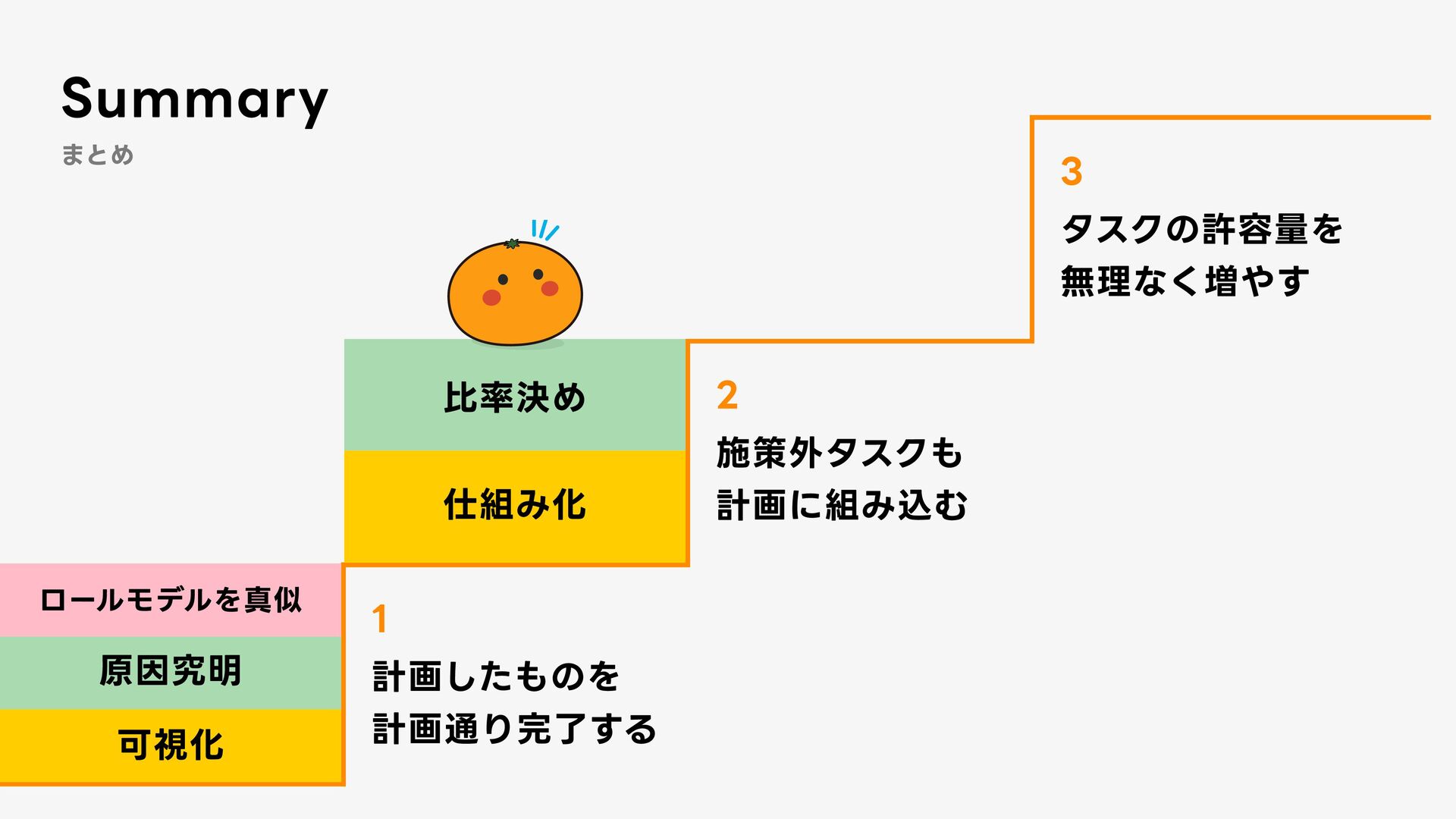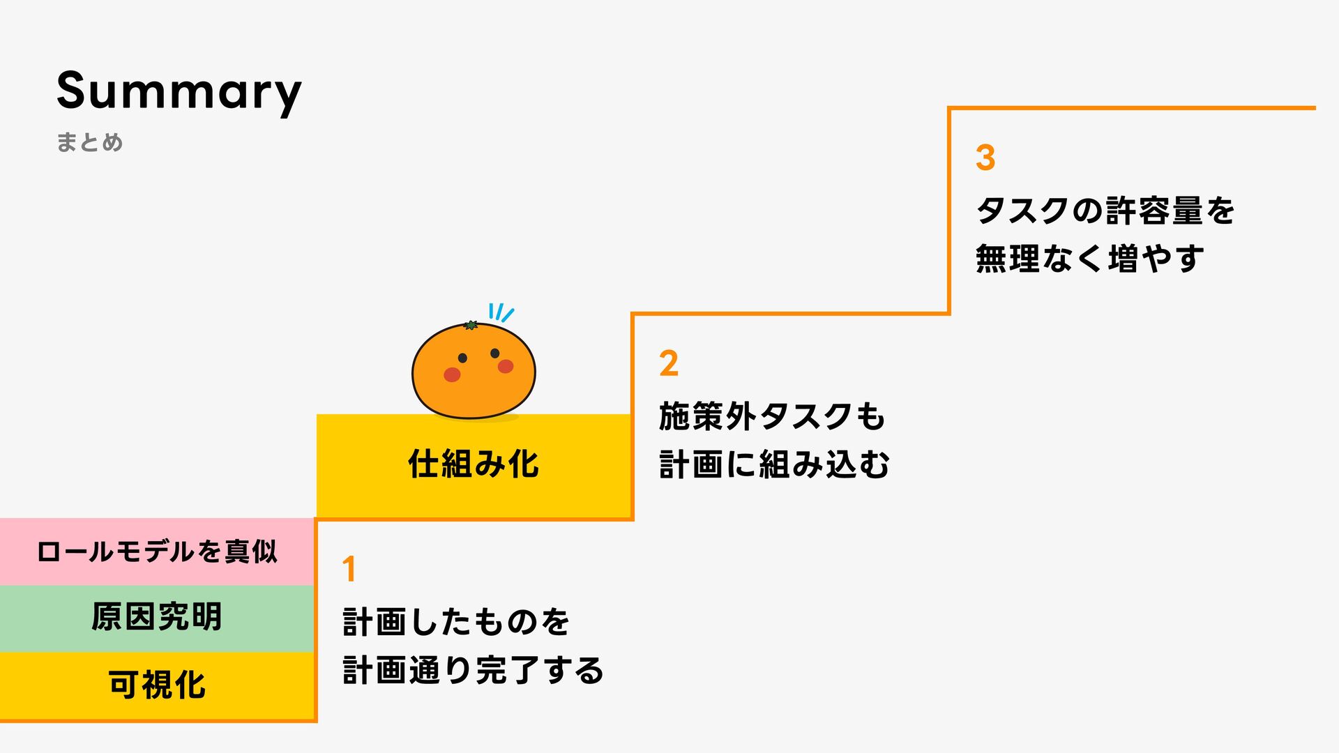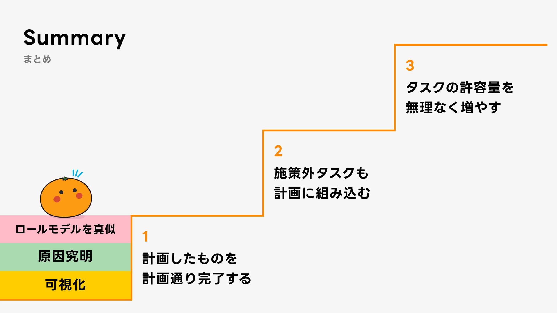 Summary まとめ 1 計画したものを 計画通り完了する 2 施策外タスクも 計画に組み込む 3 タスクの許容量を