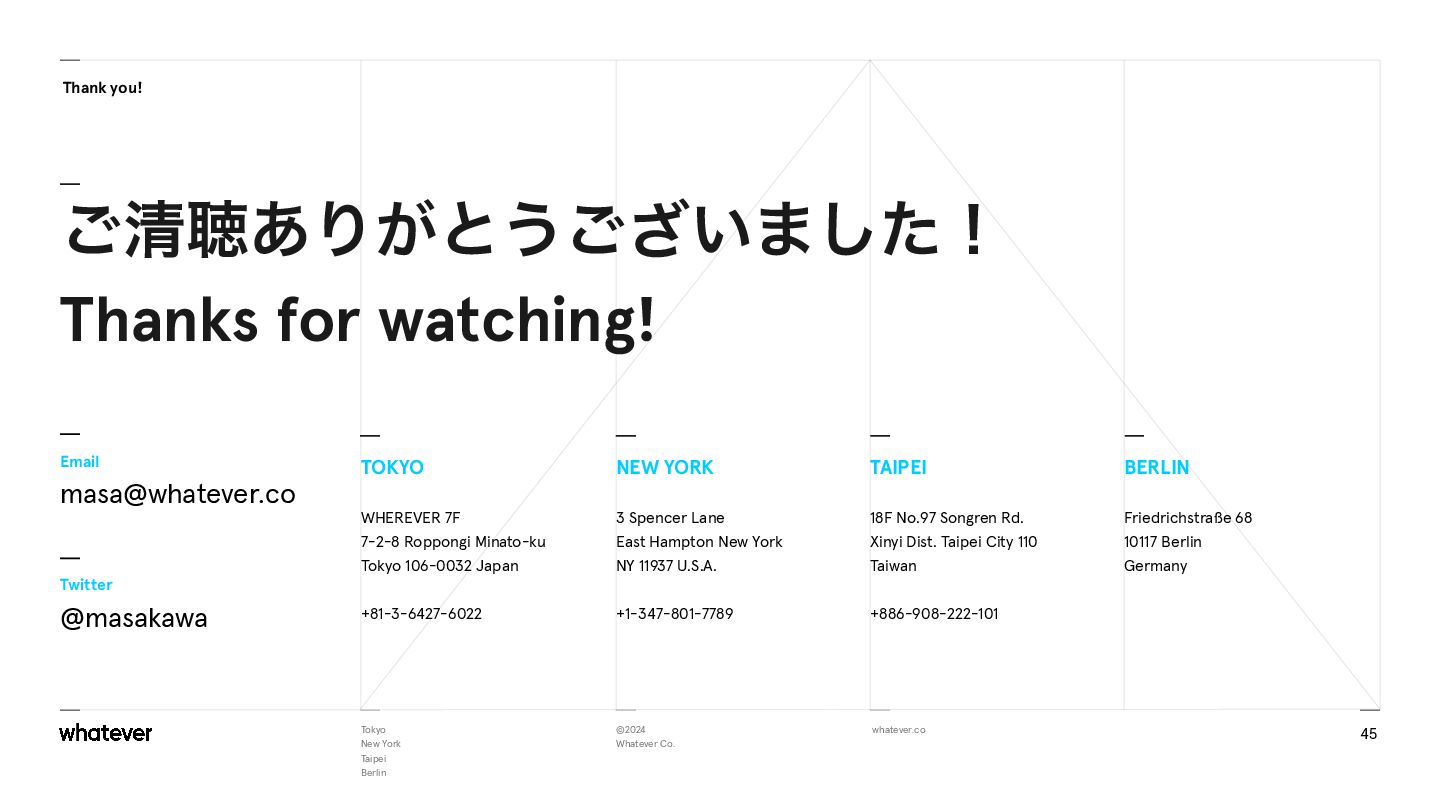 Co. Email [email protected] Twitter @masakawa ͝ਗ਼ௌ͋Γ͕ͱ͏͍͟͝·ͨ͠ʂ Thanks for watching! 45 NEW YORK 3 Spencer Lane East Hampton New York NY 11937 U.S.A. +1-347-801-7789 TOKYO WHEREVER 7F 7-2-8 Roppongi Minato-ku Tokyo 106-0032 Japan +81-3-6427-6022 BERLIN Friedrichstraße 68 10117 Berlin Germany TAIPEI 18F No.97 Songren Rd. Xinyi Dist. Taipei City 110 Taiwan +886-908-222-101