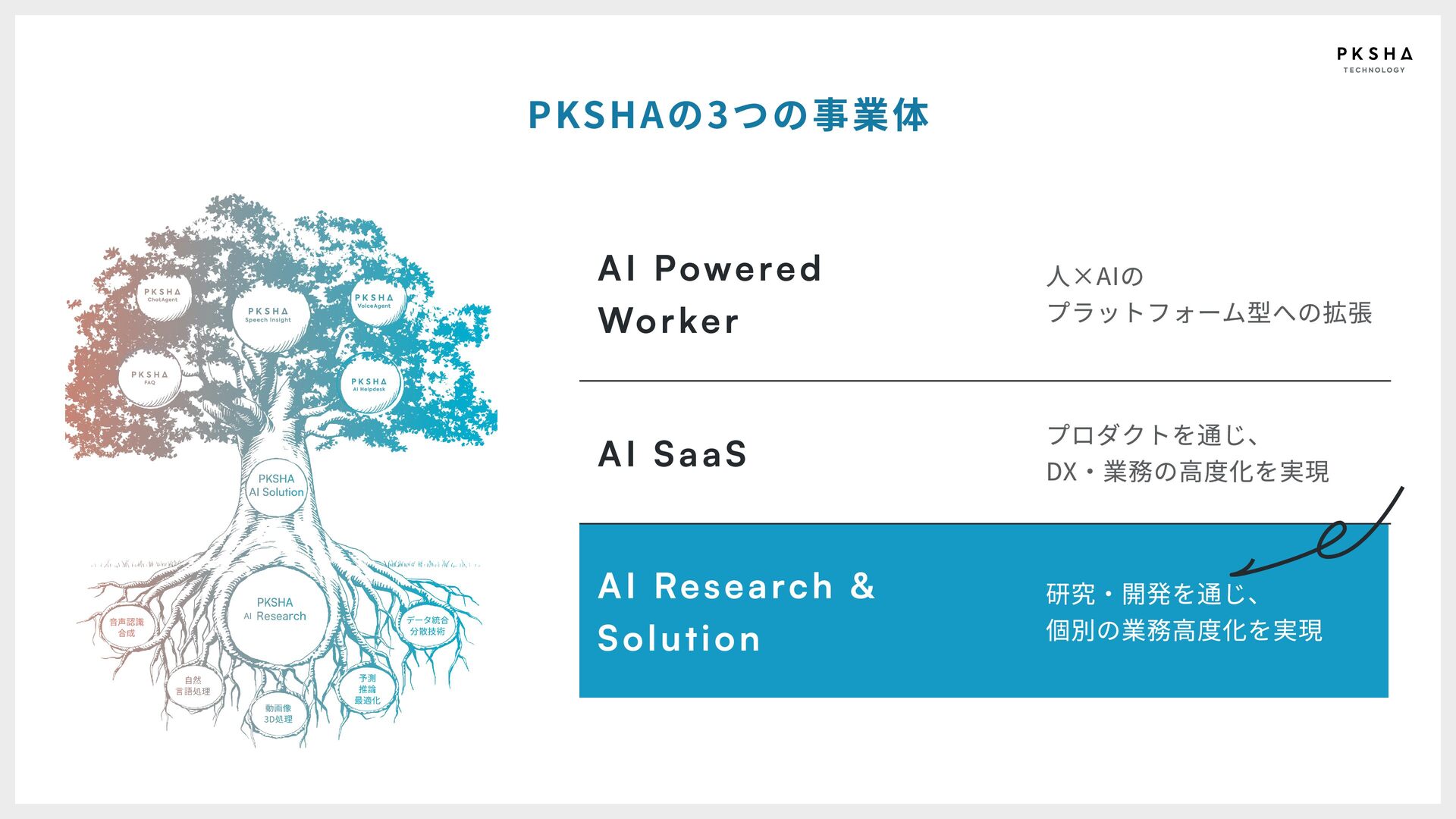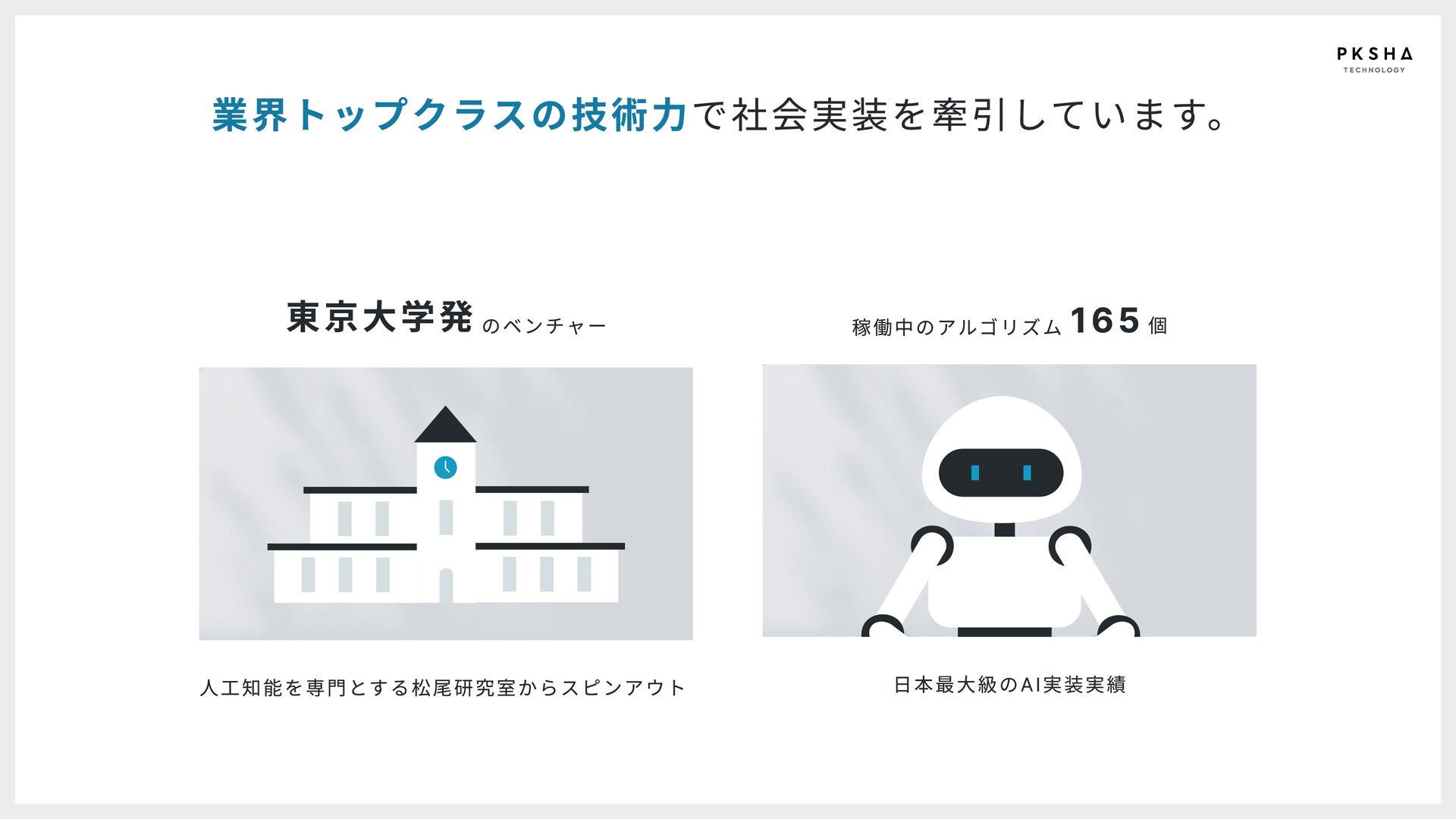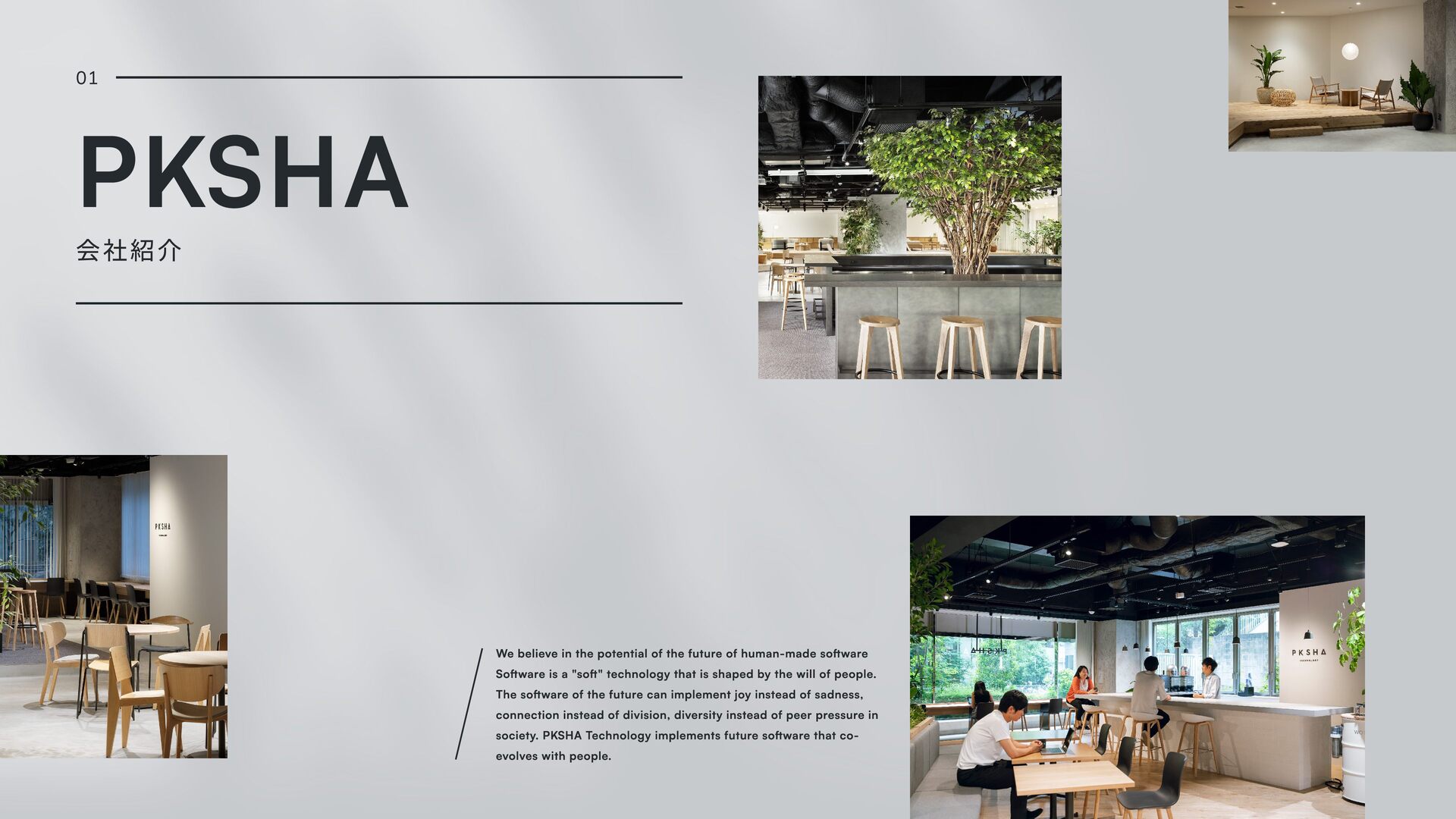 software Software is a "soft" technology that is shaped by the will of people. The software of the future can implement joy instead of sadness, connection instead of division, diversity instead of peer pressure in society. PKSHA Technology implements future software that co- evolves with people. 01 PKSHA 会社紹介