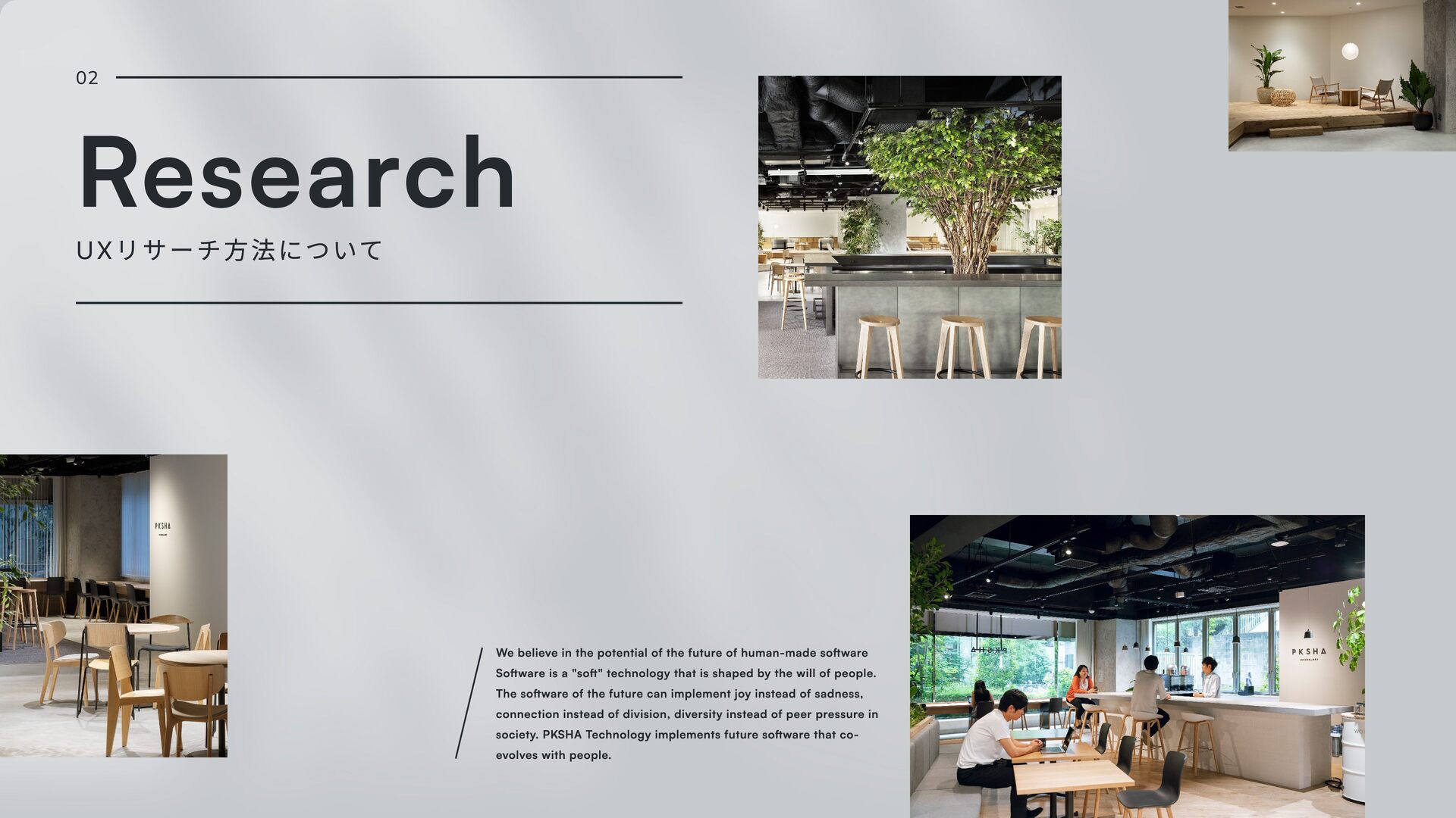 software Software is a "soft" technology that is shaped by the will of people. The software of the future can implement joy instead of sadness, connection instead of division, diversity instead of peer pressure in society. PKSHA Technology implements future software that co- evolves with people. 02 Research UXリサーチ方法について