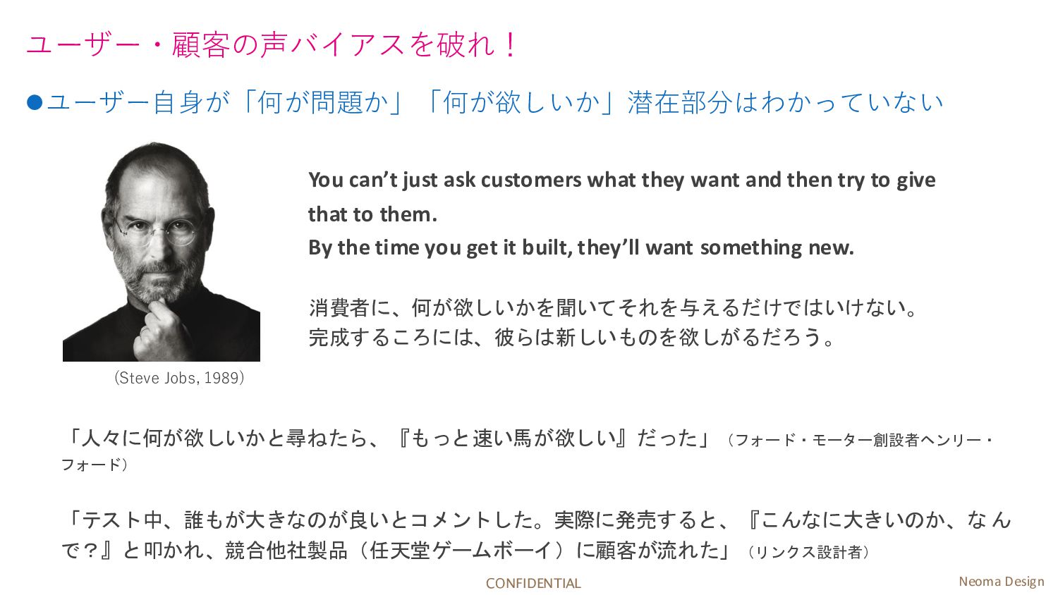 You can’t just ask customers what they want and then try to give that to them. By the time you get it built, they’ll want something new. 消費者に、何が欲しいかを聞いてそれを与えるだけではいけない。 完成するころには、彼らは新しいものを欲しがるだろう。 (Steve Jobs, 1989)