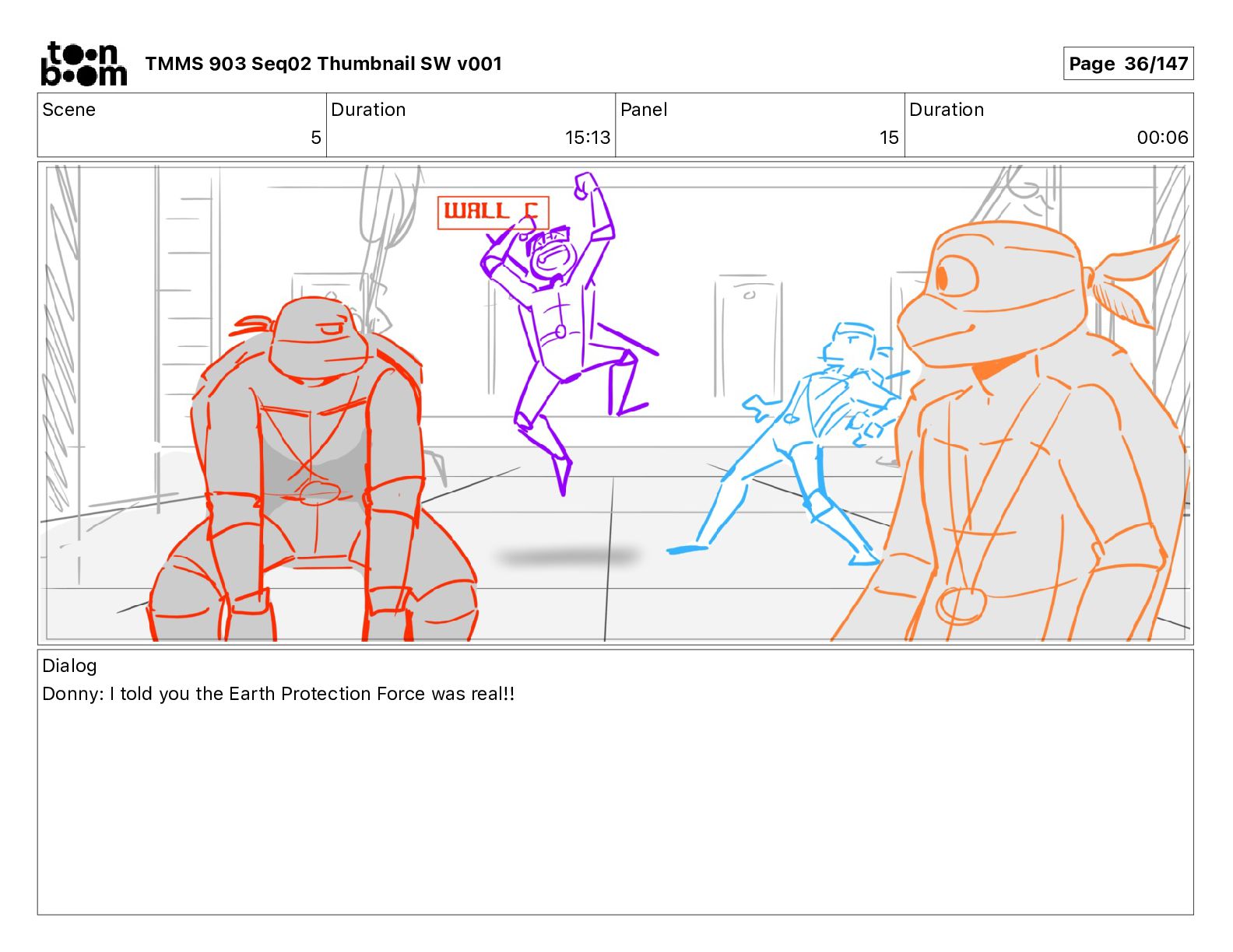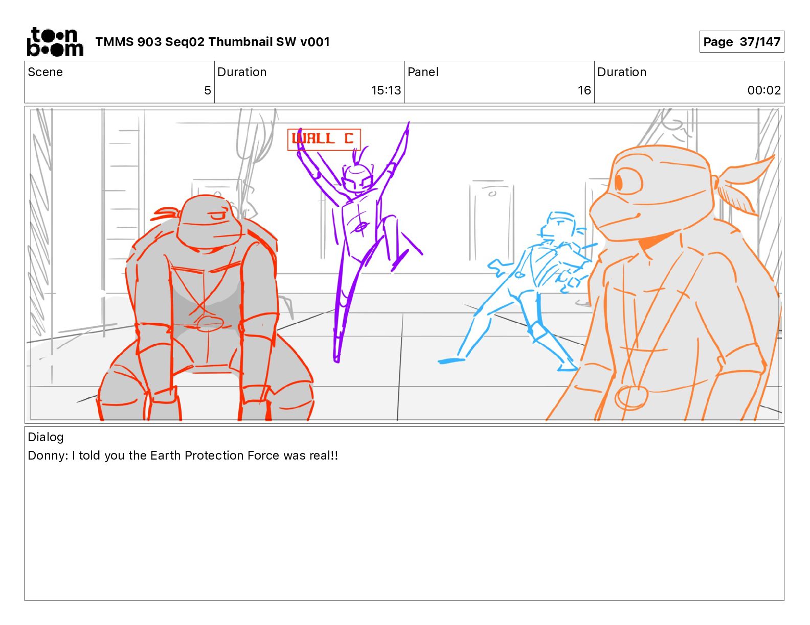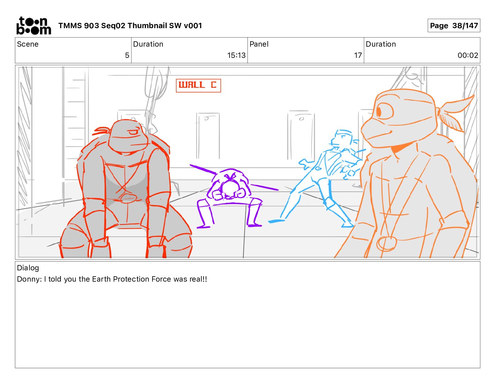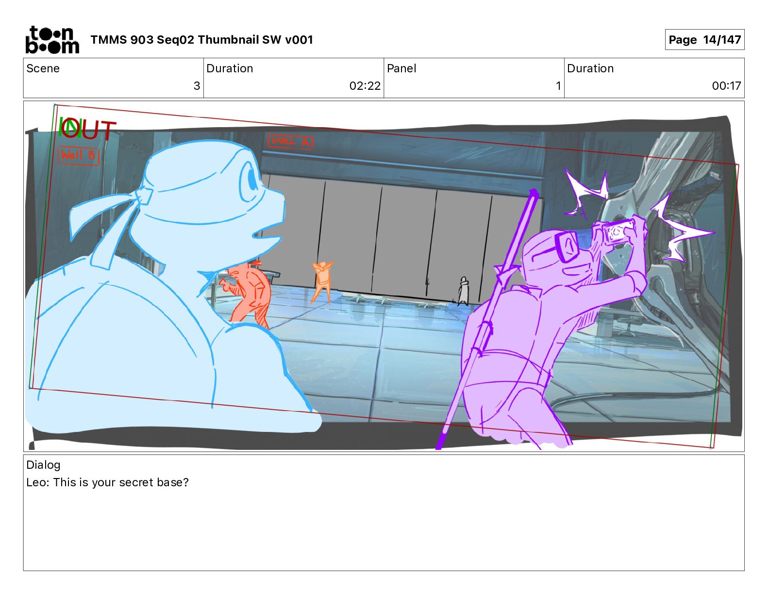 Dialog Mikey: It's not that secret, I found it on the internet. There's a giant hundred foot tall robot right behind that wall. TMMS 903 Seq02 Thumbnail SW v001 Page 17/147
