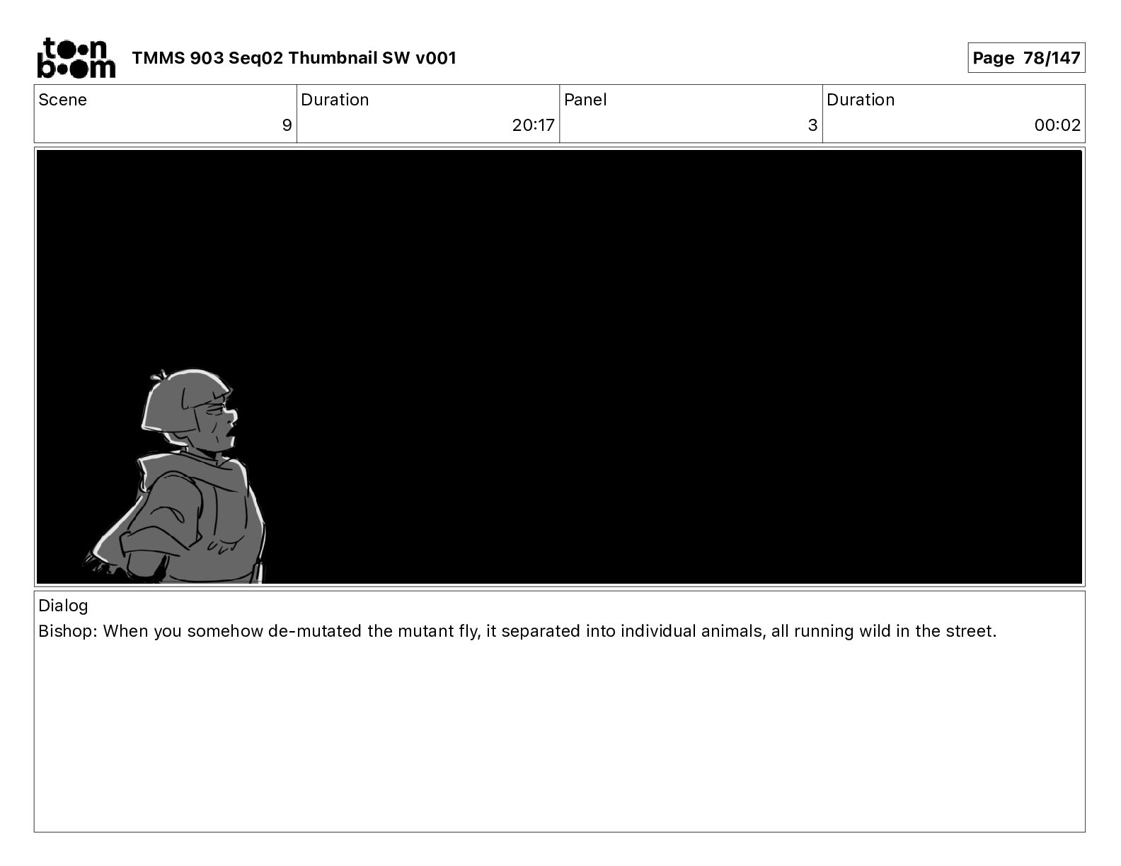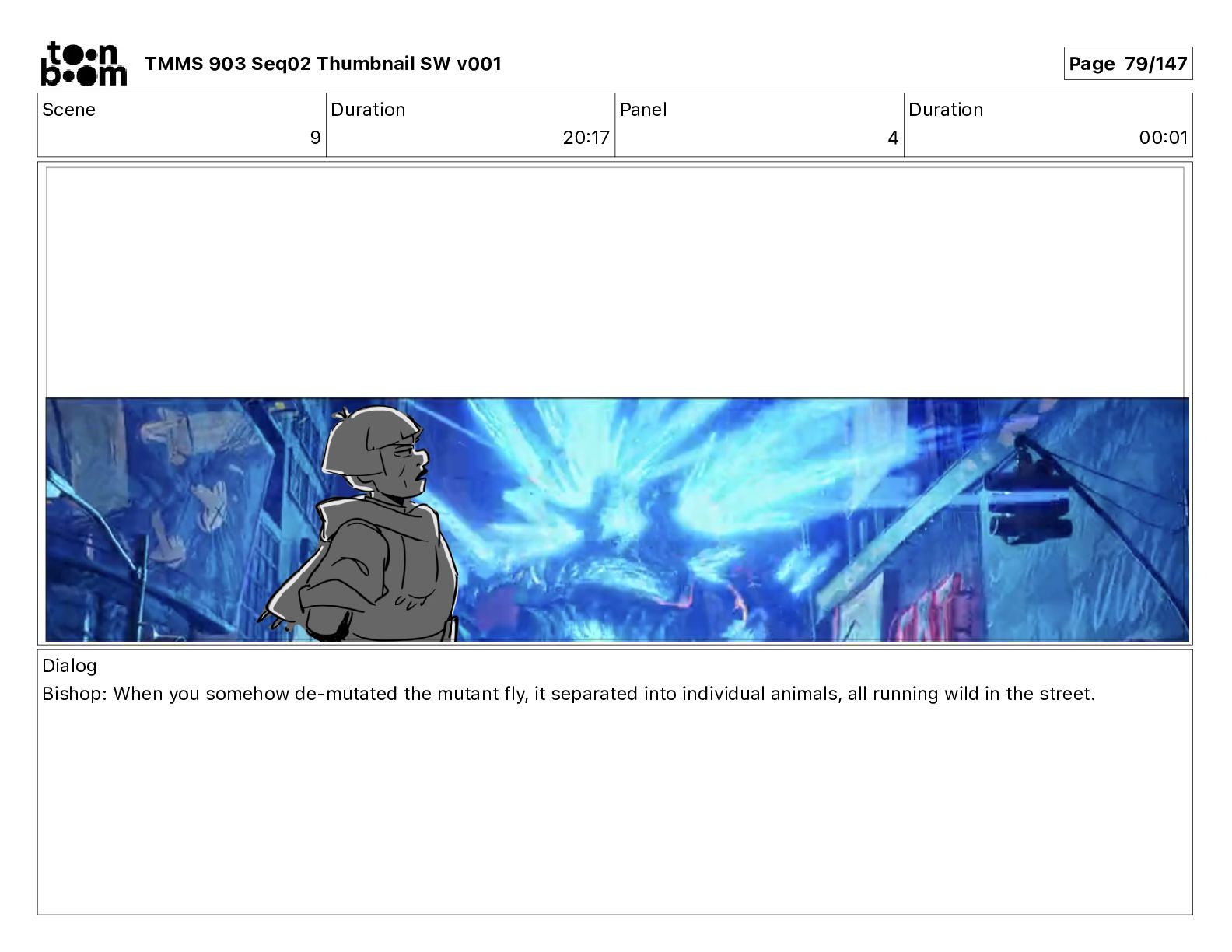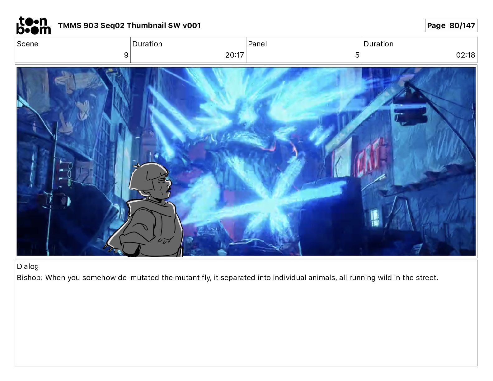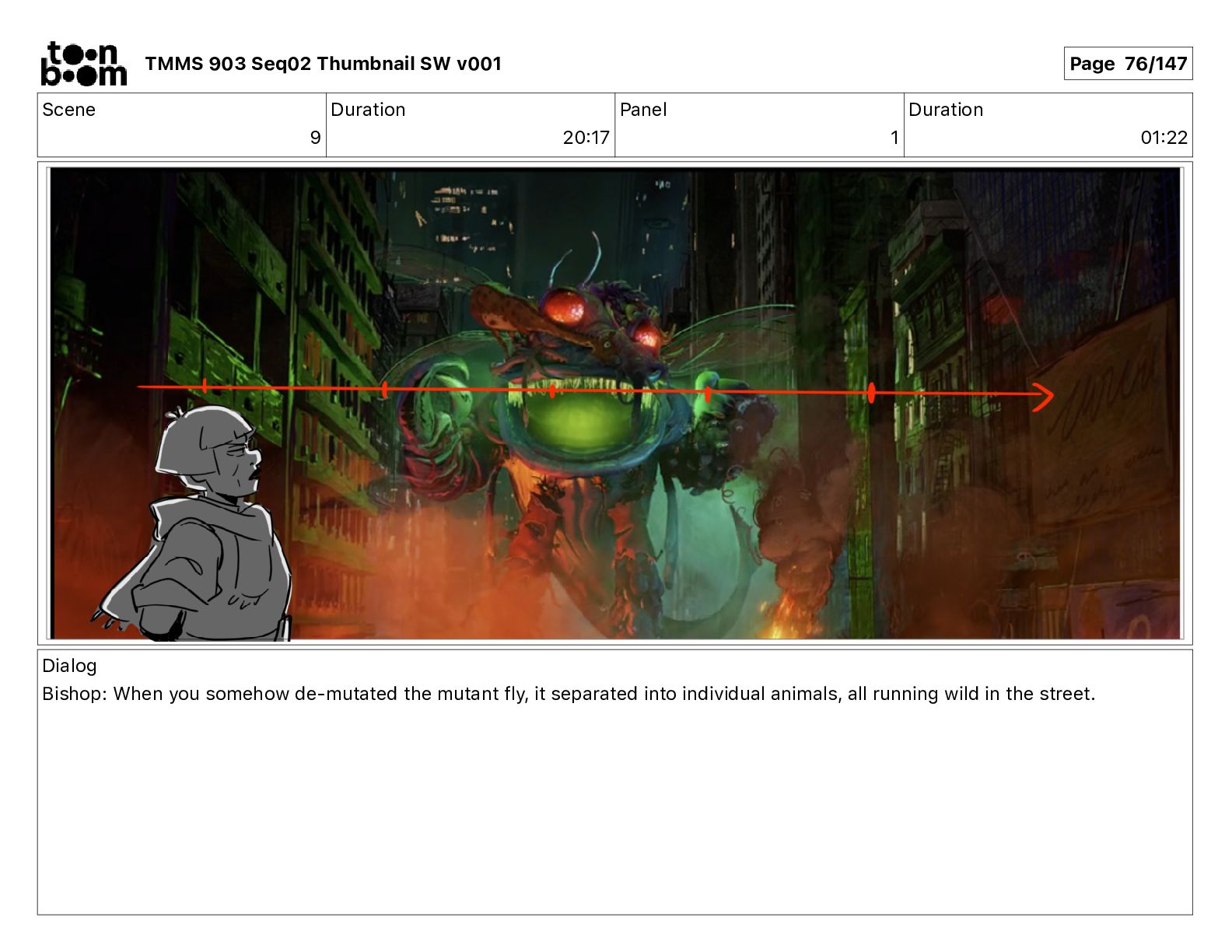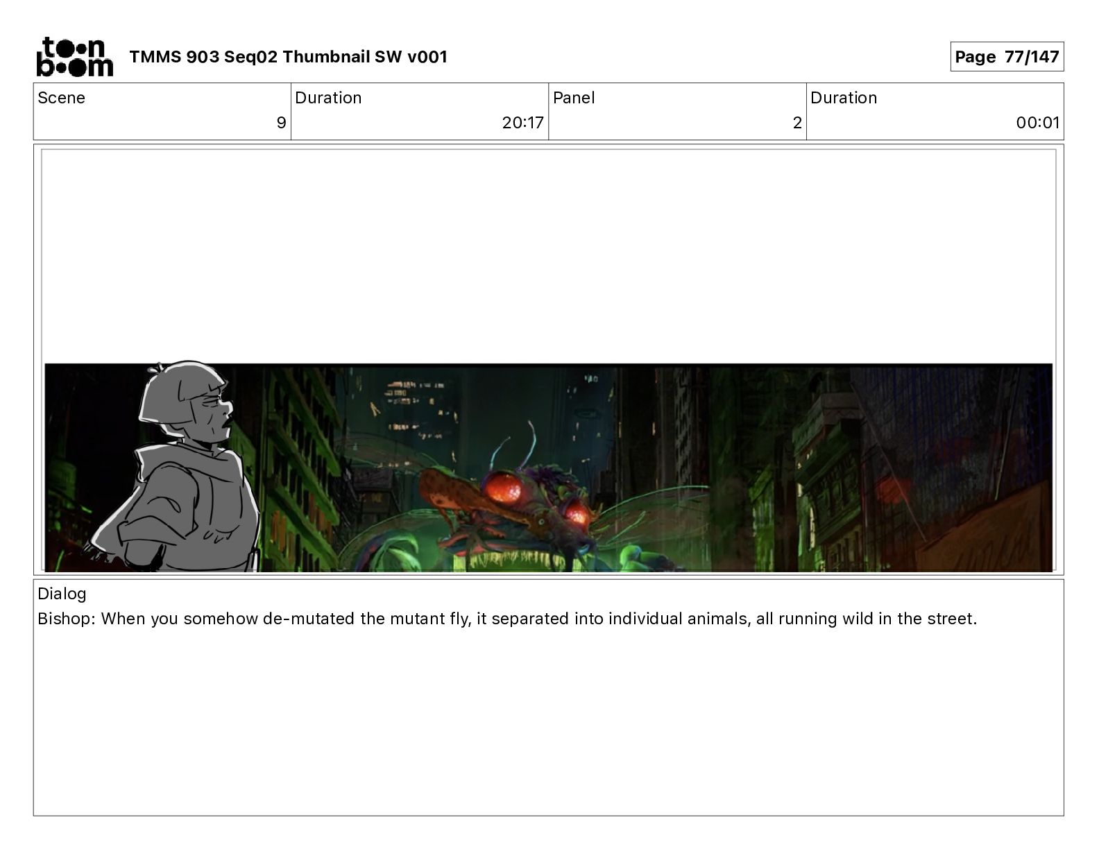 Dialog Bishop: When you somehow de-mutated the mutant fly, it separated into individual animals, all running wild in the street. TMMS 903 Seq02 Thumbnail SW v001 Page 81/147