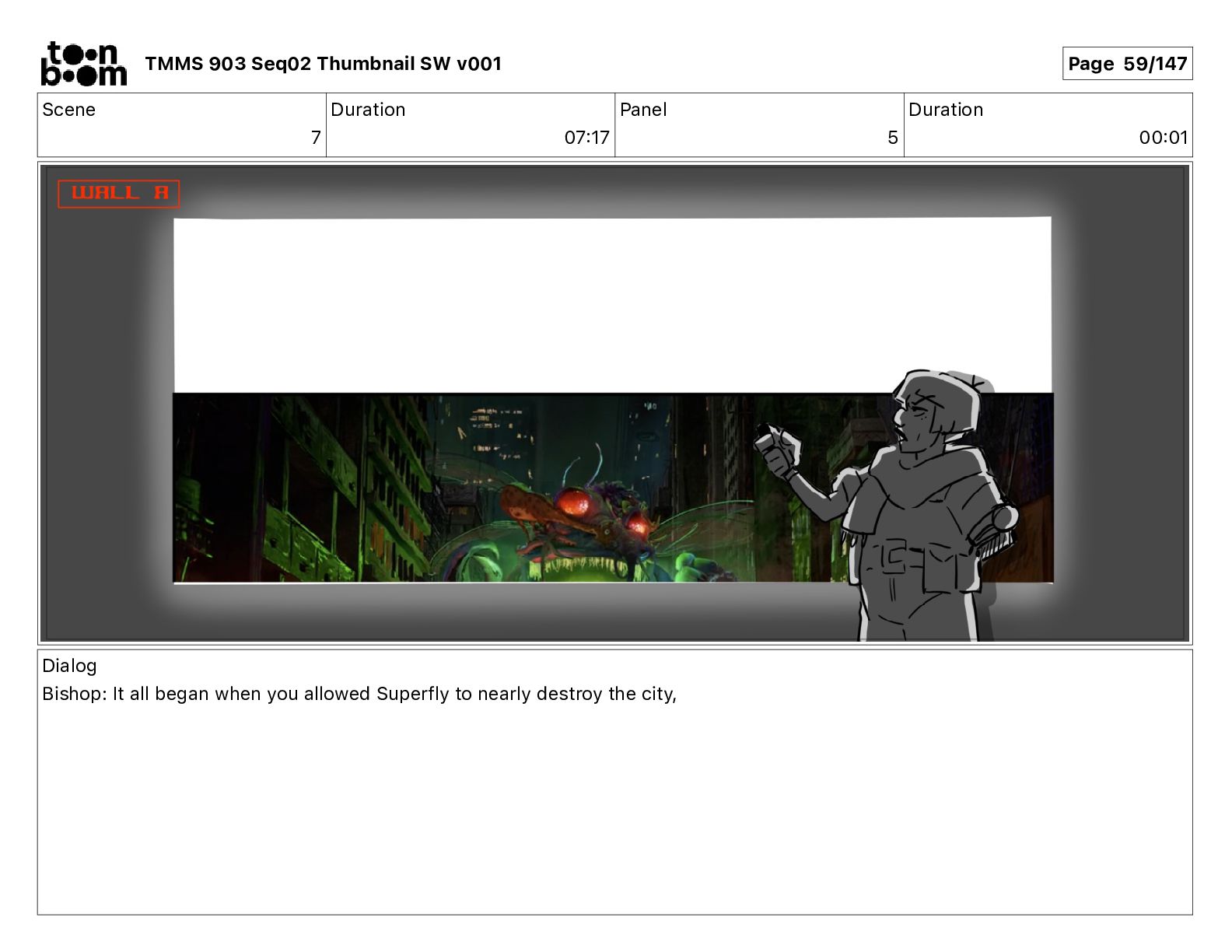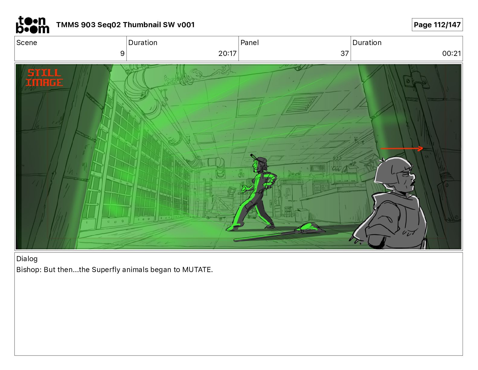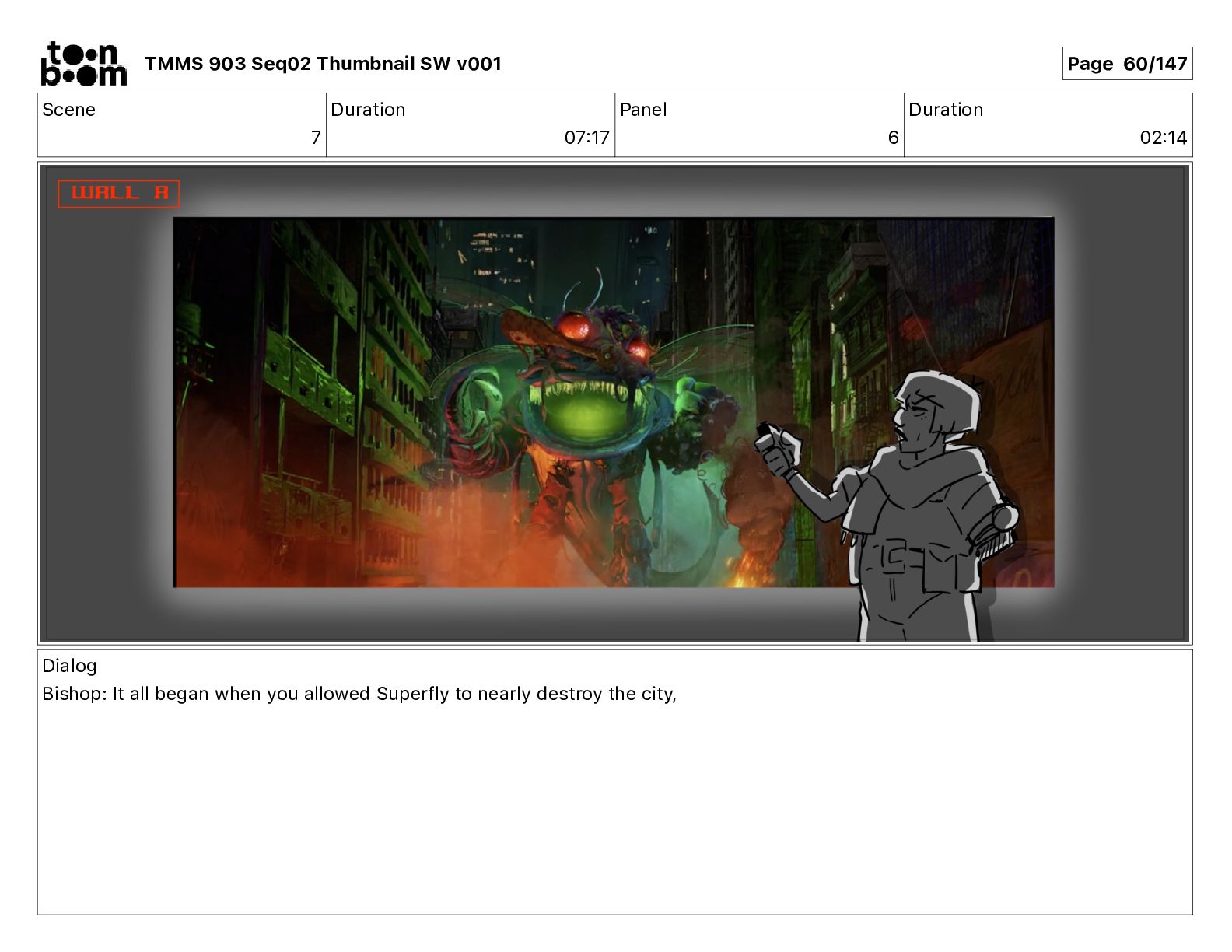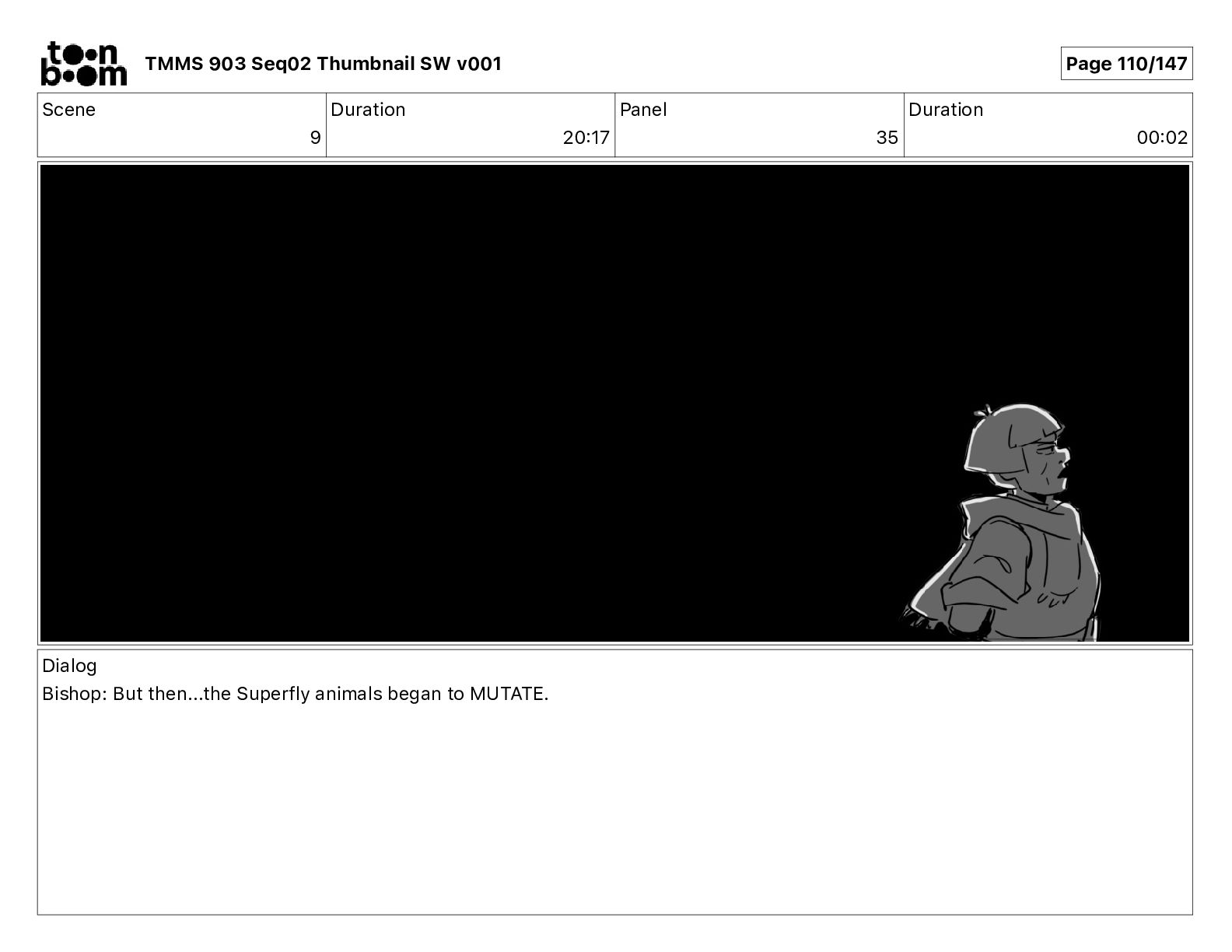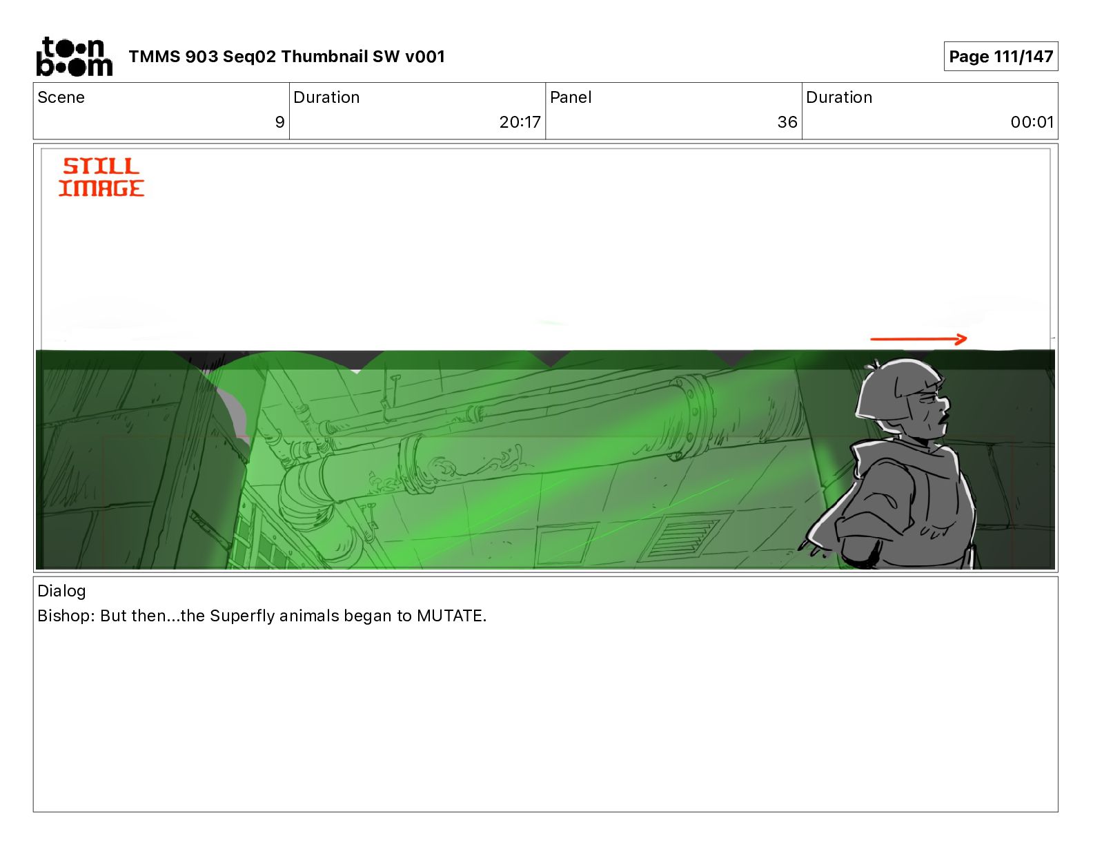 Dialog Bishop: When you somehow de-mutated the mutant fly, it separated into individual animals, all running wild in the street. TMMS 903 Seq02 Thumbnail SW v001 Page 81/147
