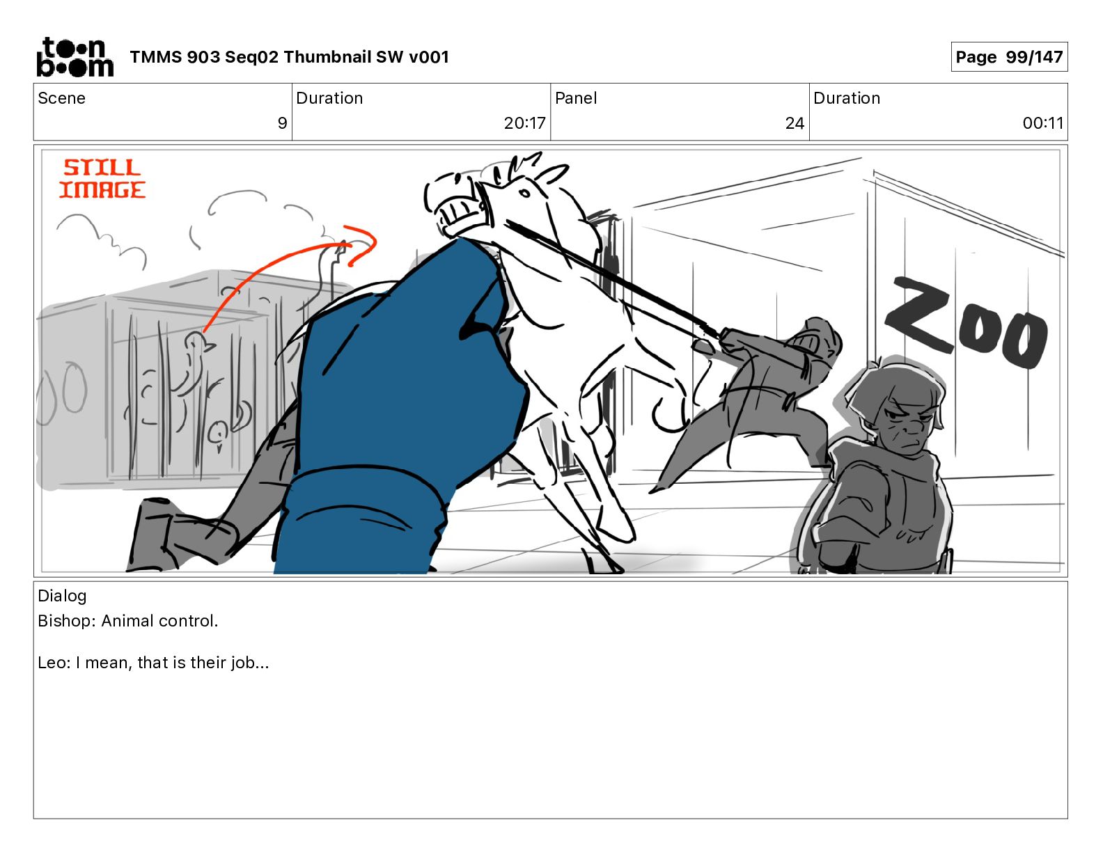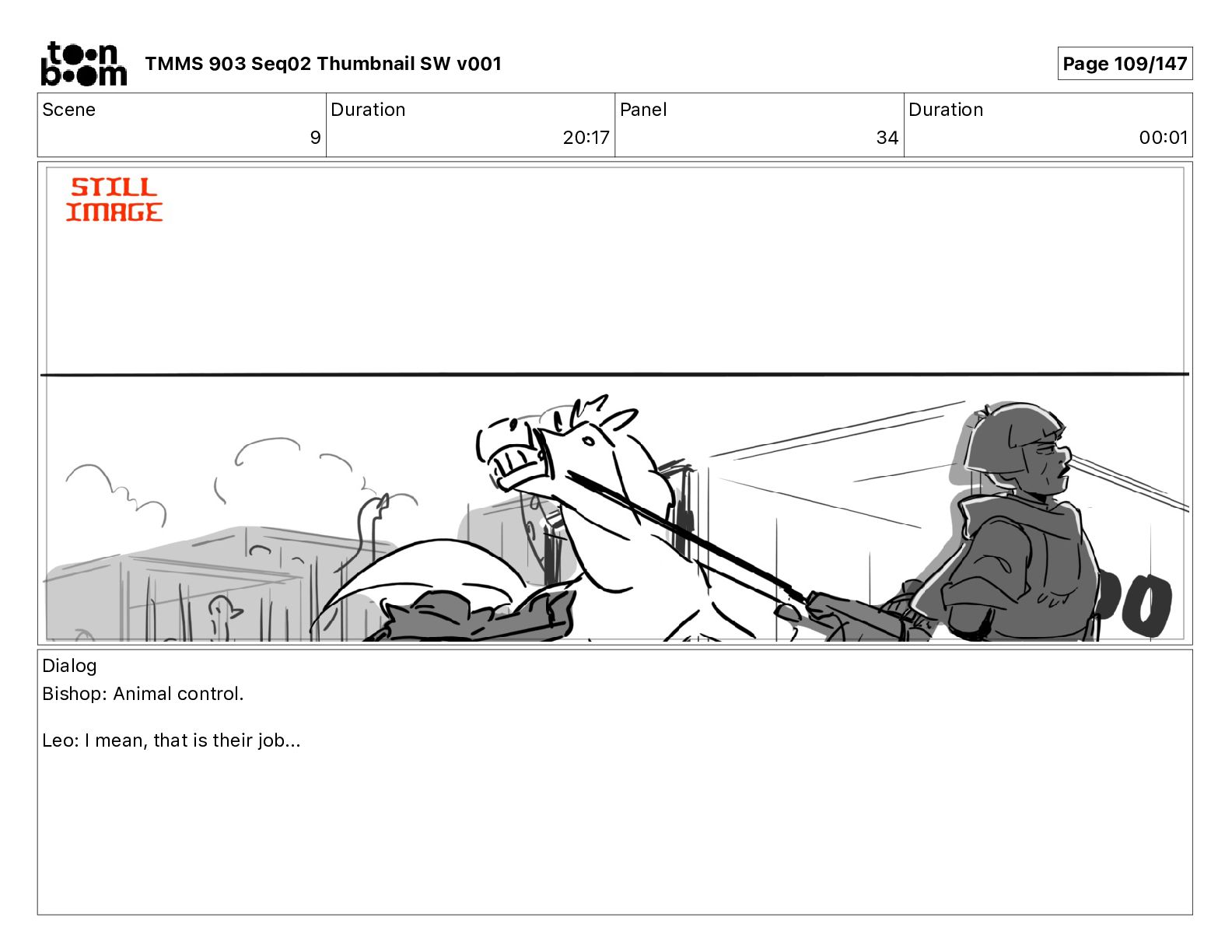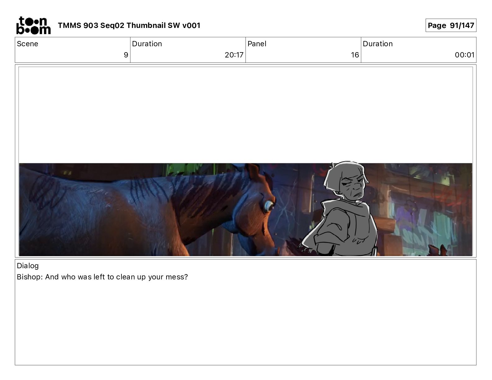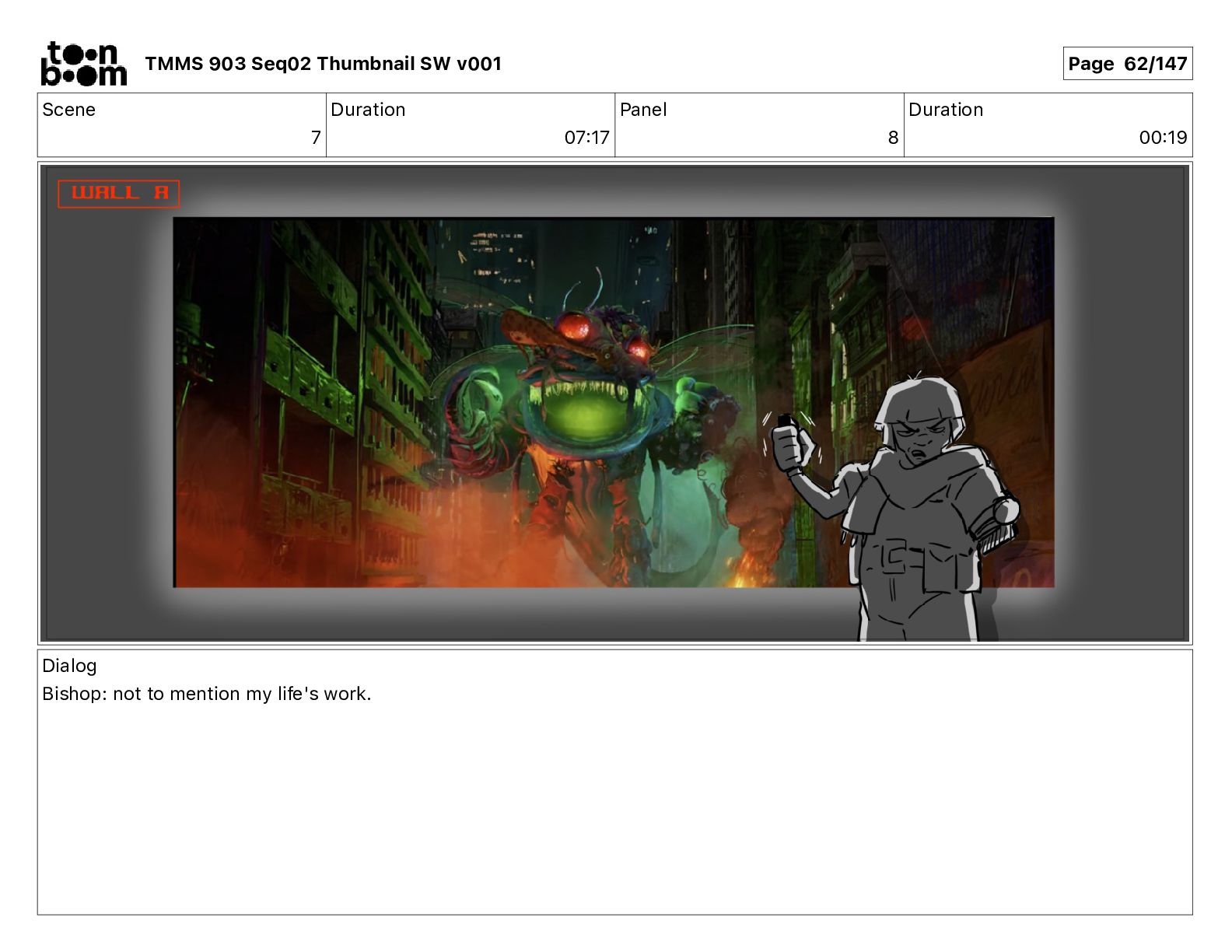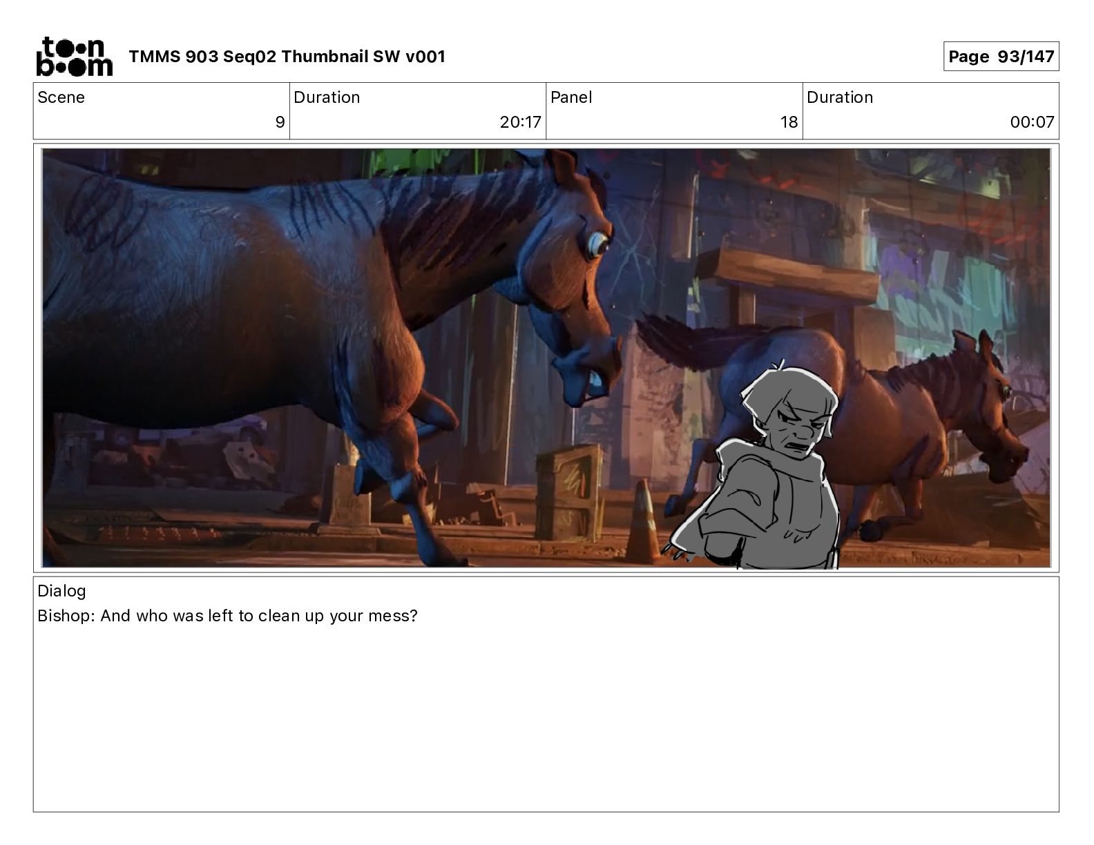 Dialog Bishop: When you somehow de-mutated the mutant fly, it separated into individual animals, all running wild in the street. TMMS 903 Seq02 Thumbnail SW v001 Page 81/147