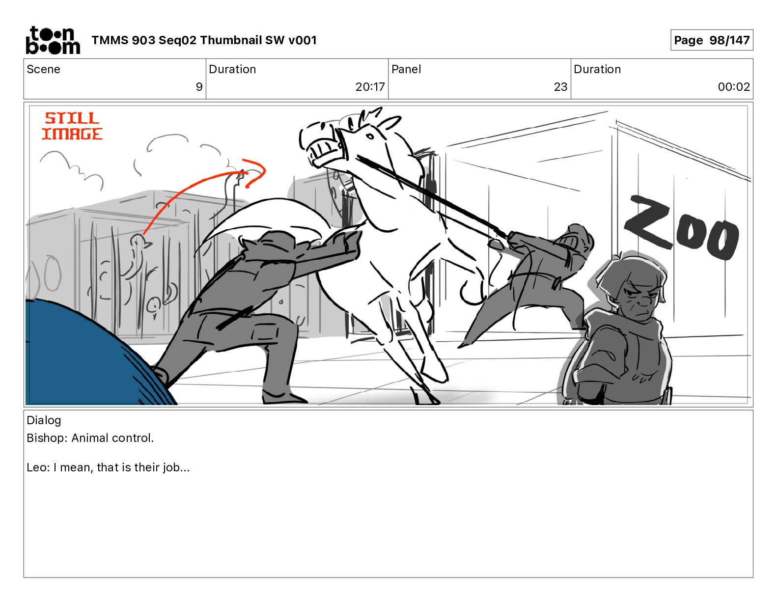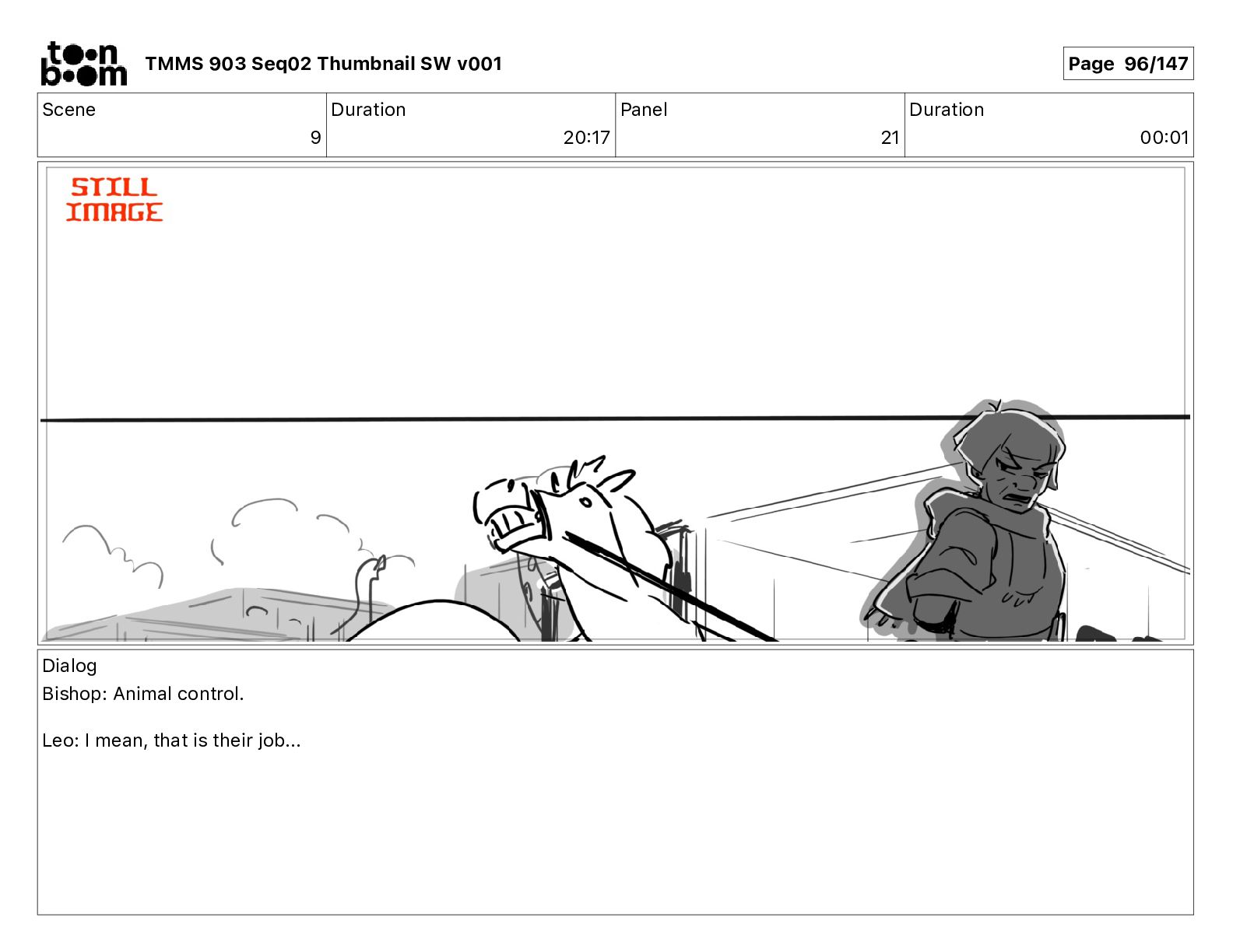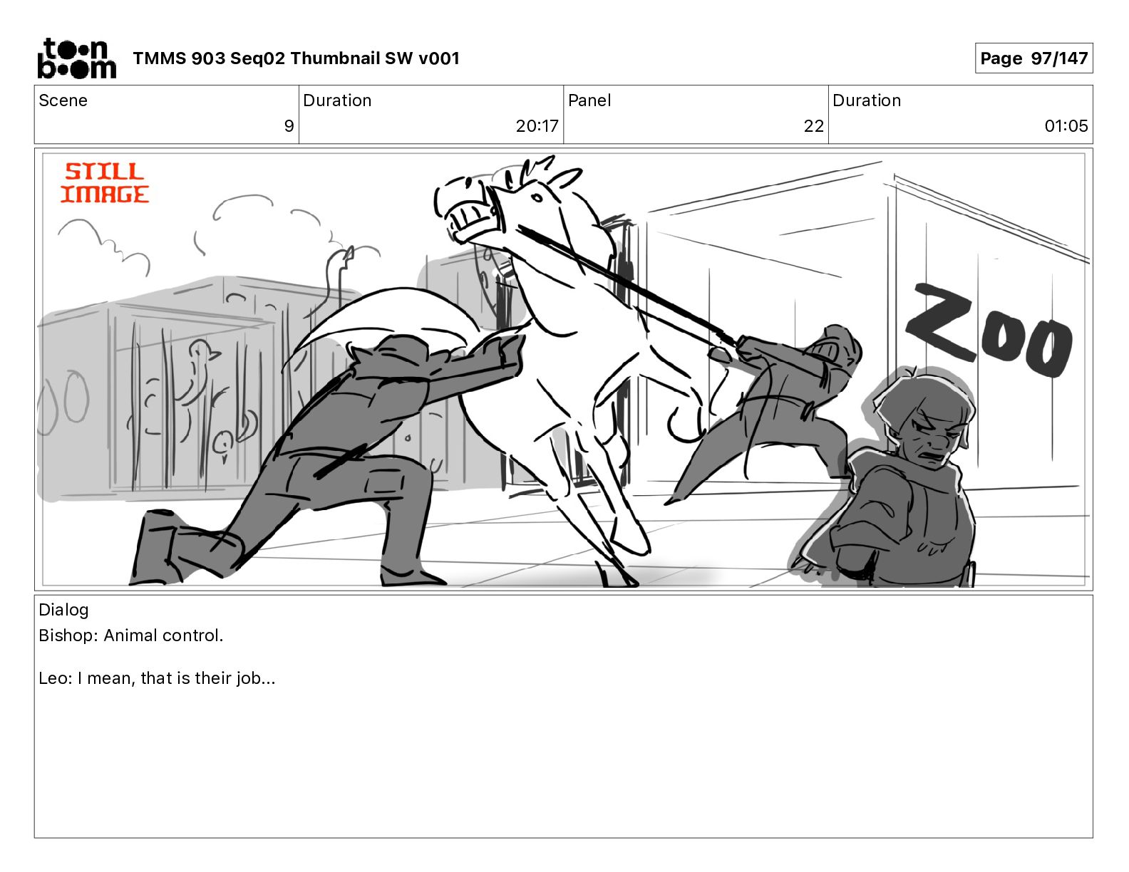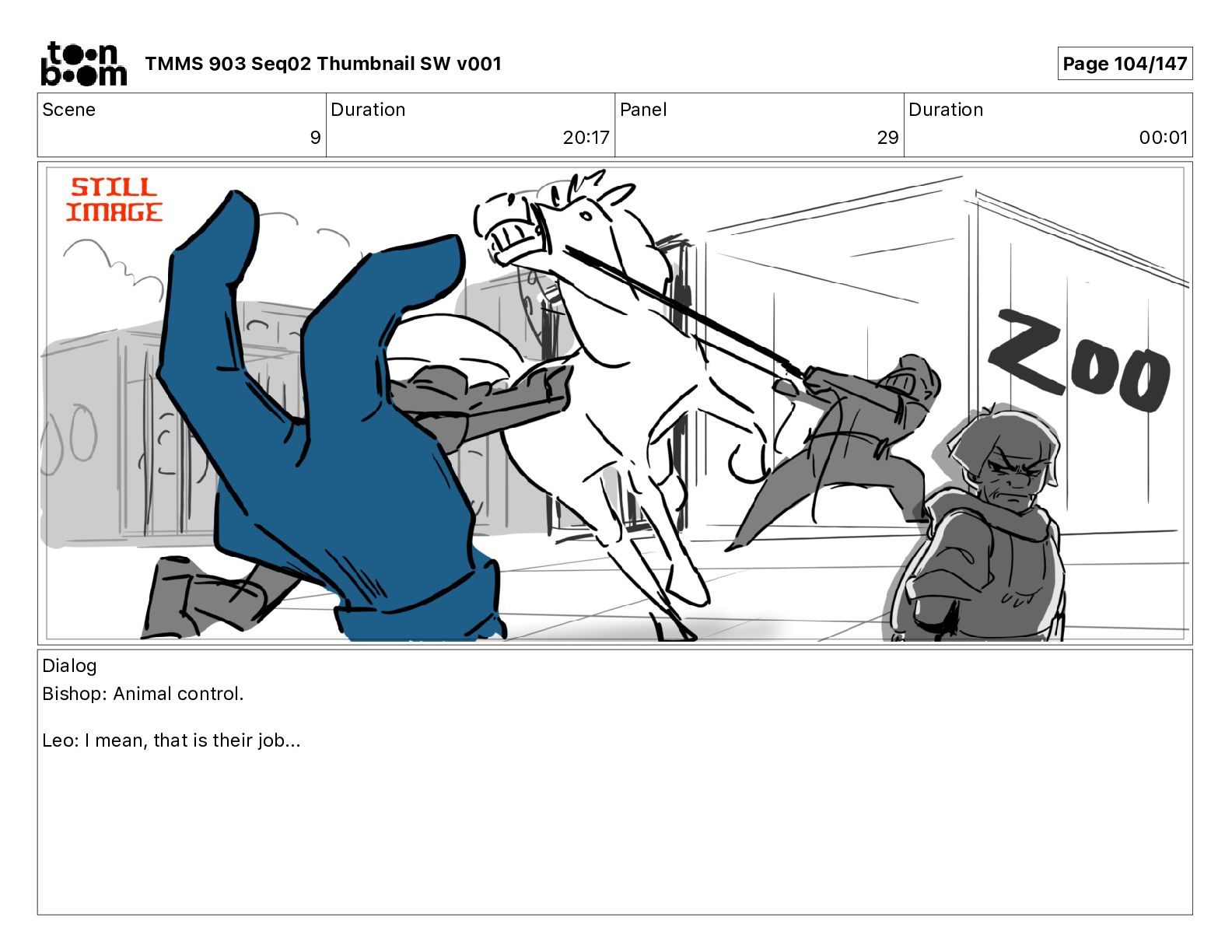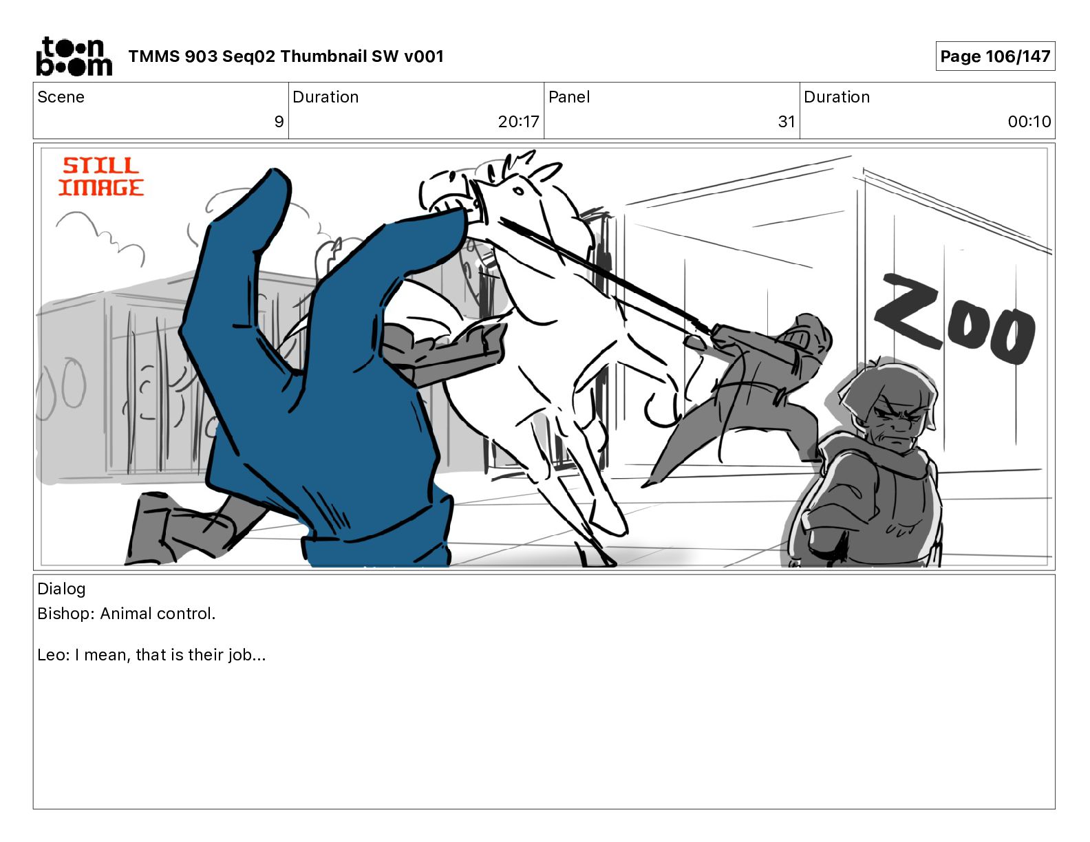 Dialog Bishop: When you somehow de-mutated the mutant fly, it separated into individual animals, all running wild in the street. TMMS 903 Seq02 Thumbnail SW v001 Page 81/147