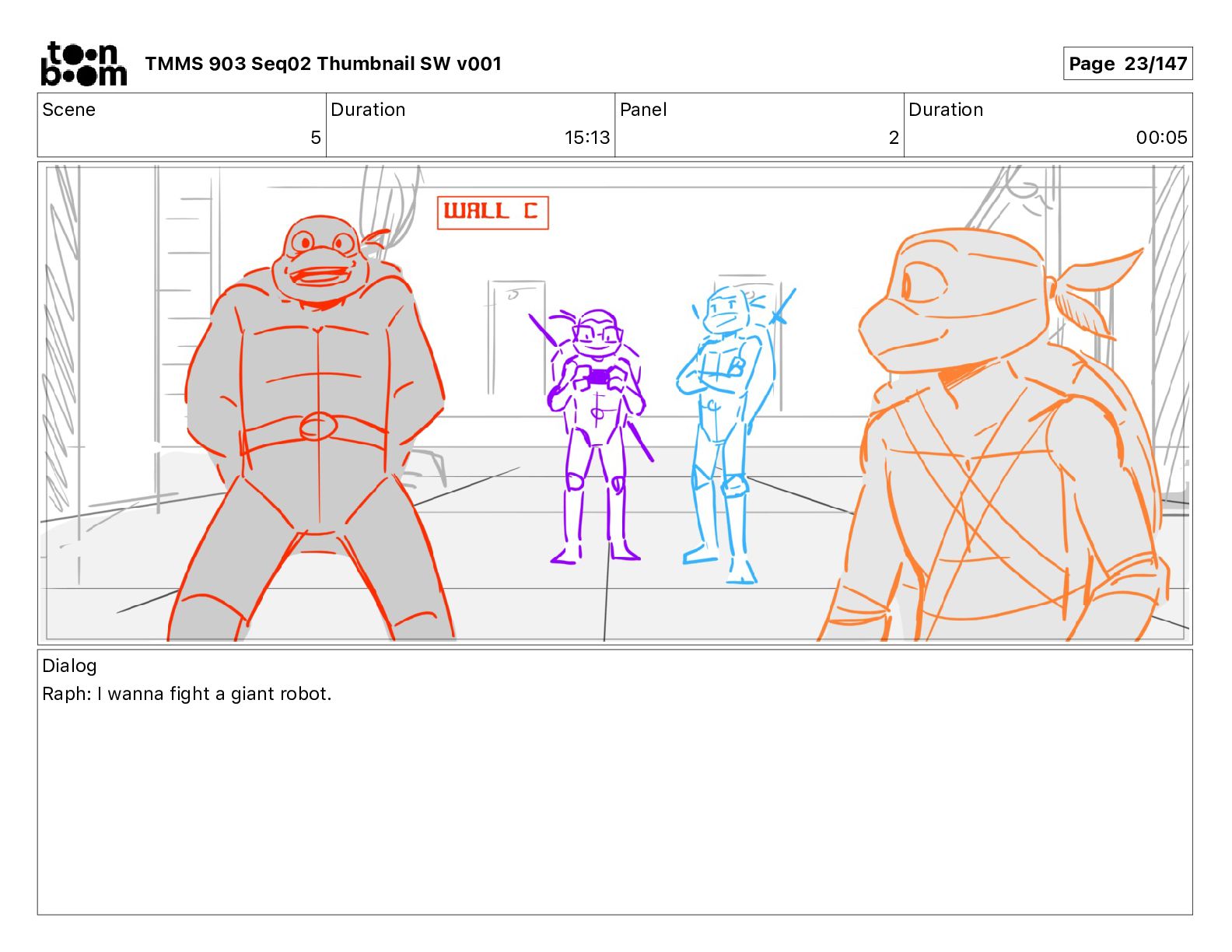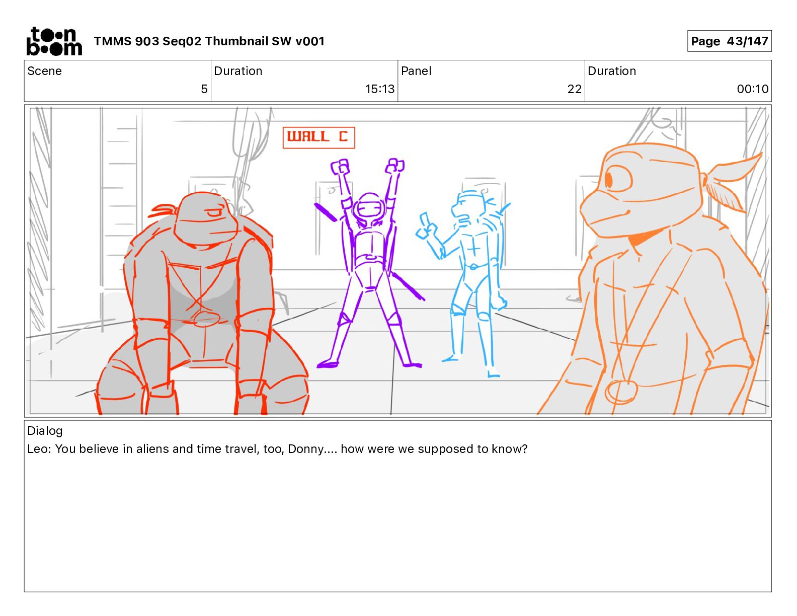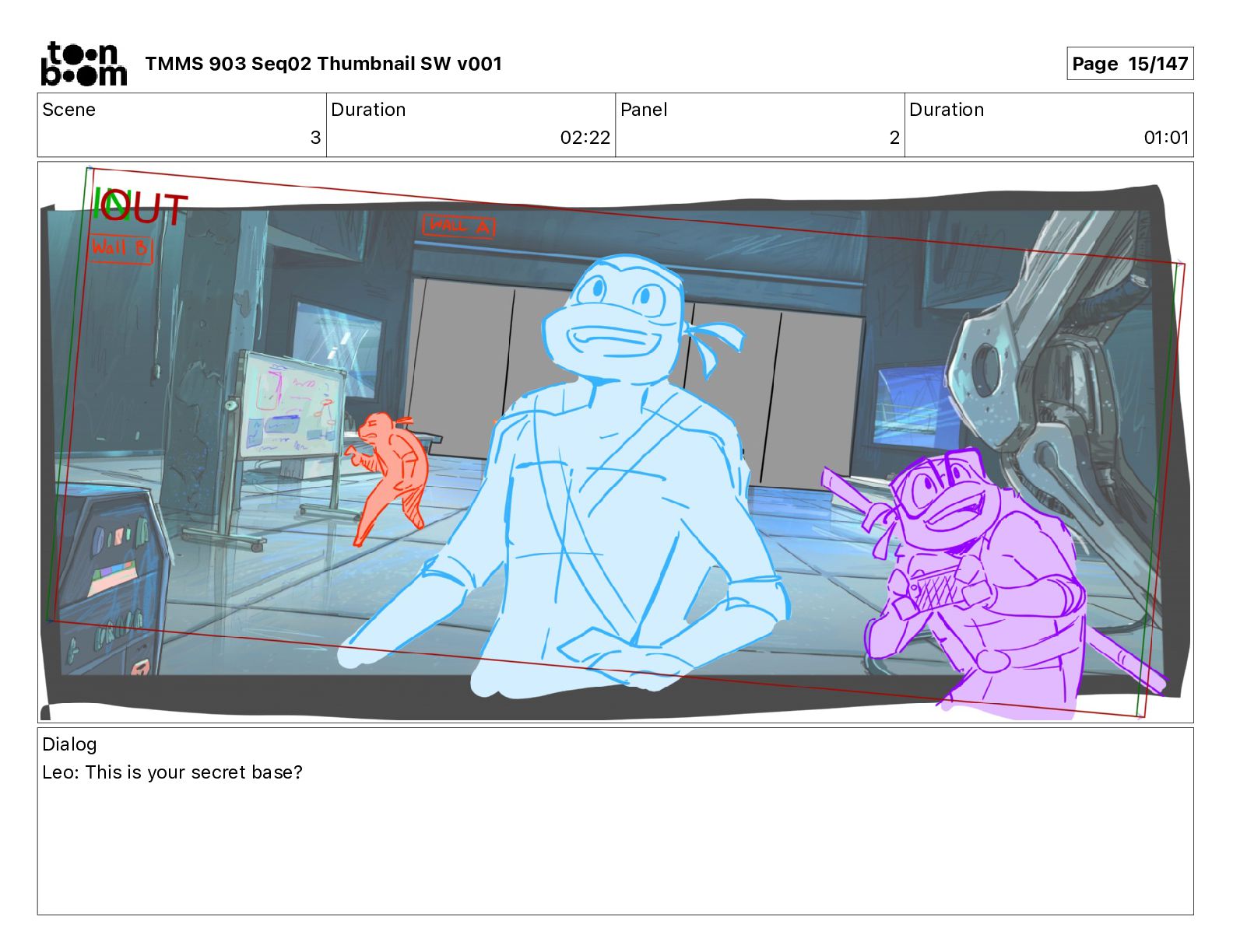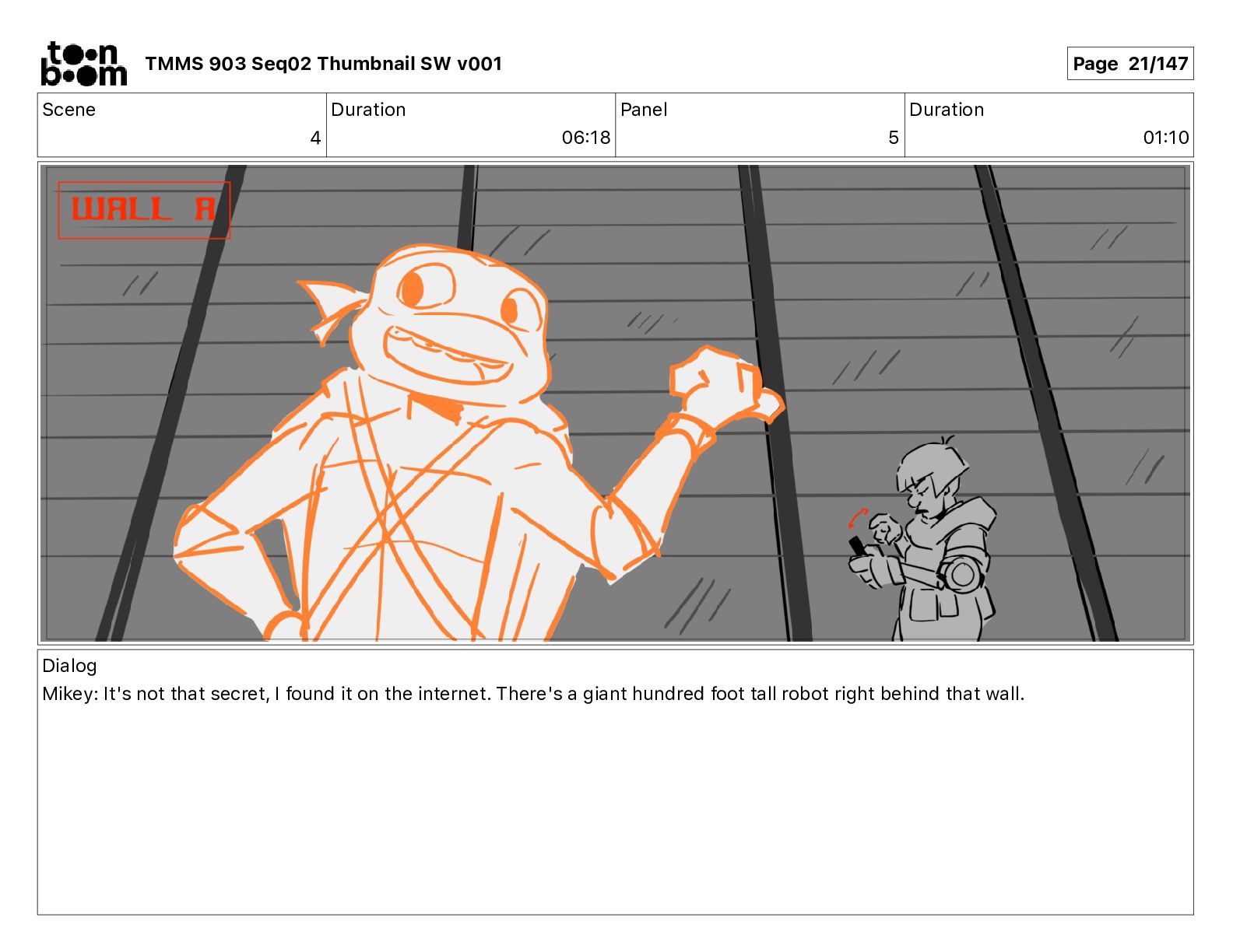 Dialog Mikey: It's not that secret, I found it on the internet. There's a giant hundred foot tall robot right behind that wall. TMMS 903 Seq02 Thumbnail SW v001 Page 21/147