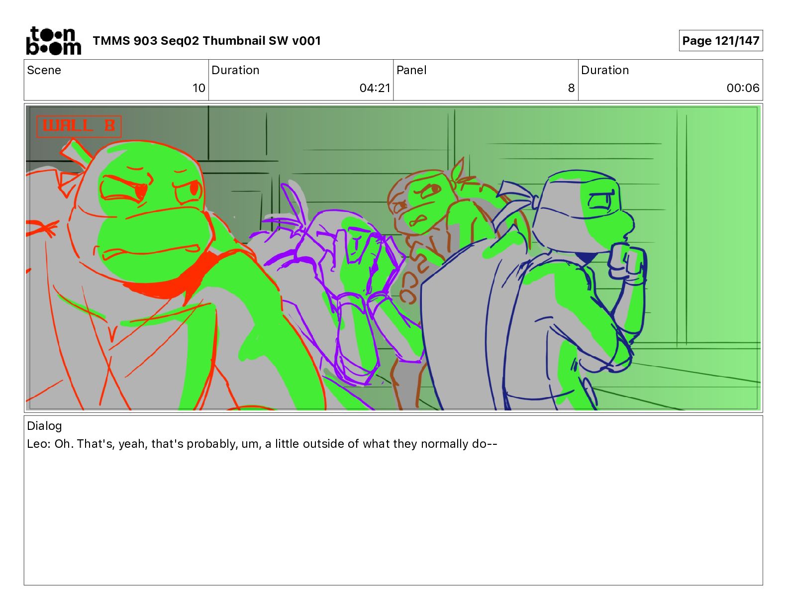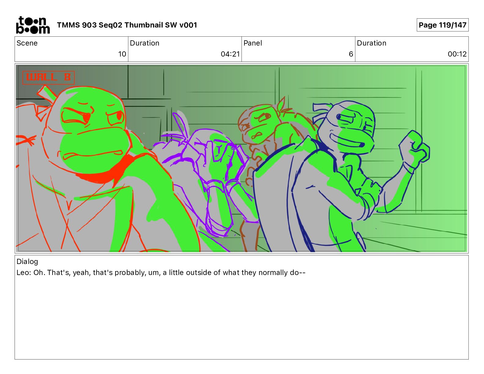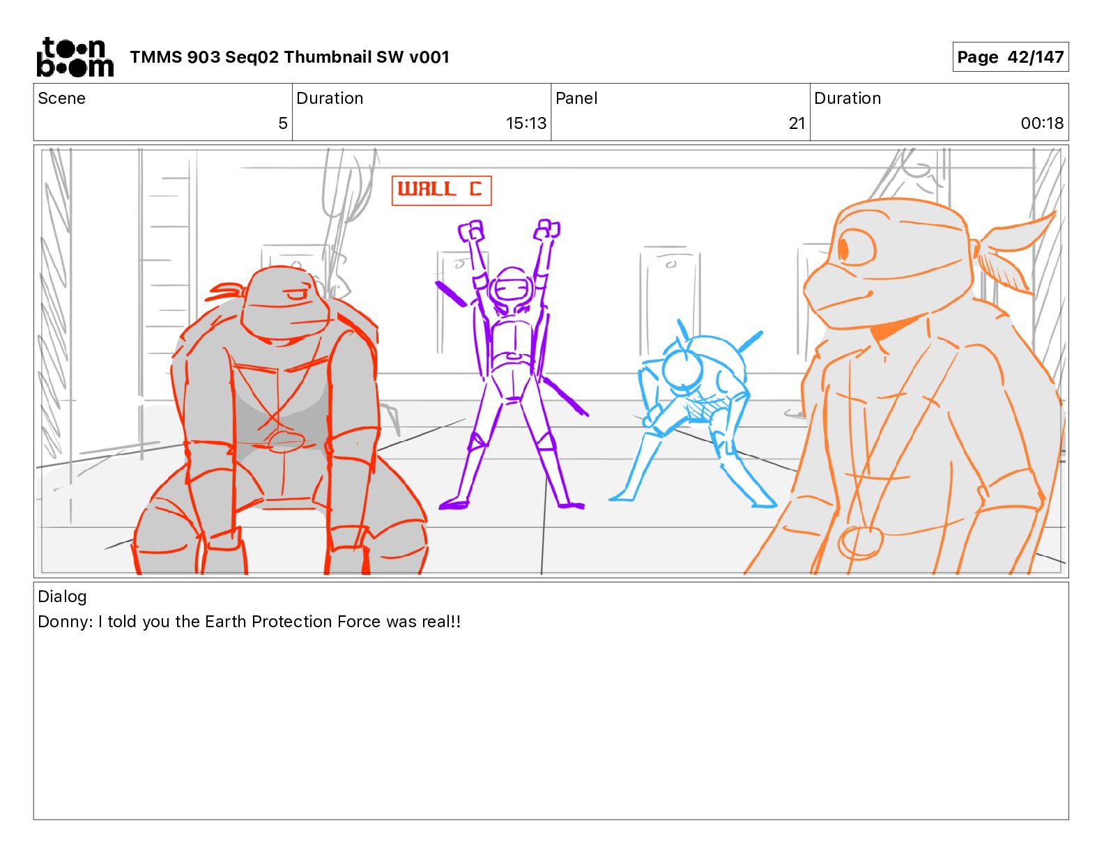 Dialog Mikey: It's not that secret, I found it on the internet. There's a giant hundred foot tall robot right behind that wall. TMMS 903 Seq02 Thumbnail SW v001 Page 21/147