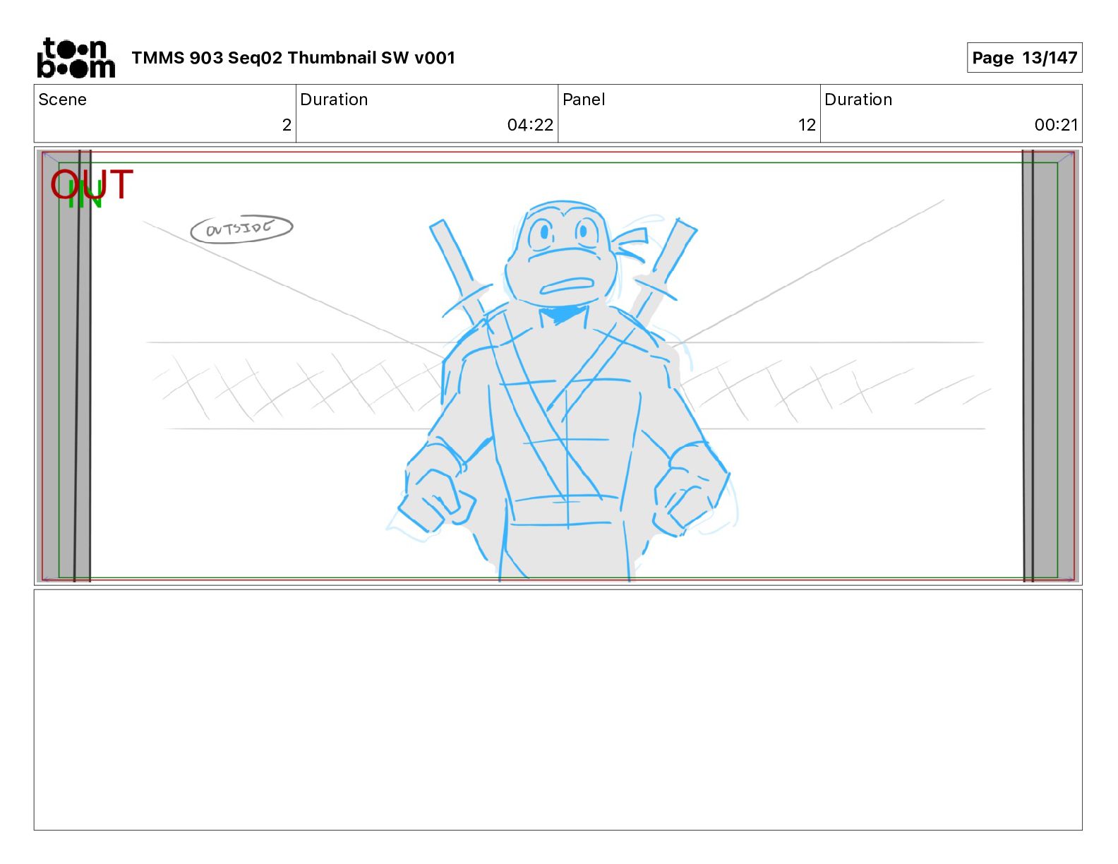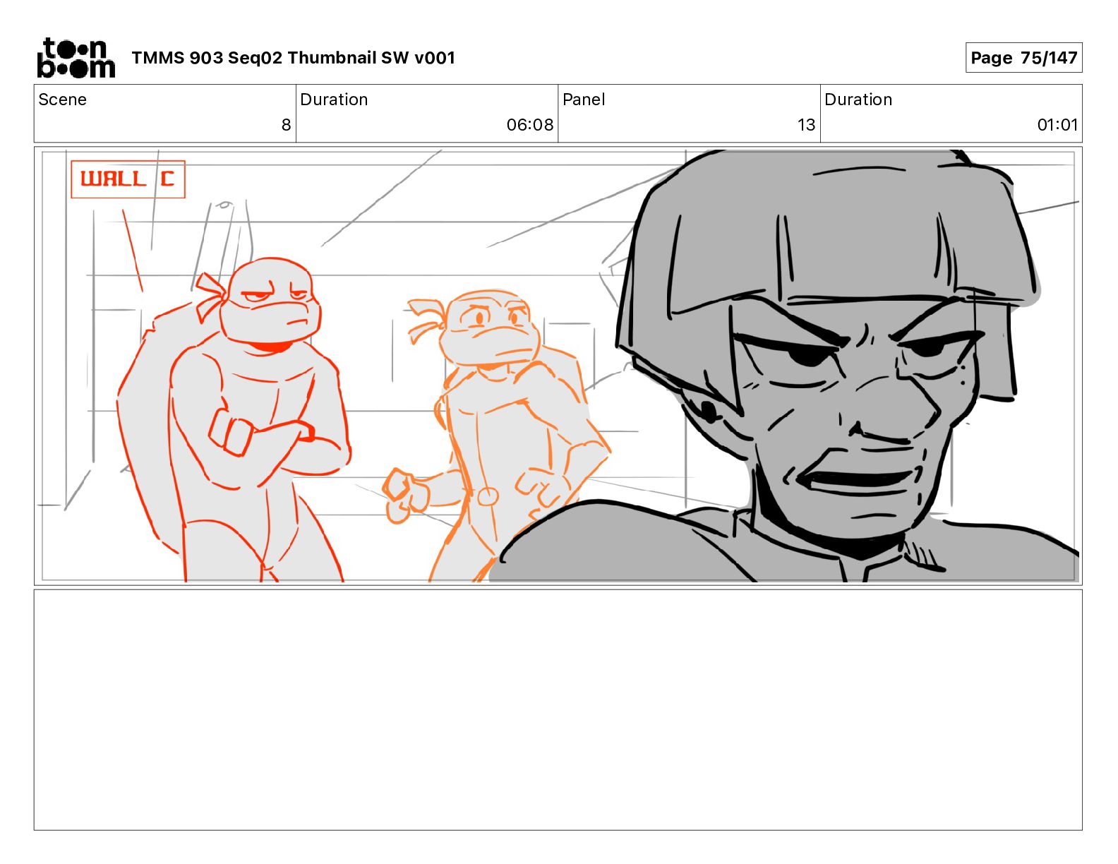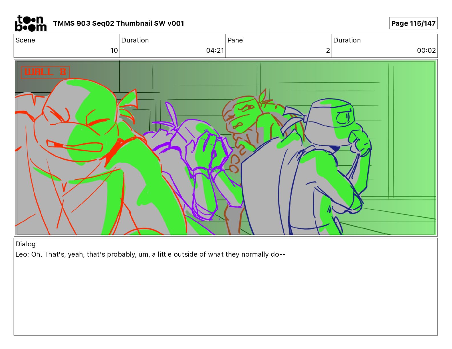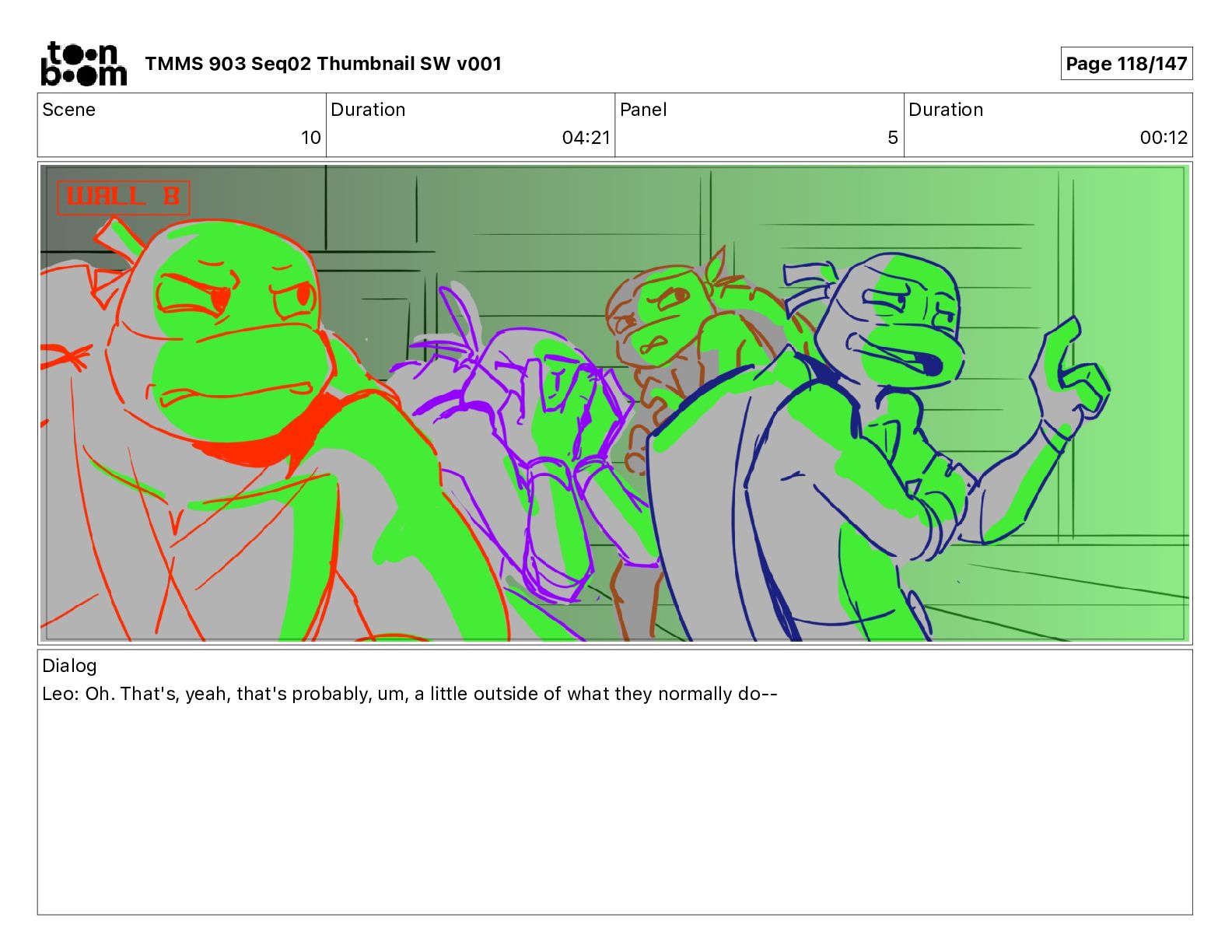 Dialog Mikey: It's not that secret, I found it on the internet. There's a giant hundred foot tall robot right behind that wall. TMMS 903 Seq02 Thumbnail SW v001 Page 21/147