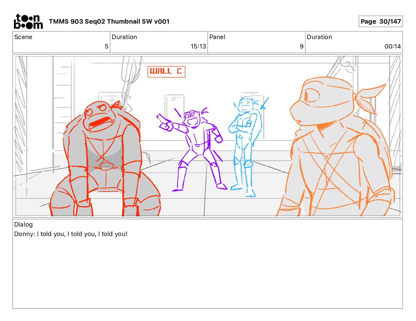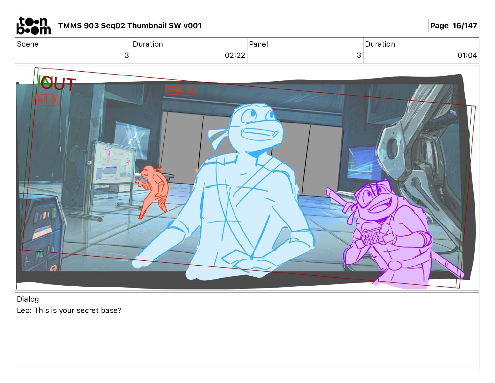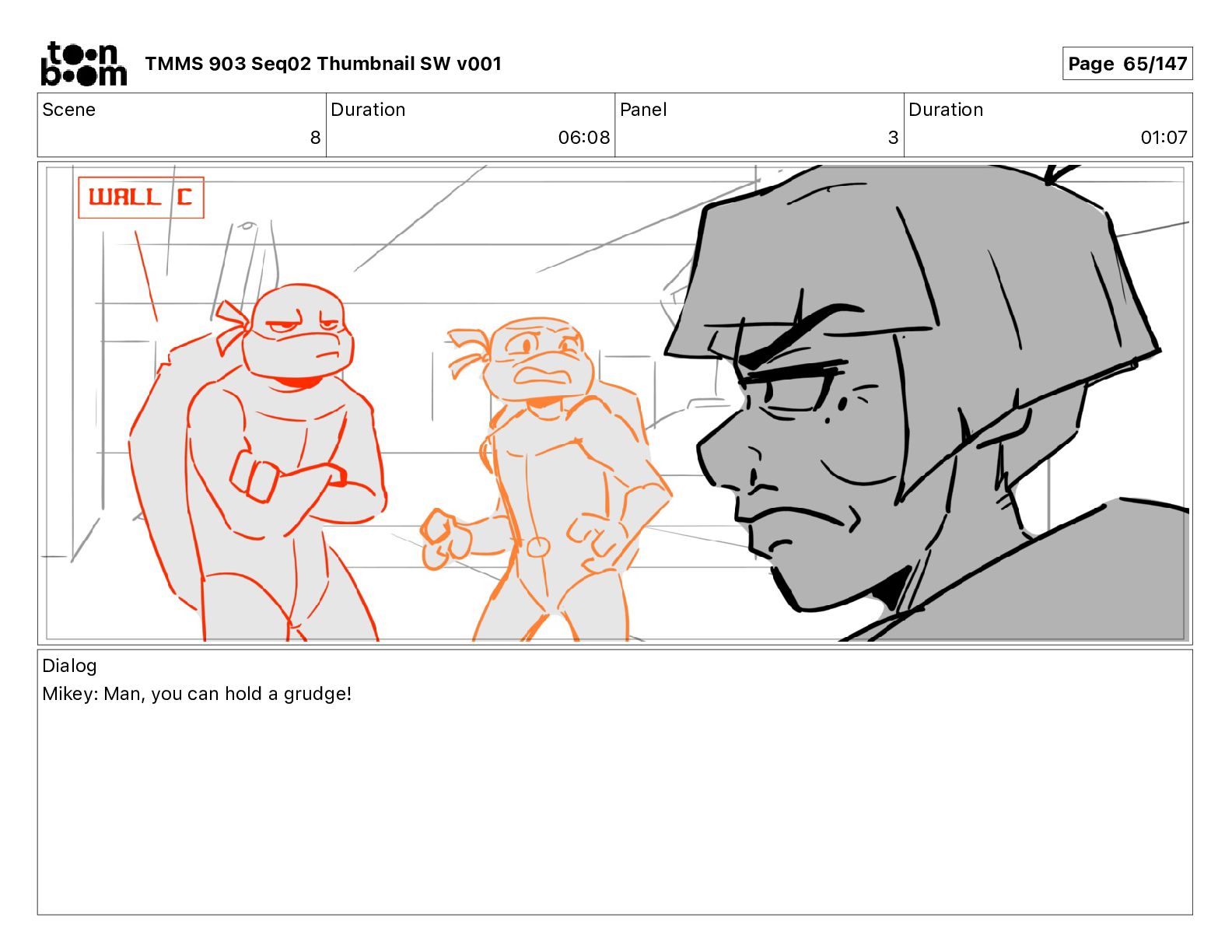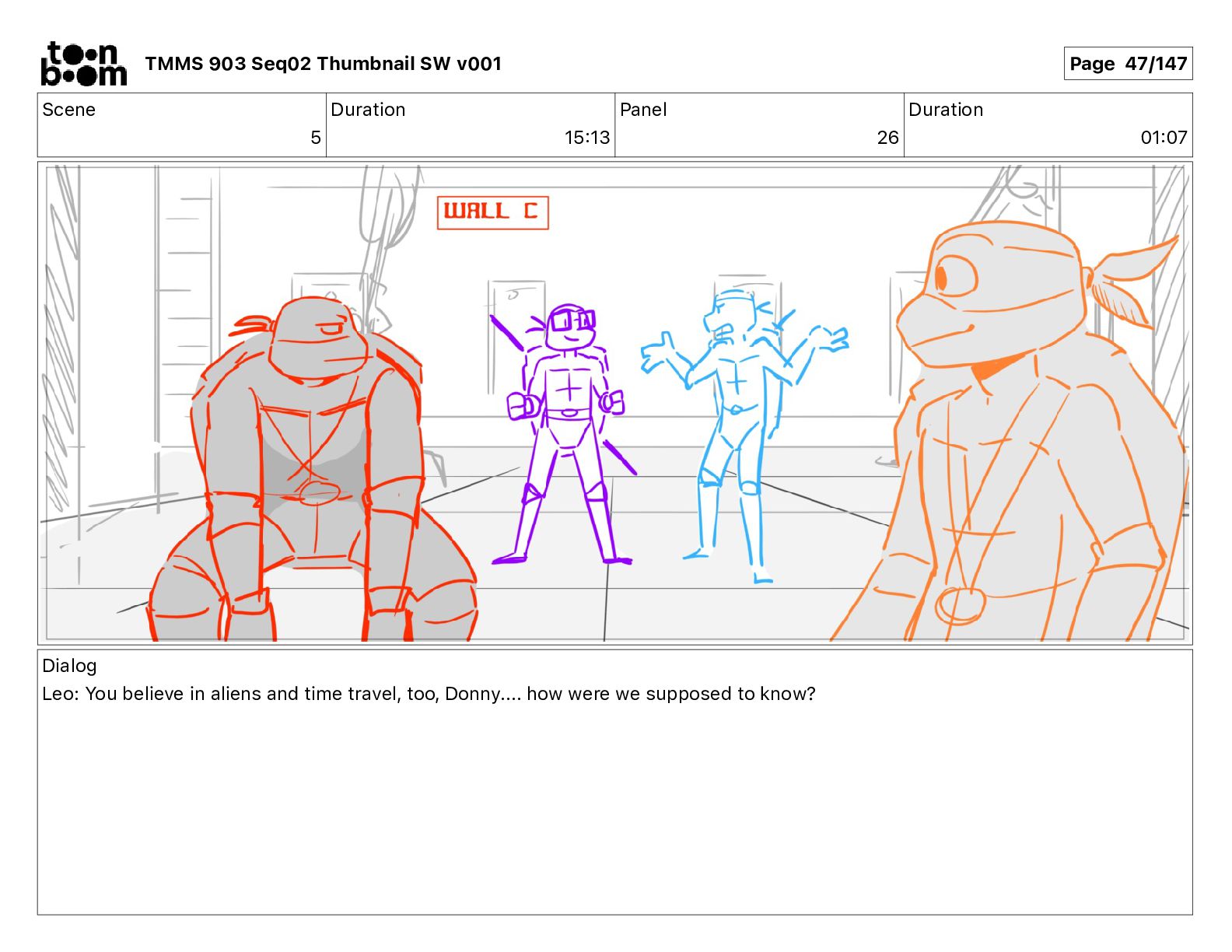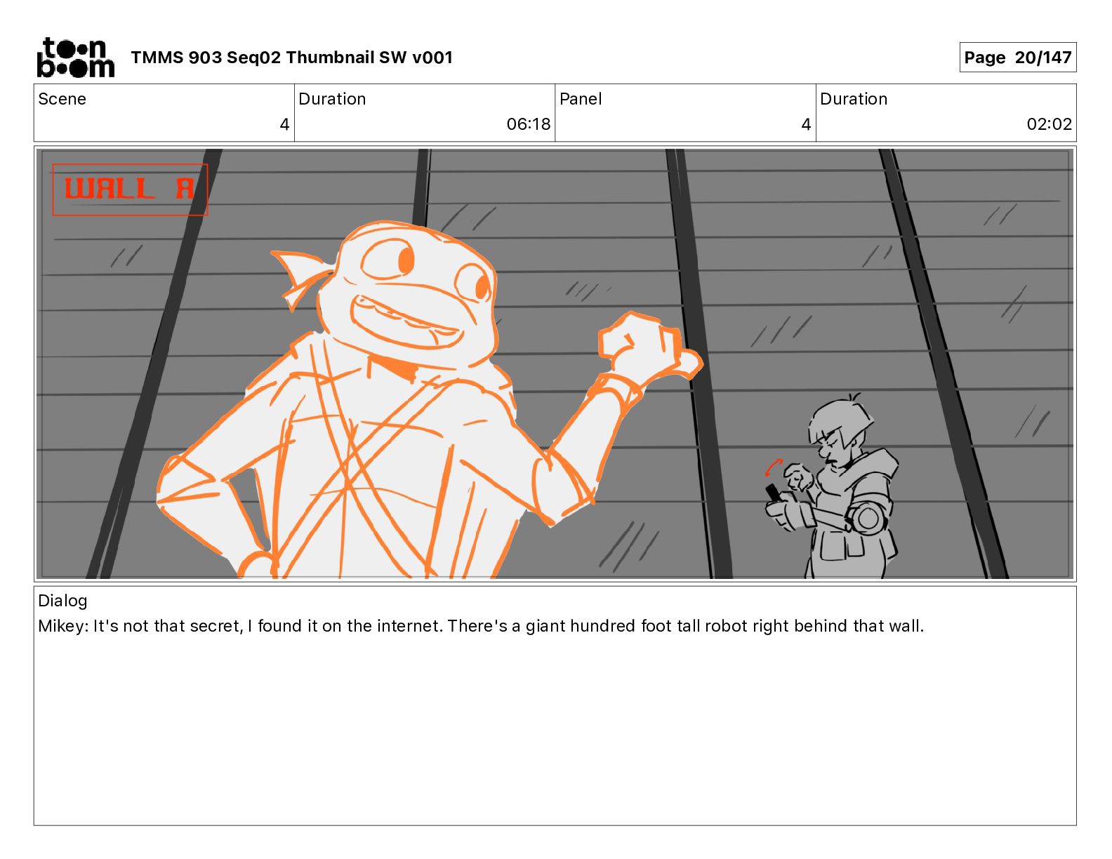 Dialog Mikey: It's not that secret, I found it on the internet. There's a giant hundred foot tall robot right behind that wall. TMMS 903 Seq02 Thumbnail SW v001 Page 20/147