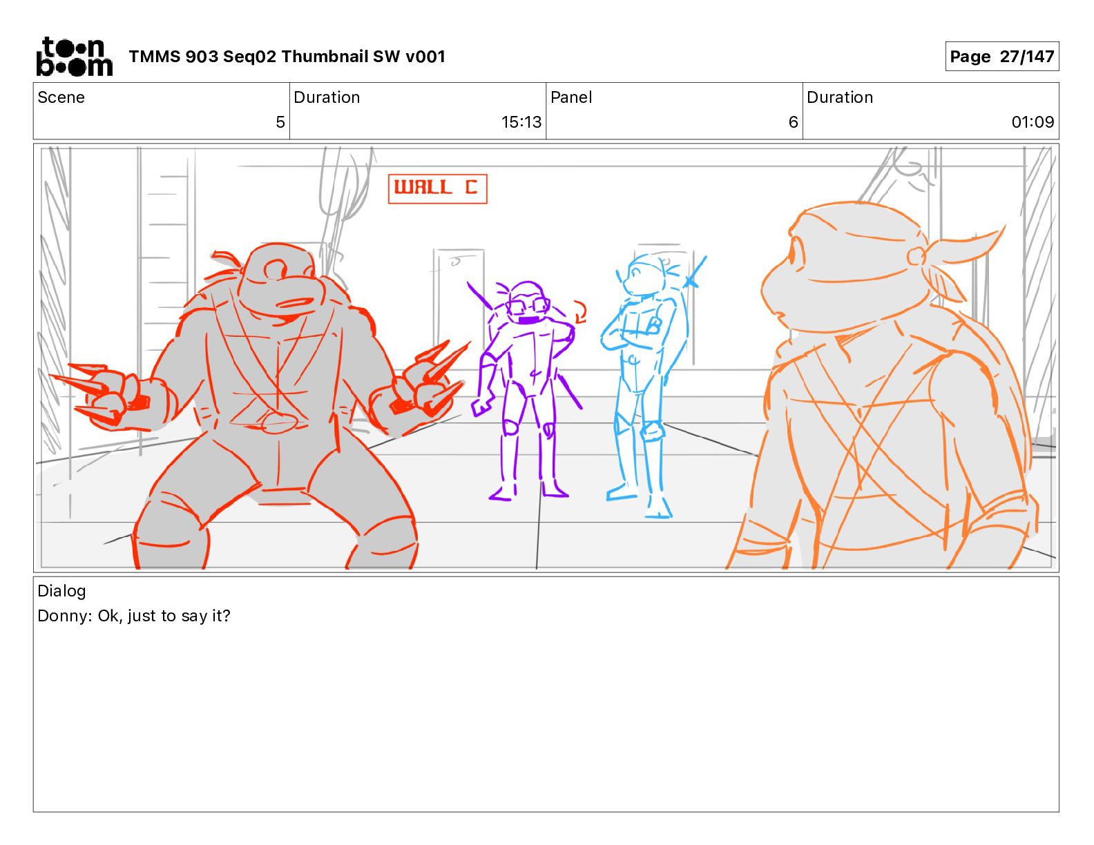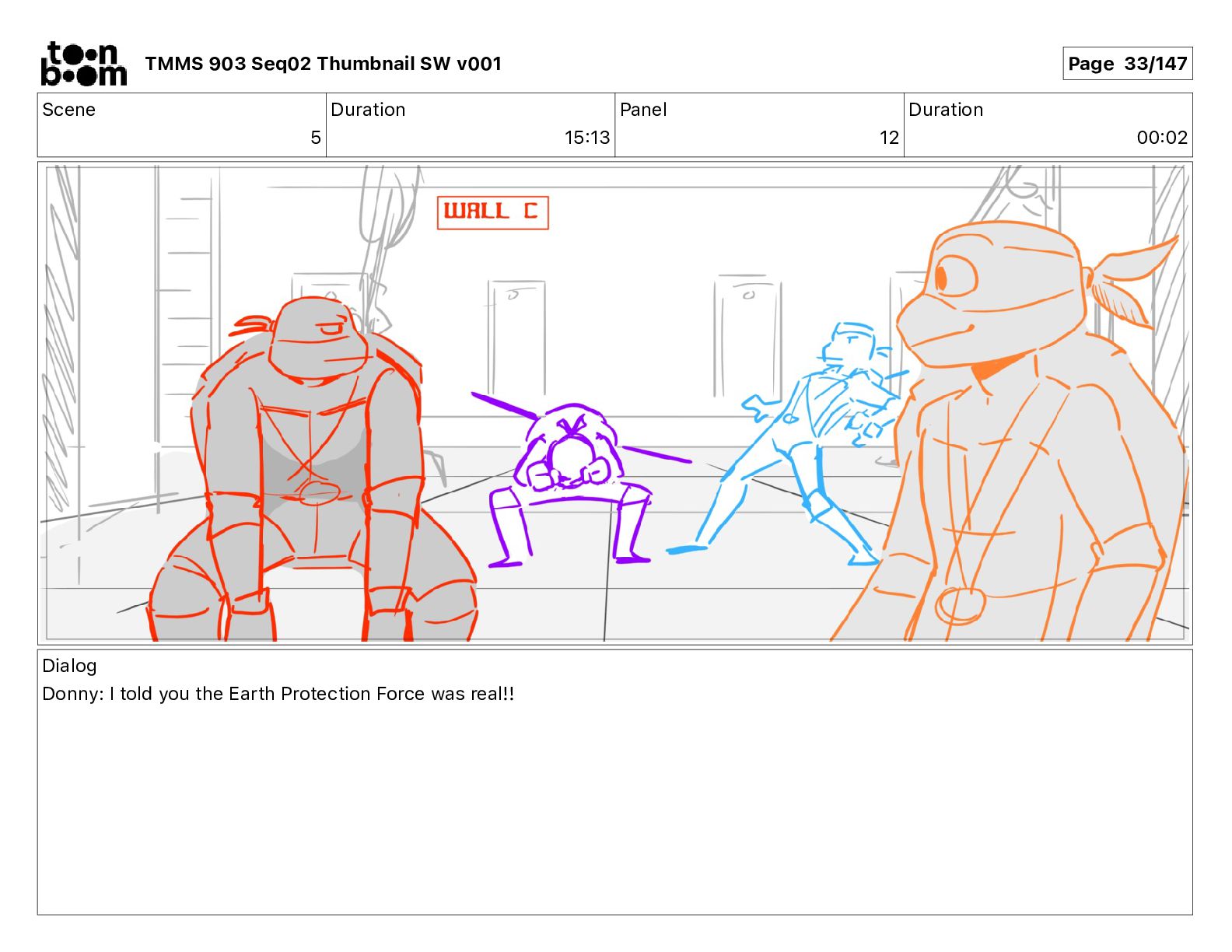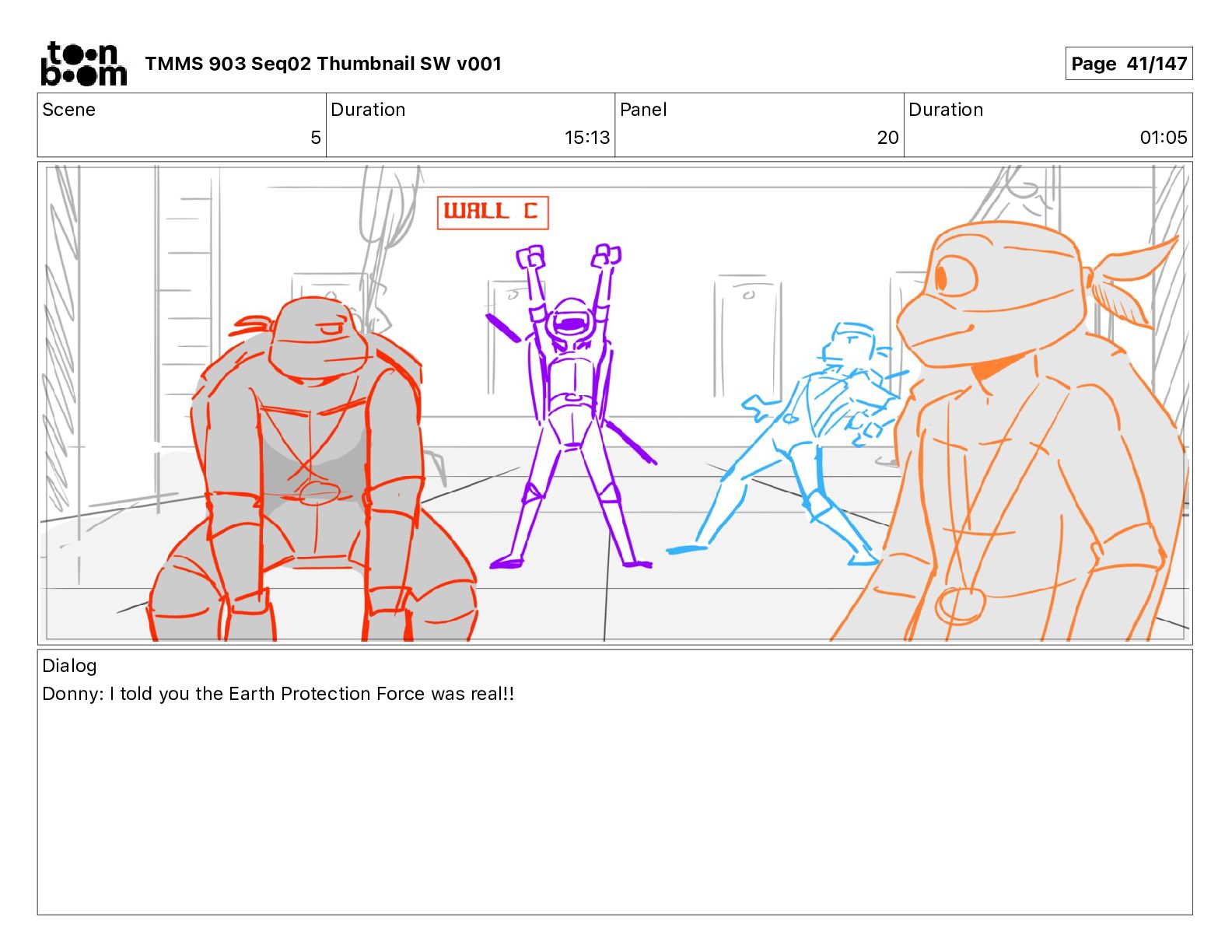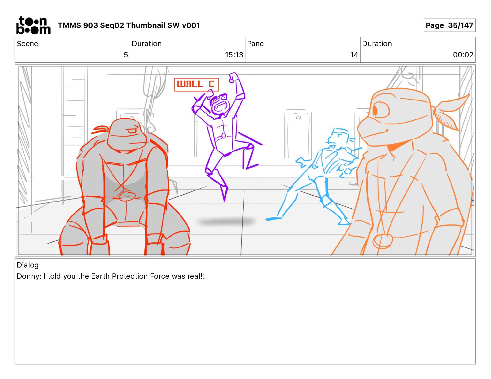 Dialog Mikey: It's not that secret, I found it on the internet. There's a giant hundred foot tall robot right behind that wall. TMMS 903 Seq02 Thumbnail SW v001 Page 20/147