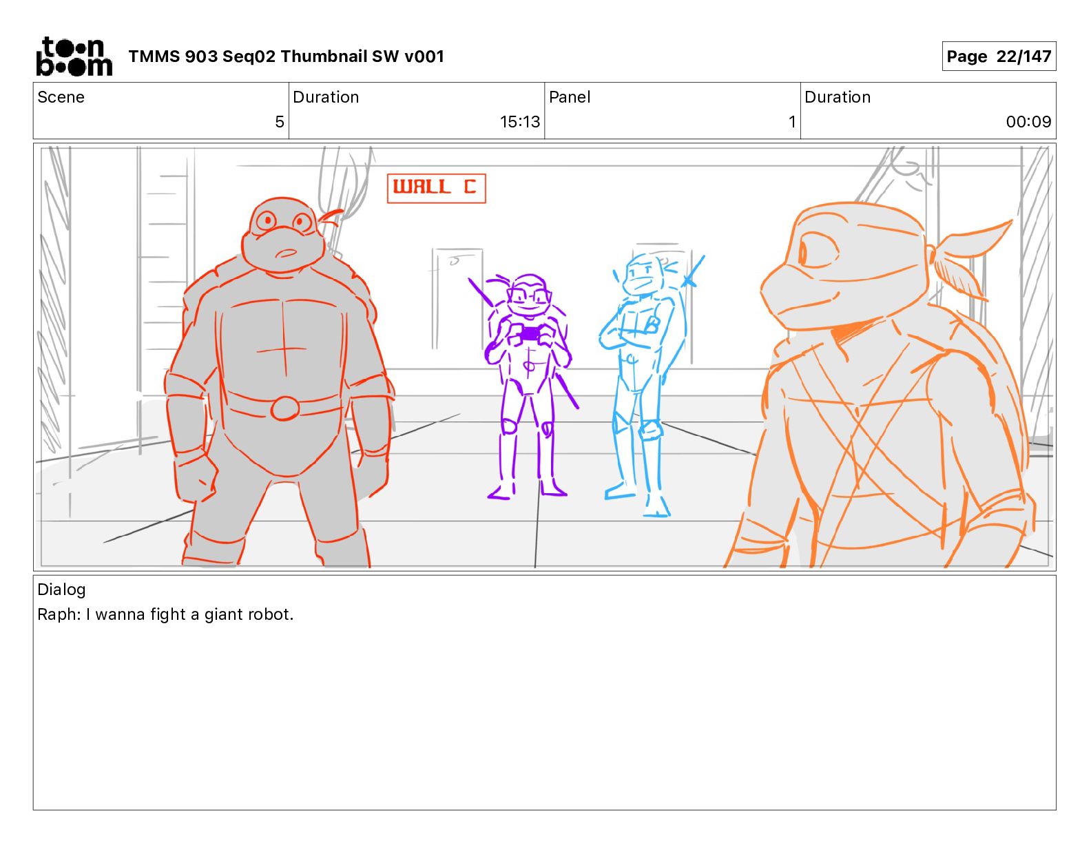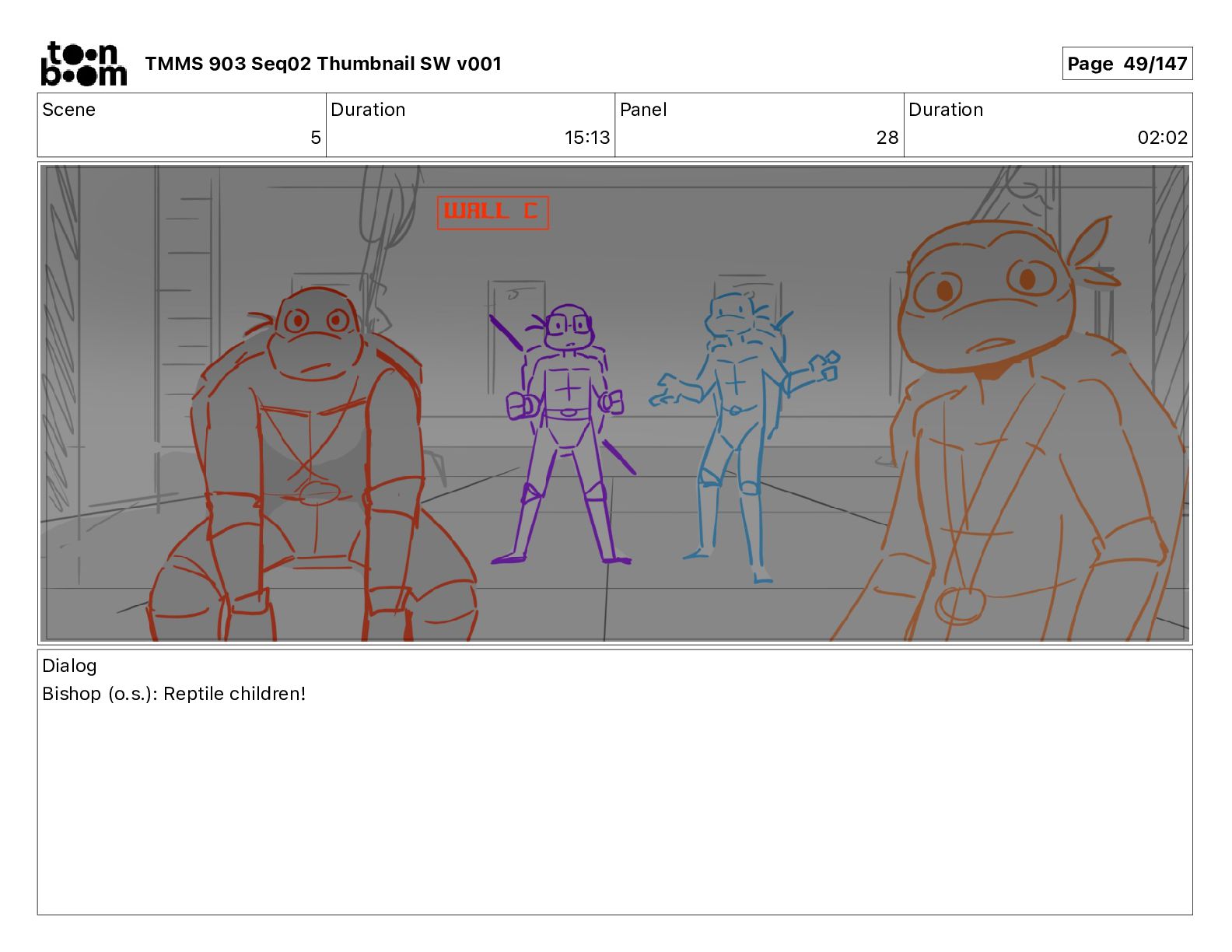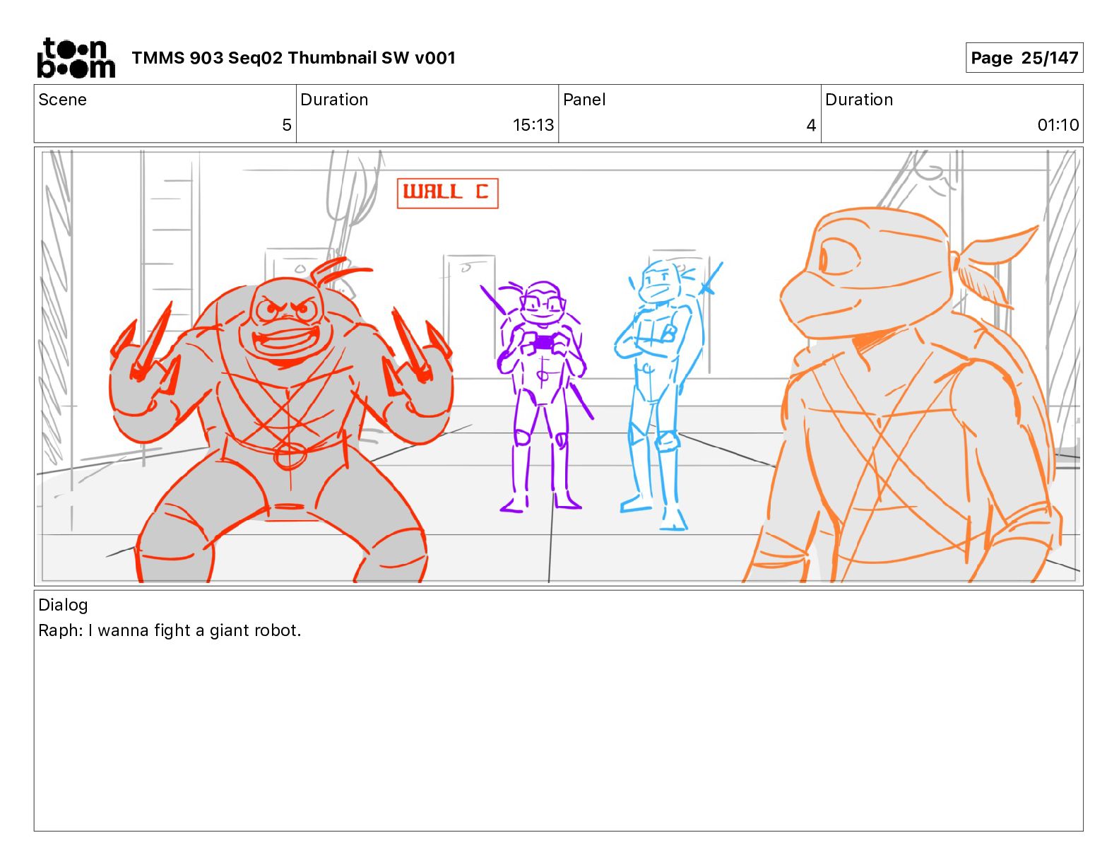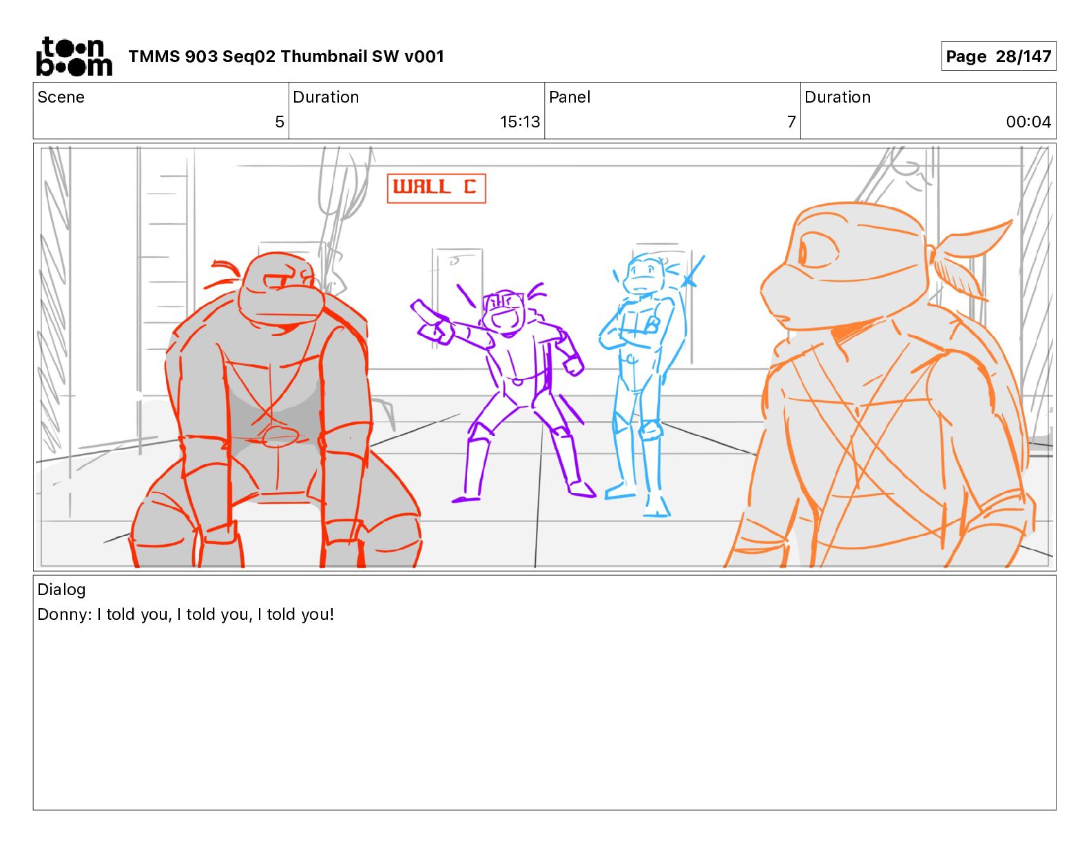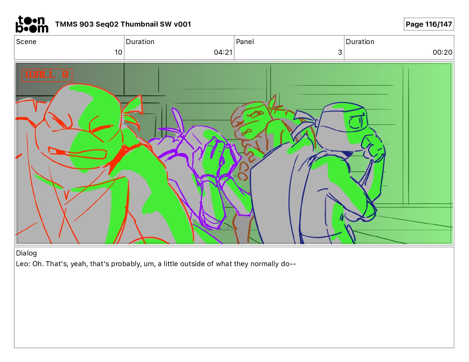 Dialog Mikey: It's not that secret, I found it on the internet. There's a giant hundred foot tall robot right behind that wall. TMMS 903 Seq02 Thumbnail SW v001 Page 20/147
