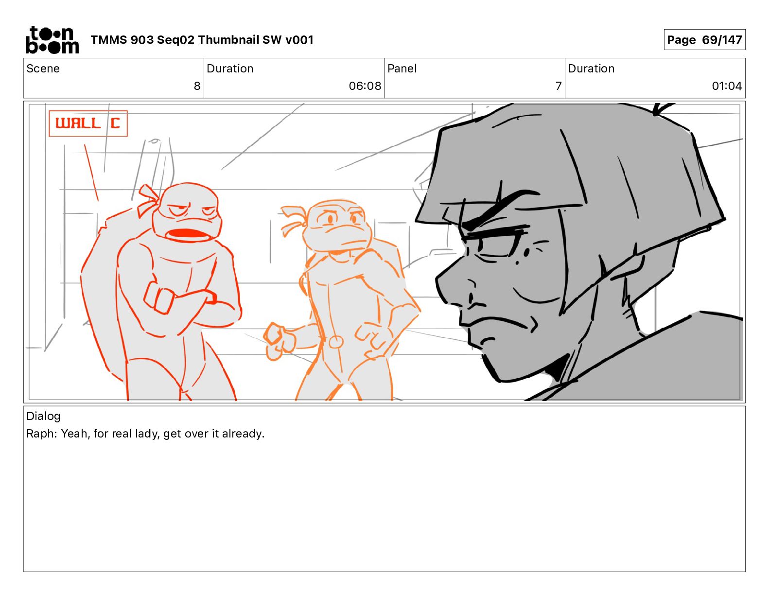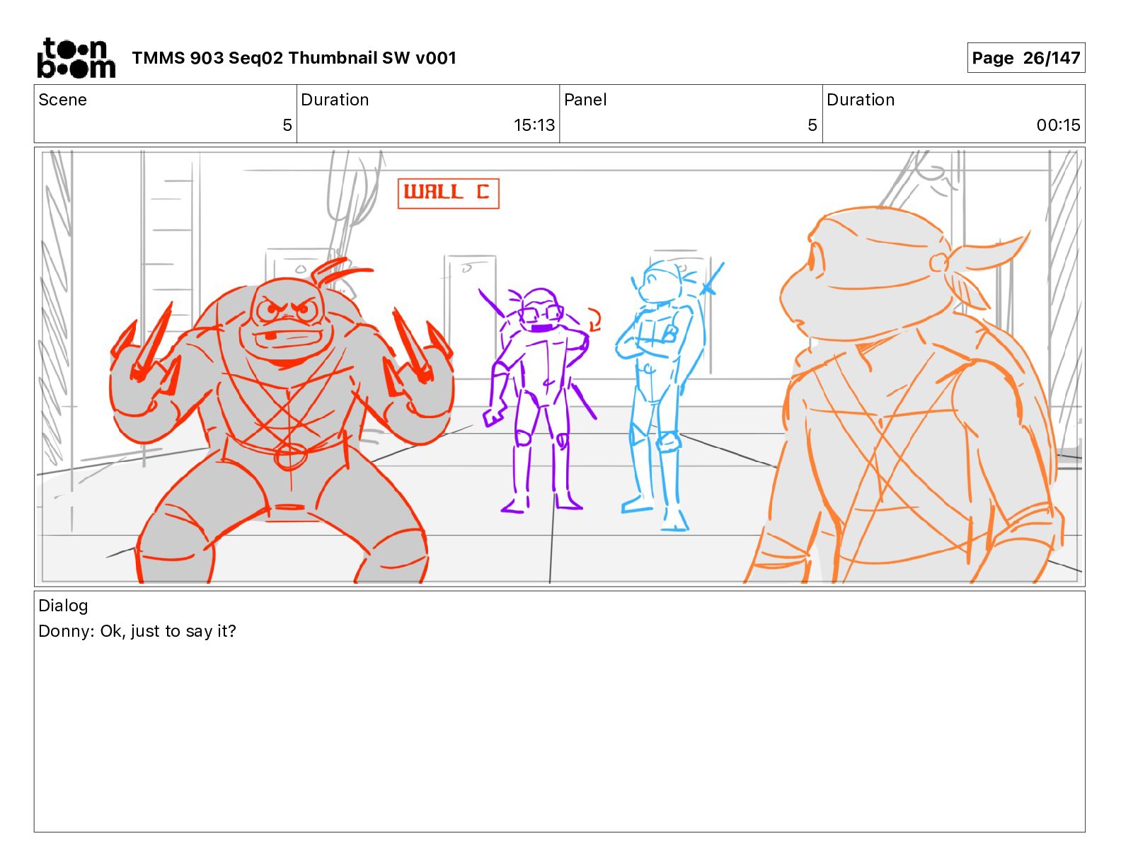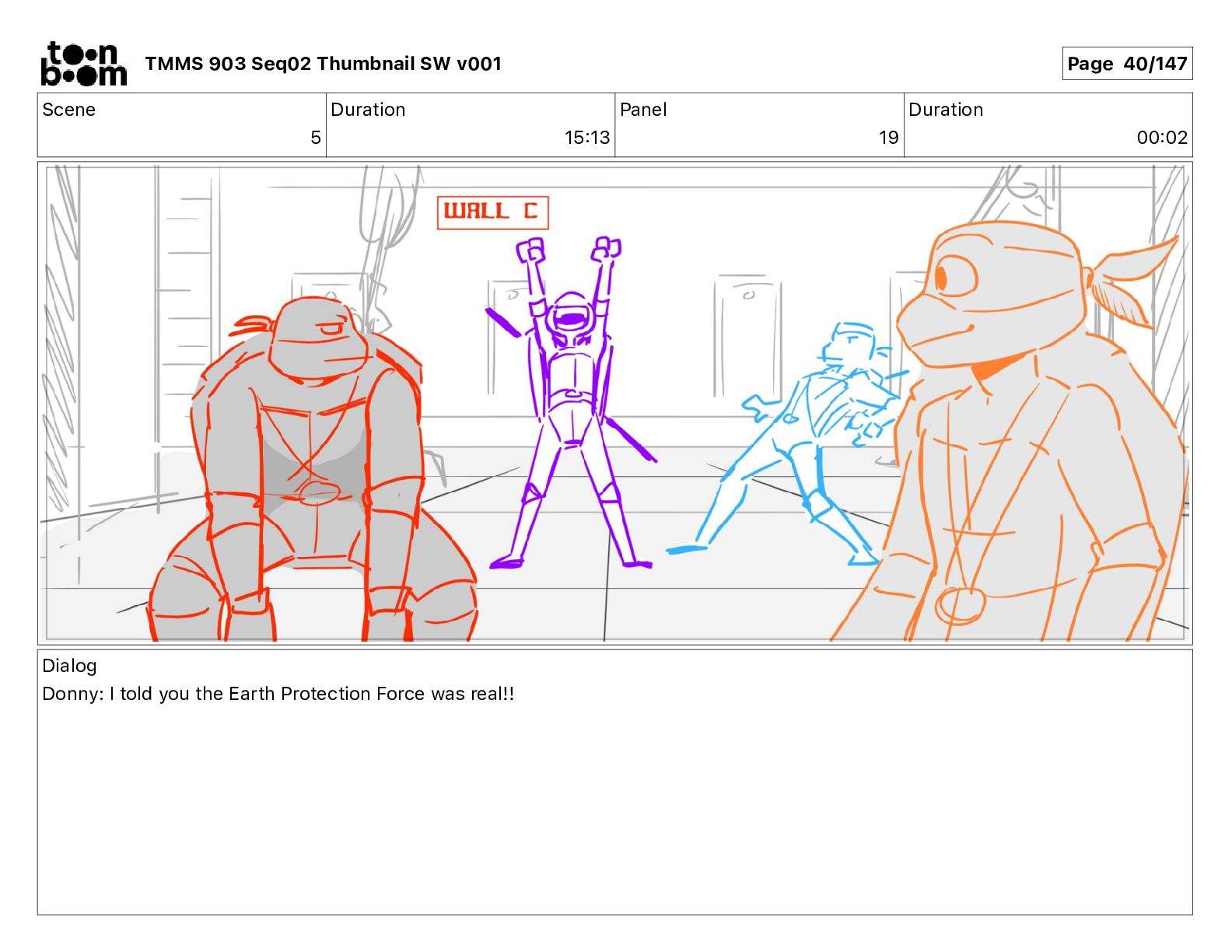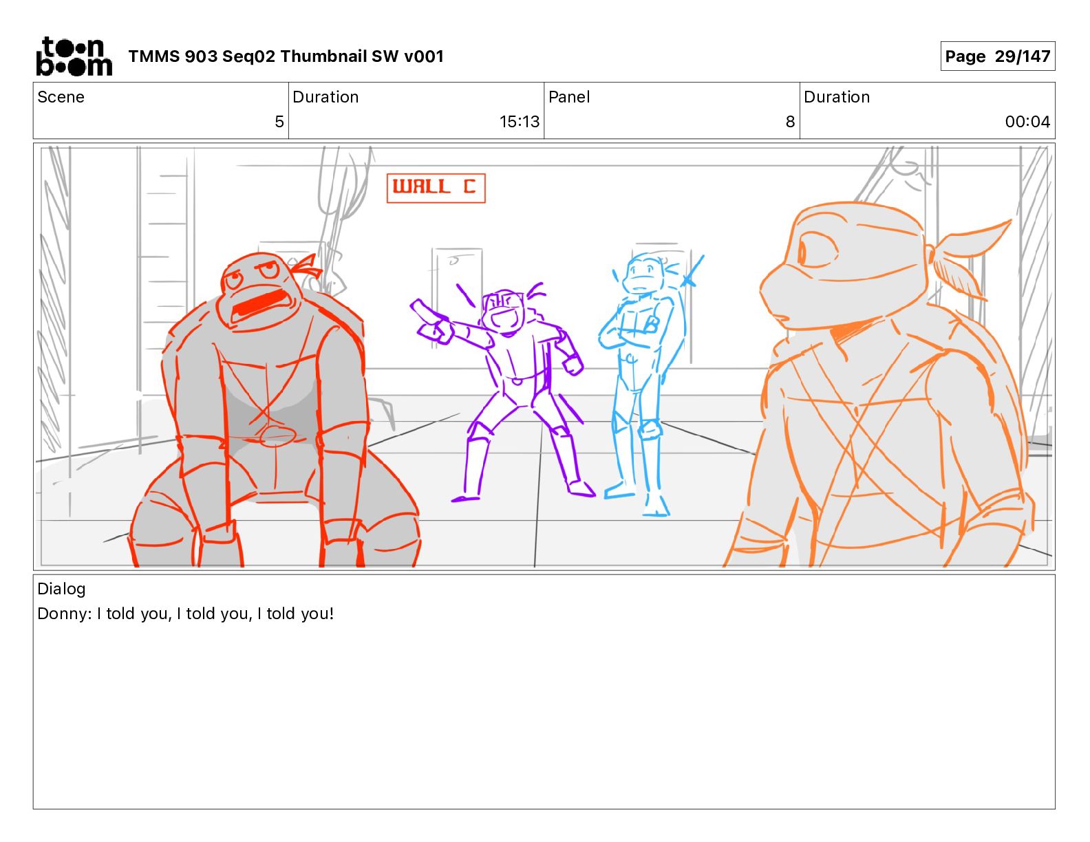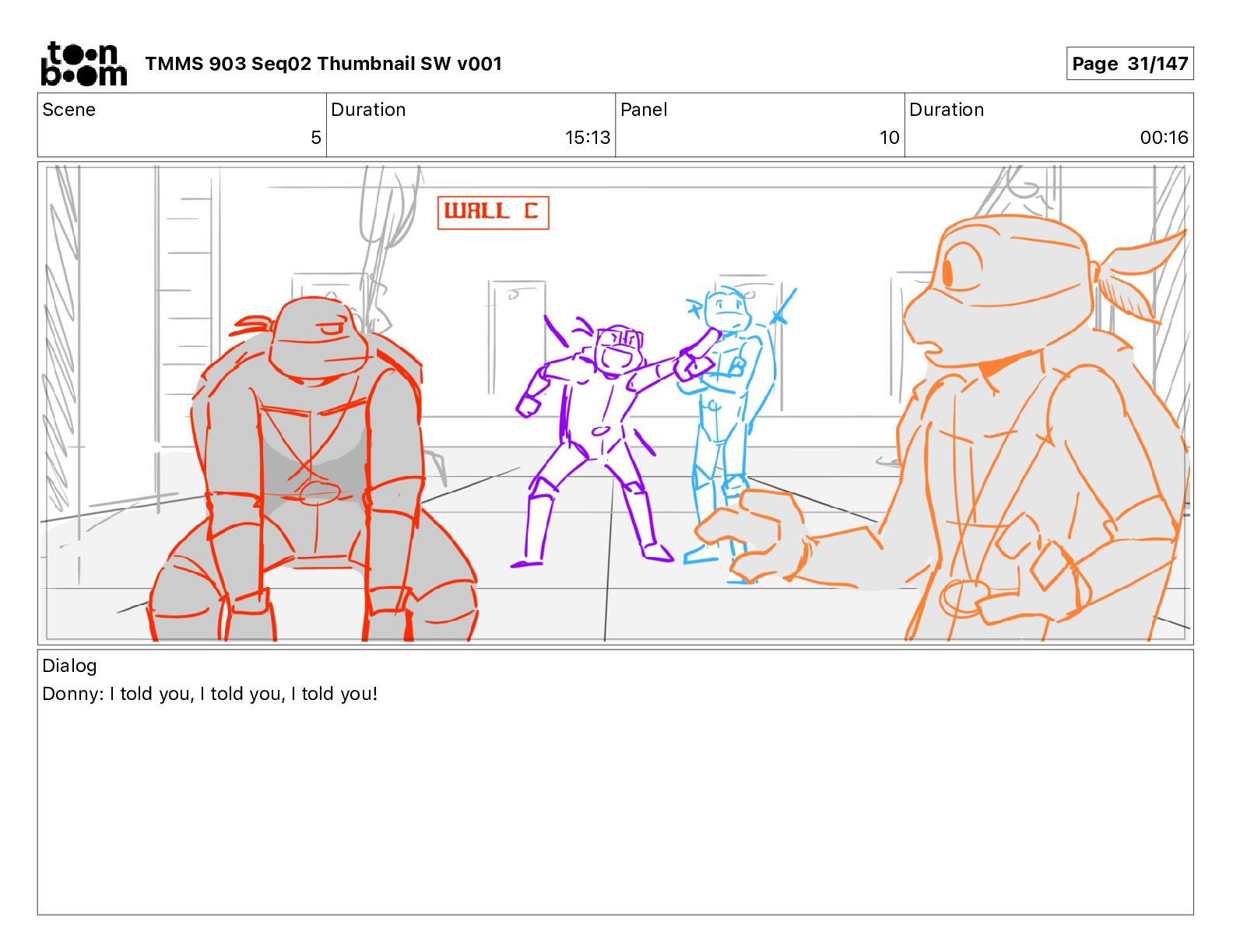 Dialog Mikey: It's not that secret, I found it on the internet. There's a giant hundred foot tall robot right behind that wall. TMMS 903 Seq02 Thumbnail SW v001 Page 20/147
