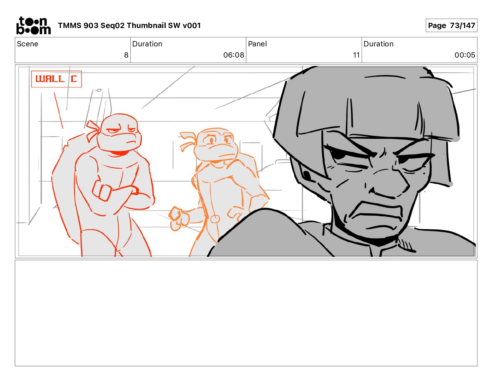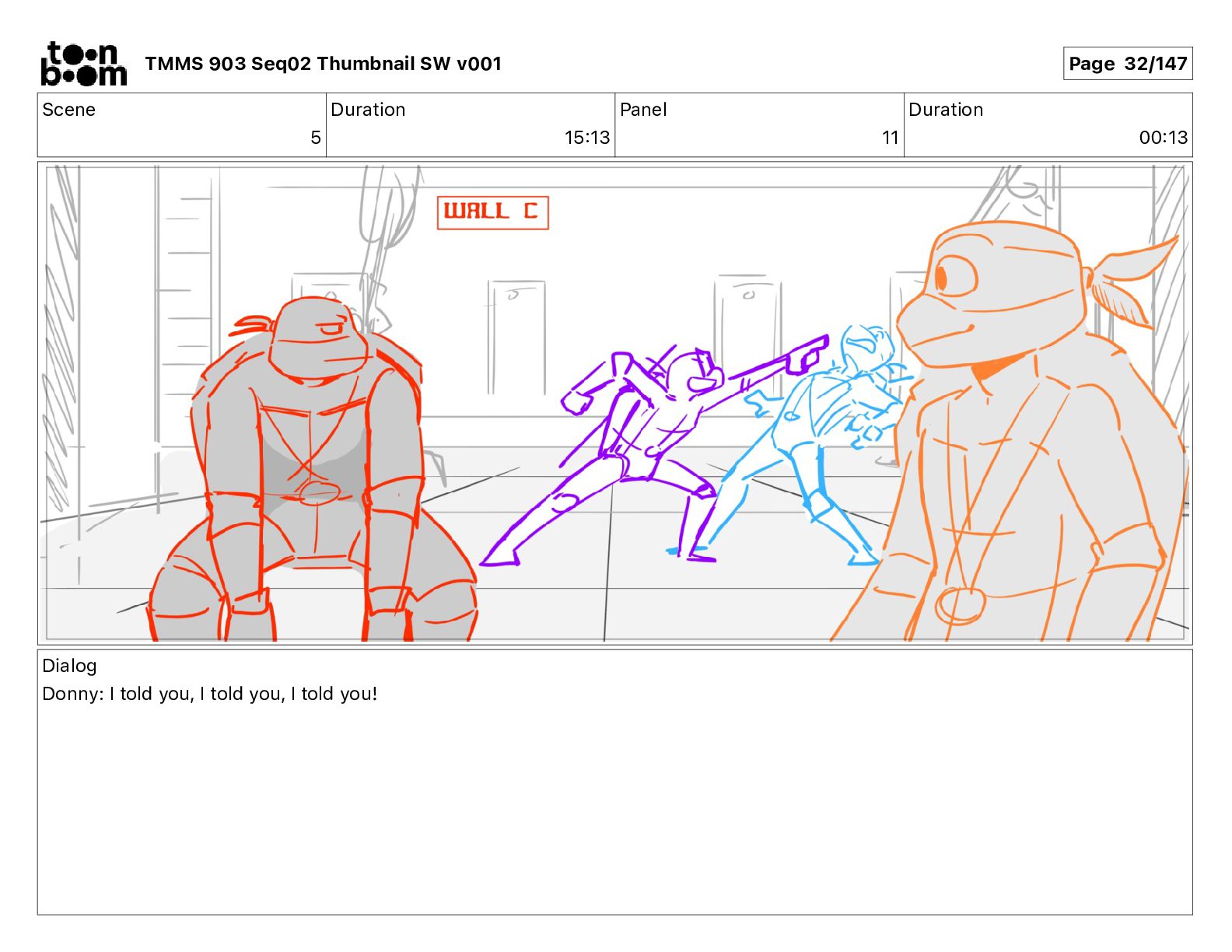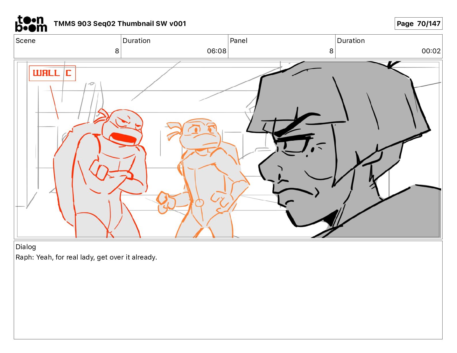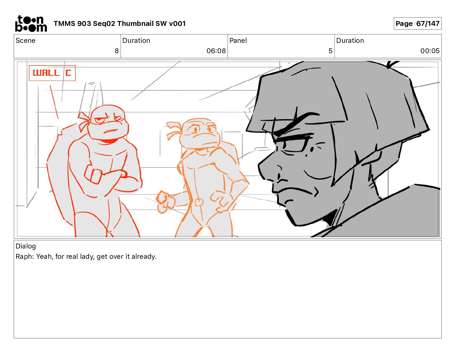 Dialog Mikey: It's not that secret, I found it on the internet. There's a giant hundred foot tall robot right behind that wall. TMMS 903 Seq02 Thumbnail SW v001 Page 20/147