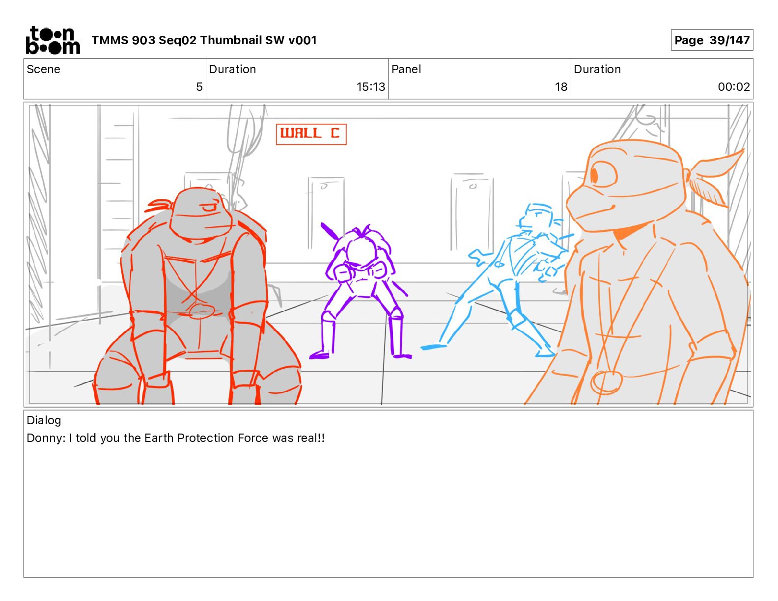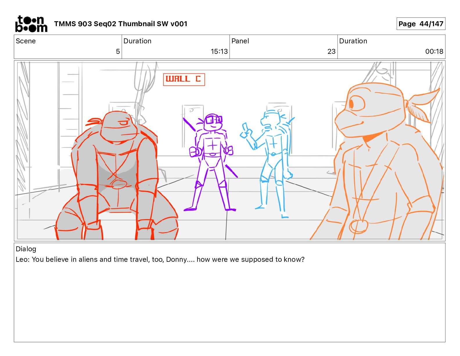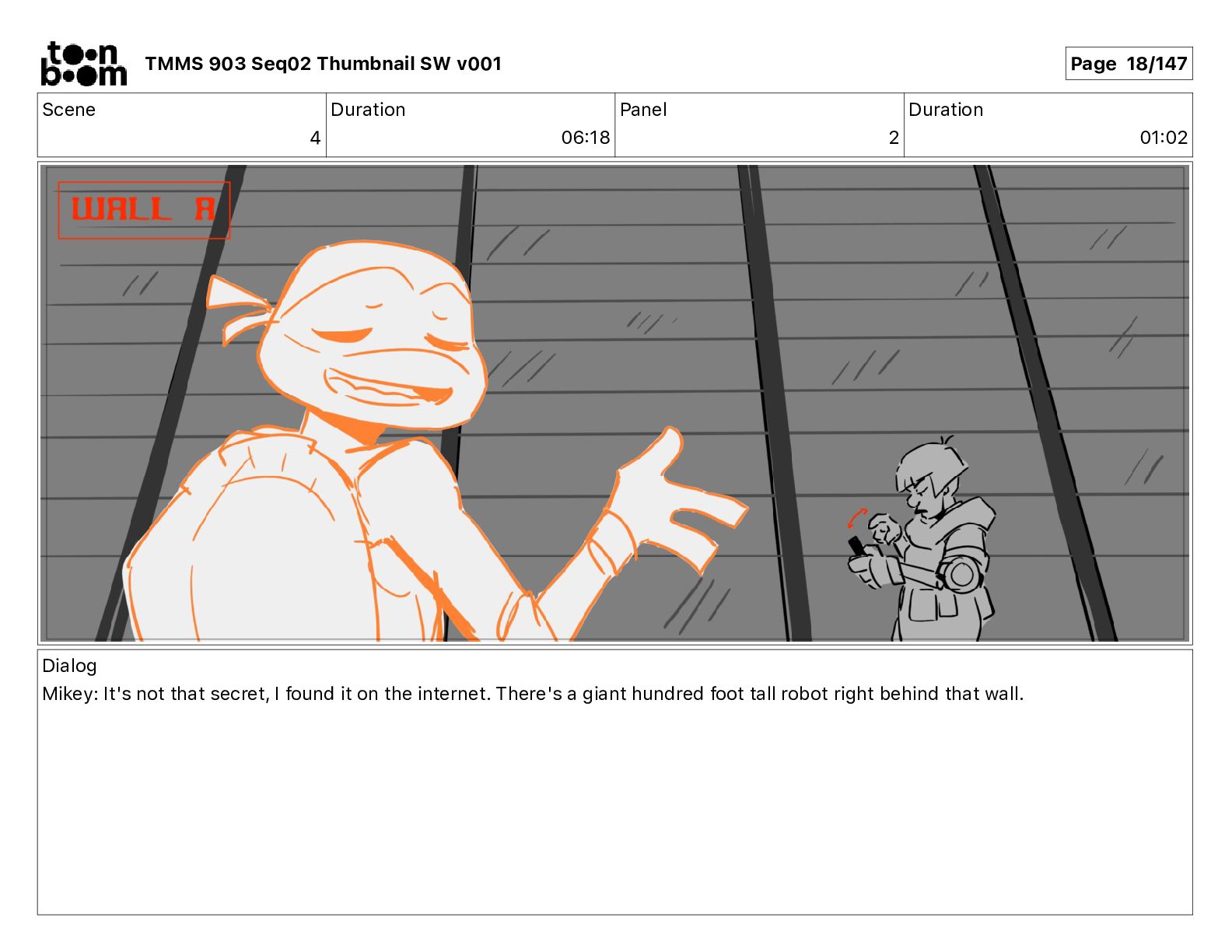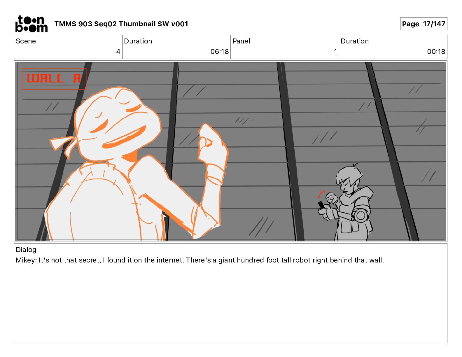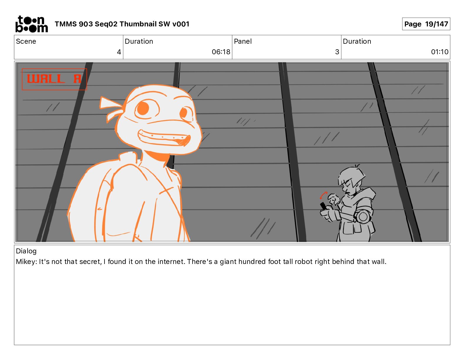 Dialog Mikey: It's not that secret, I found it on the internet. There's a giant hundred foot tall robot right behind that wall. TMMS 903 Seq02 Thumbnail SW v001 Page 18/147