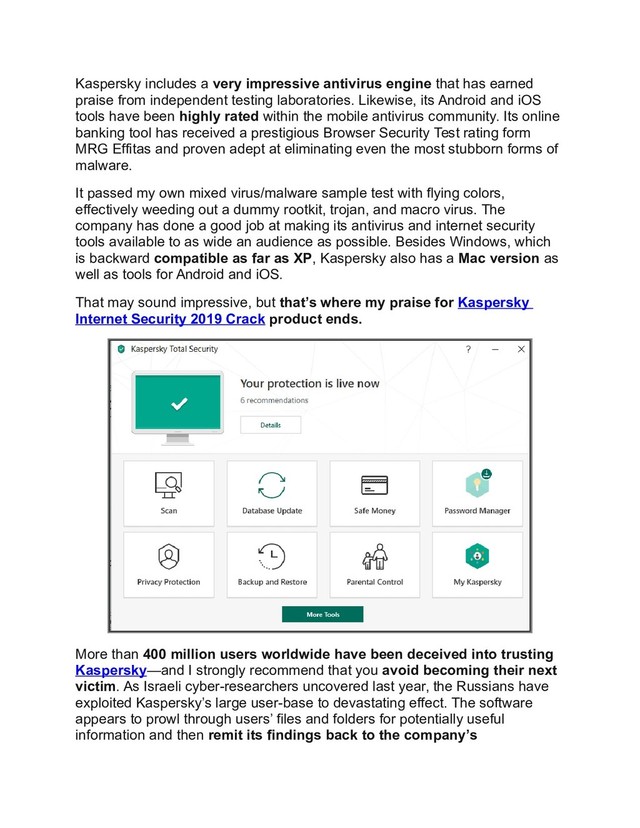 praise from independent testing laboratories. Likewise, its Android and iOS tools have been highly rated within the mobile antivirus community. Its online banking tool has received a prestigious Browser Security Test rating form MRG Effitas and proven adept at eliminating even the most stubborn forms of malware. It passed my own mixed virus/malware sample test with flying colors, effectively weeding out a dummy rootkit, trojan, and macro virus. The company has done a good job at making its antivirus and internet security tools available to as wide an audience as possible. Besides Windows, which is backward compatible as far as XP, Kaspersky also has a Mac version as well as tools for Android and iOS. That may sound impressive, but that’s where my praise for Kaspersky Internet Security 2019 Crack product ends. More than 400 million users worldwide have been deceived into trusting Kaspersky—and I strongly recommend that you avoid becoming their next victim. As Israeli cyber-researchers uncovered last year, the Russians have exploited Kaspersky’s large user-base to devastating effect. The software appears to prowl through users’ files and folders for potentially useful information and then remit its findings back to the company’s