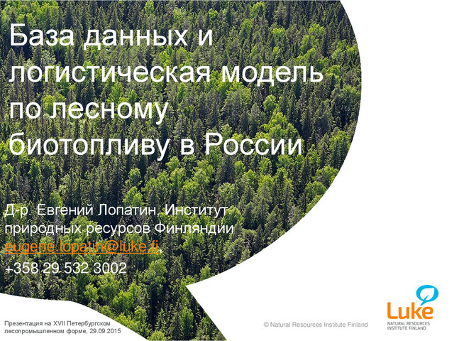 1 7.10.2015 Презентация на XVII Петербургском лесопромышленном форме, 29.09.2015 База данных и логистическая модель по лесному биотопливу в России Д-р. Евгений Лопатин, Институт природных ресурсов Финляндии [email protected], +358 29 532 3002
