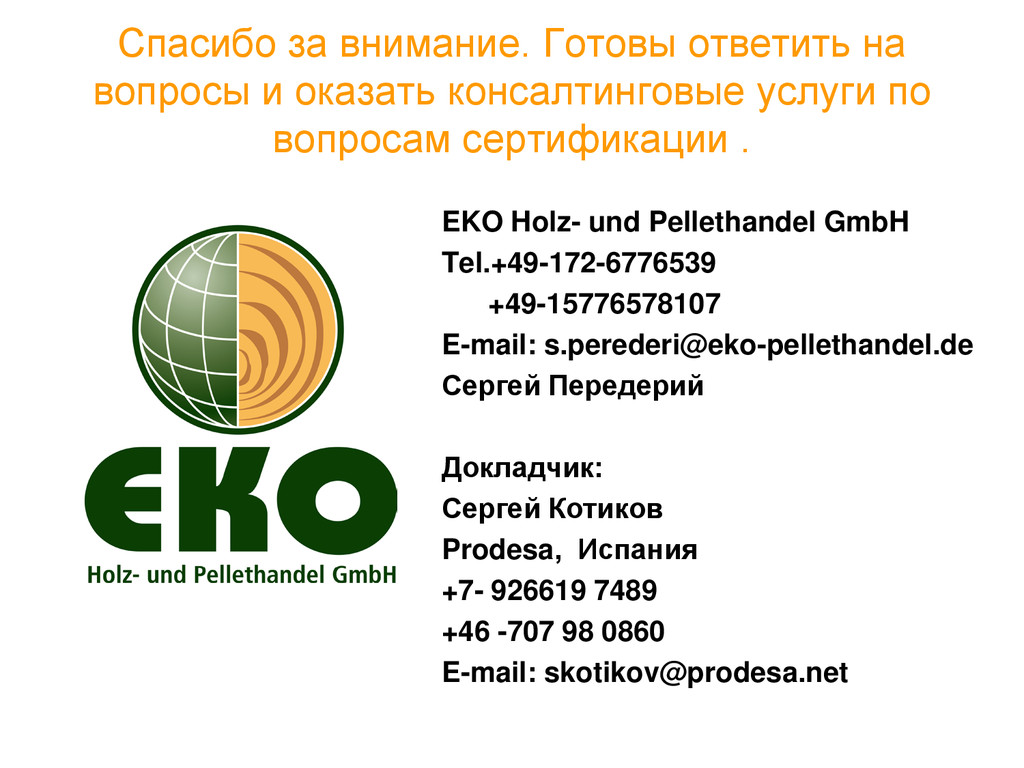Сергей ПЕРЕДЕРИЙ, соучредитель и генеральный директор, EKO Holzund Pellethandel, GmbH Düsseldorf / Сергей КОТИКОВ, менеджер по продажам, компания Prodesa (Испания), Петербургский Международный Лесопромышленный Форум 2015. Конференция «Биоэнергетика в ЛПК: перспективы развития», Часть 1. Производство и сбыт древесных топливных гранул, 29 сентября 2015
