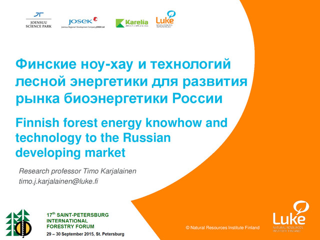 Тимо КАРЬЯЛАЙНЕН, профессор, Институт природных ресурсов Финляндии (LUKE), Петербургский Международный Лесопромышленный Форум 2015. Конференция «Биоэнергетика в ЛПК: перспективы развития», Часть 2. Биотопливо и биоэнергетика как составляющая часть биорефайнинга. Генерация тепловой и электроэнергии с использованием биомассы из древесины., 29 сентября 2015