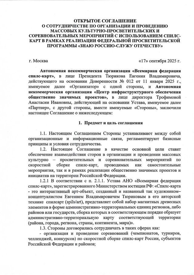 Открытое соглашение сотрудничестве по организации и проведению массовых культурно-просветительских и соревновательных мероприятий с использованием спилс-карт в рамках реализации Федеральной просветительской программы «Знаю Россию - служу Отечеству»