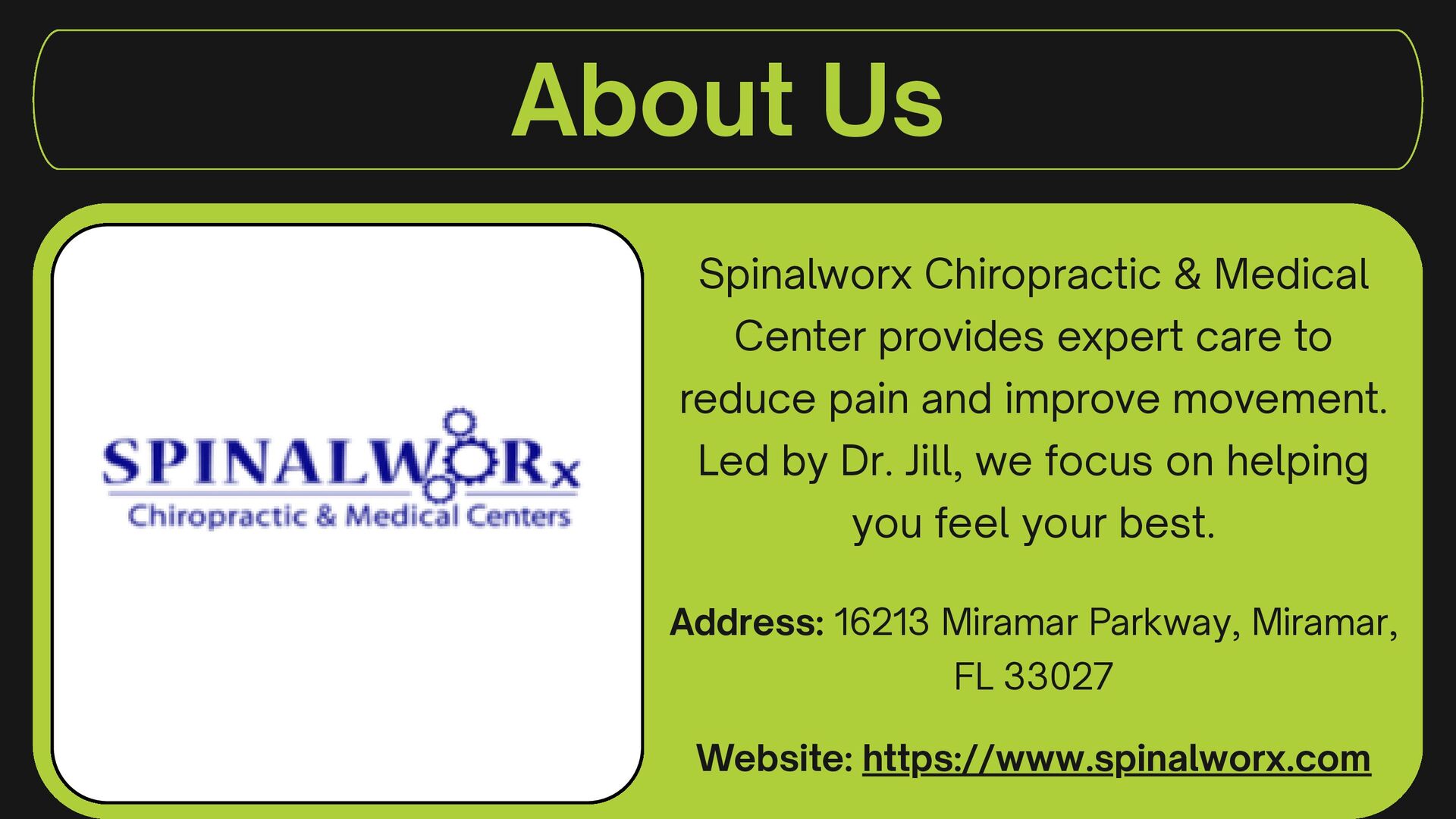 to reduce pain and improve movement. Led by Dr. Jill, we focus on helping you feel your best. Address: 16213 Miramar Parkway, Miramar, FL 33027 Website: https://www.spinalworx.com