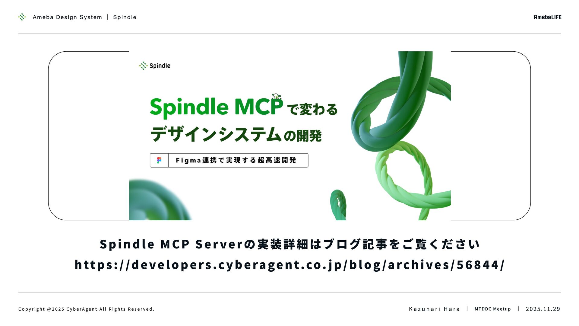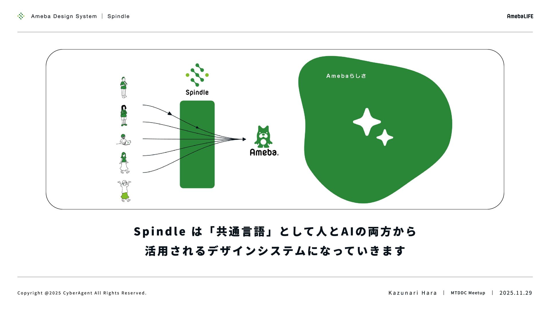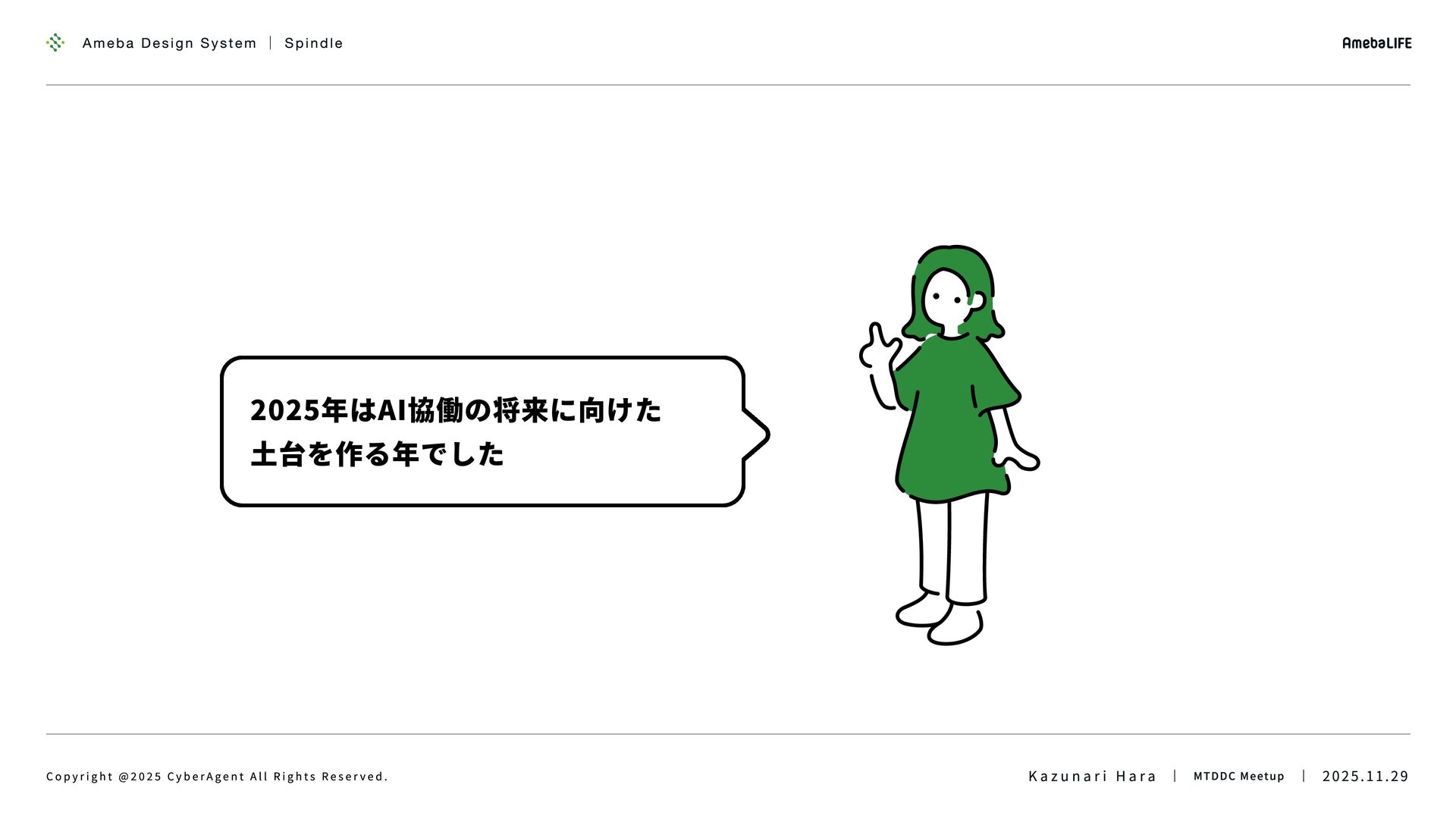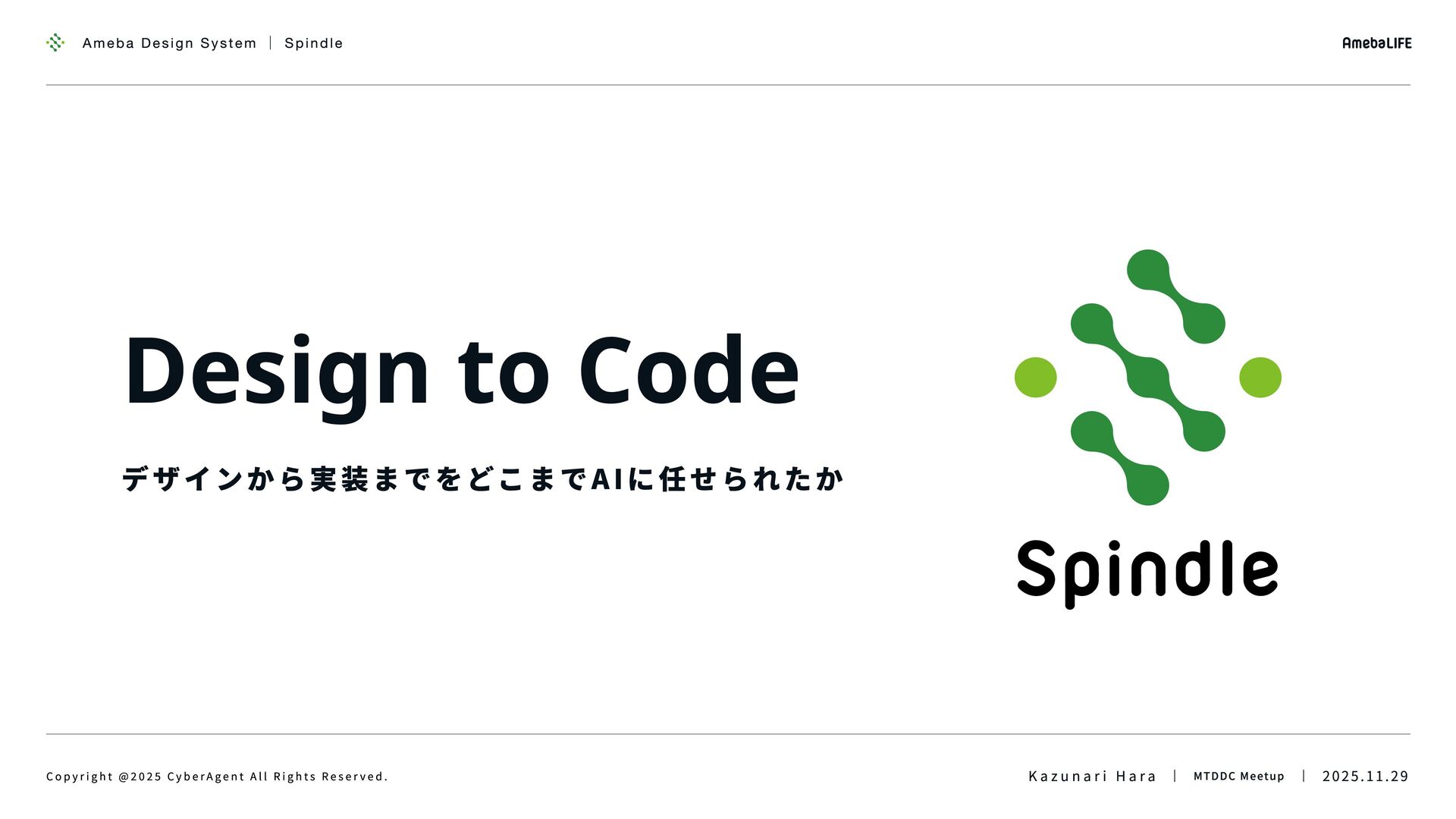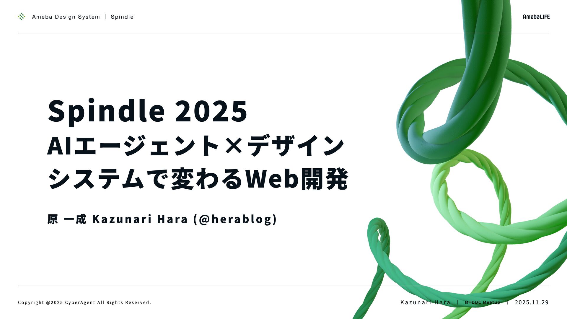 Amebaのデザインシステム「Spindle」を題材に、AIエージェントとデザインシステムが組み合わさるとWeb開発がどう変わるのかを実例ベースで紹介します。2024年までの「人と人の協業」から、2025年に「人とAIの協業」へどうシフトしたのかを、Spindle MCPによるコンテキスト提供、Design Doc自動生成、Figma MCP × Spindle MCPによるDesign to Code、依存モジュール更新やテスト環境整備を含むリポジトリ改善といった具体的な取り組みと数字で解説します。最後に、専門性とAI活用の掛け算がなぜ重要か、AI時代のデザインシステムの役割を提案します。