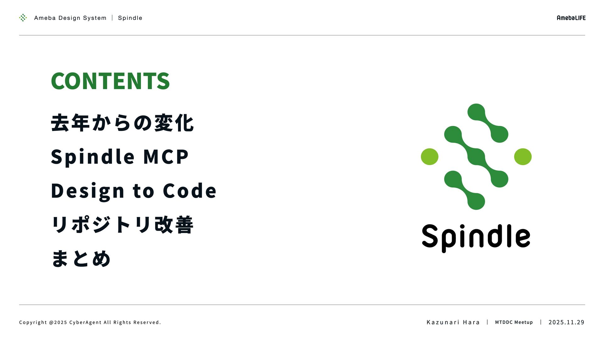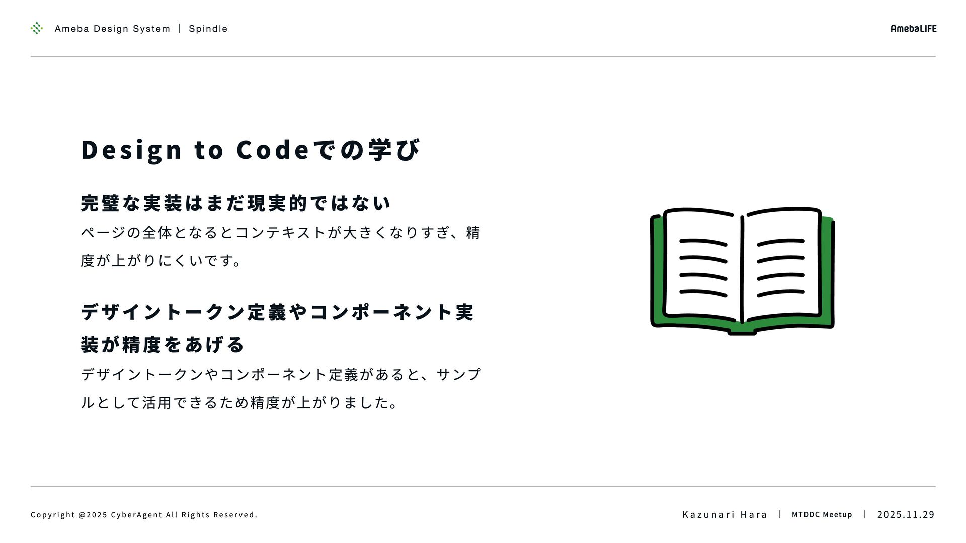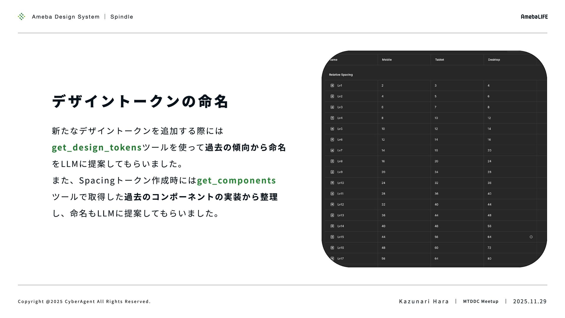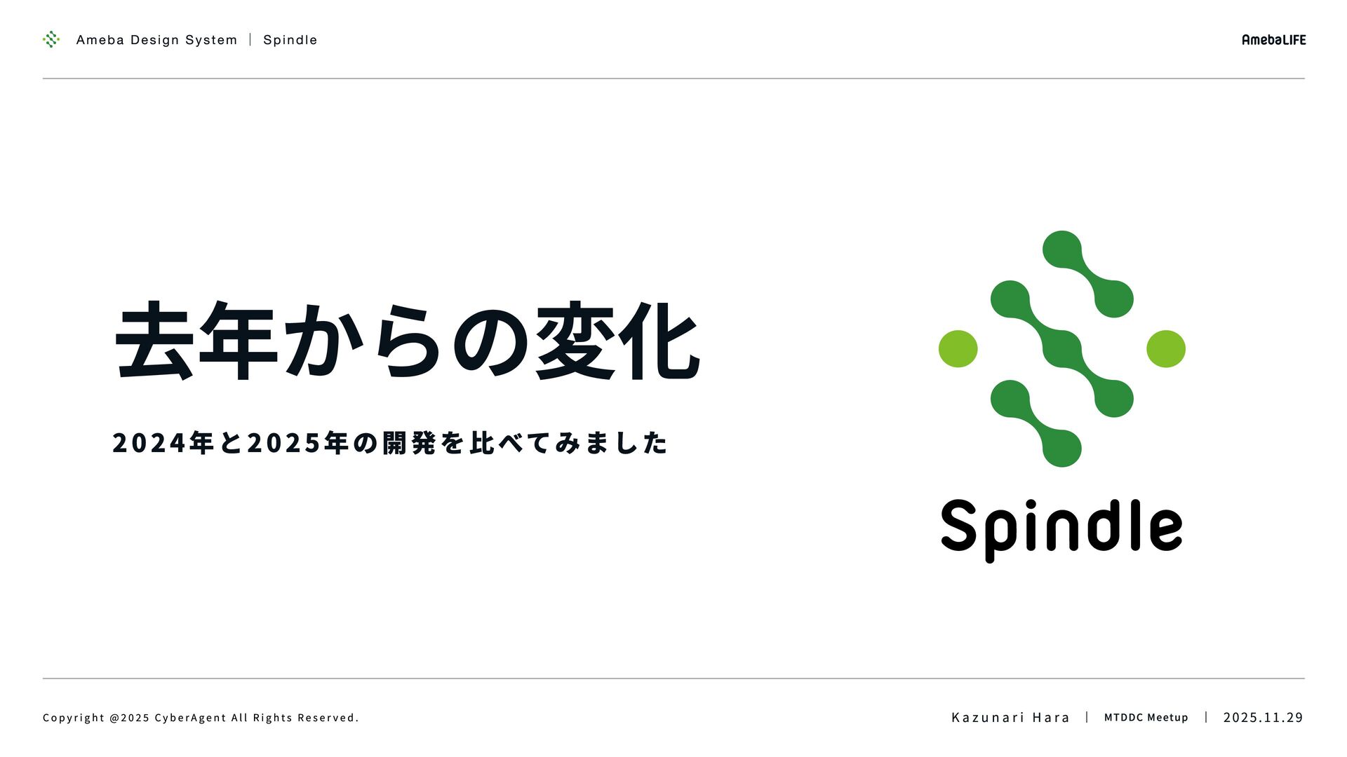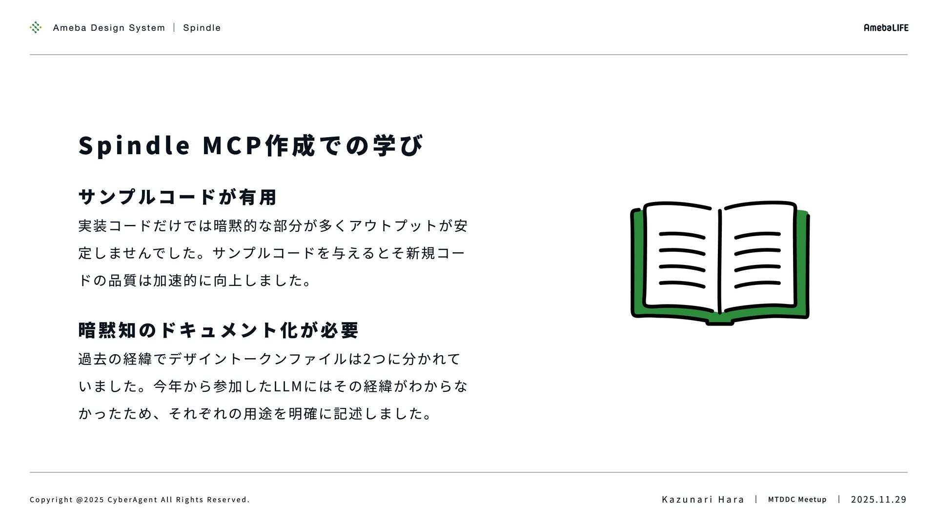 Amebaのデザインシステム「Spindle」を題材に、AIエージェントとデザインシステムが組み合わさるとWeb開発がどう変わるのかを実例ベースで紹介します。2024年までの「人と人の協業」から、2025年に「人とAIの協業」へどうシフトしたのかを、Spindle MCPによるコンテキスト提供、Design Doc自動生成、Figma MCP × Spindle MCPによるDesign to Code、依存モジュール更新やテスト環境整備を含むリポジトリ改善といった具体的な取り組みと数字で解説します。最後に、専門性とAI活用の掛け算がなぜ重要か、AI時代のデザインシステムの役割を提案します。