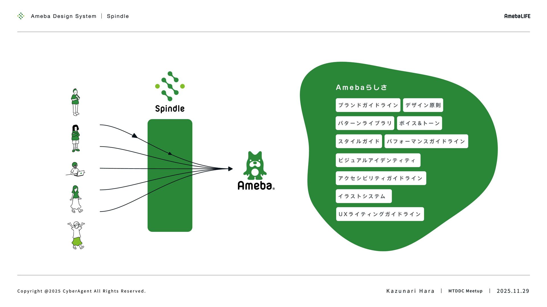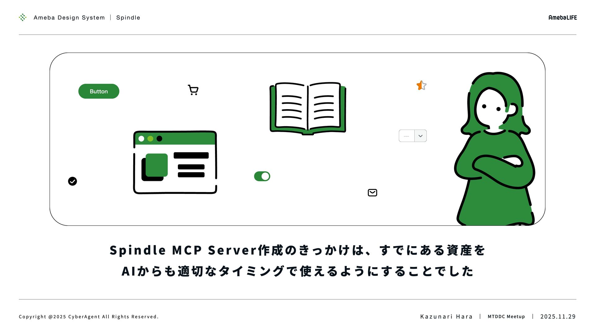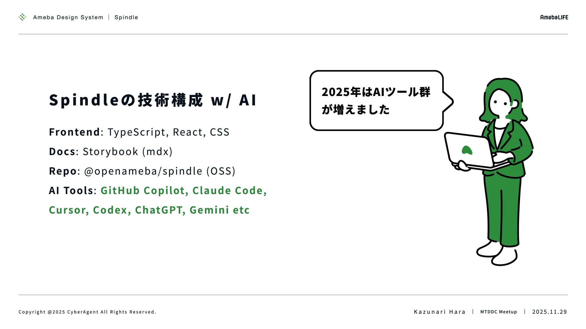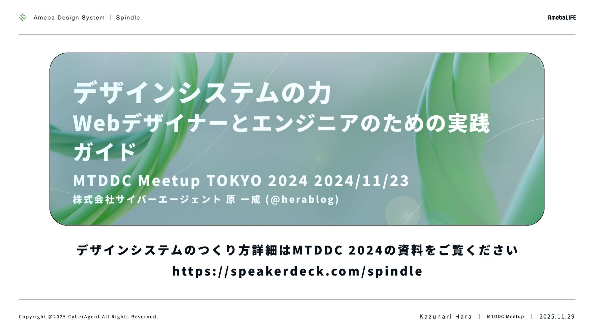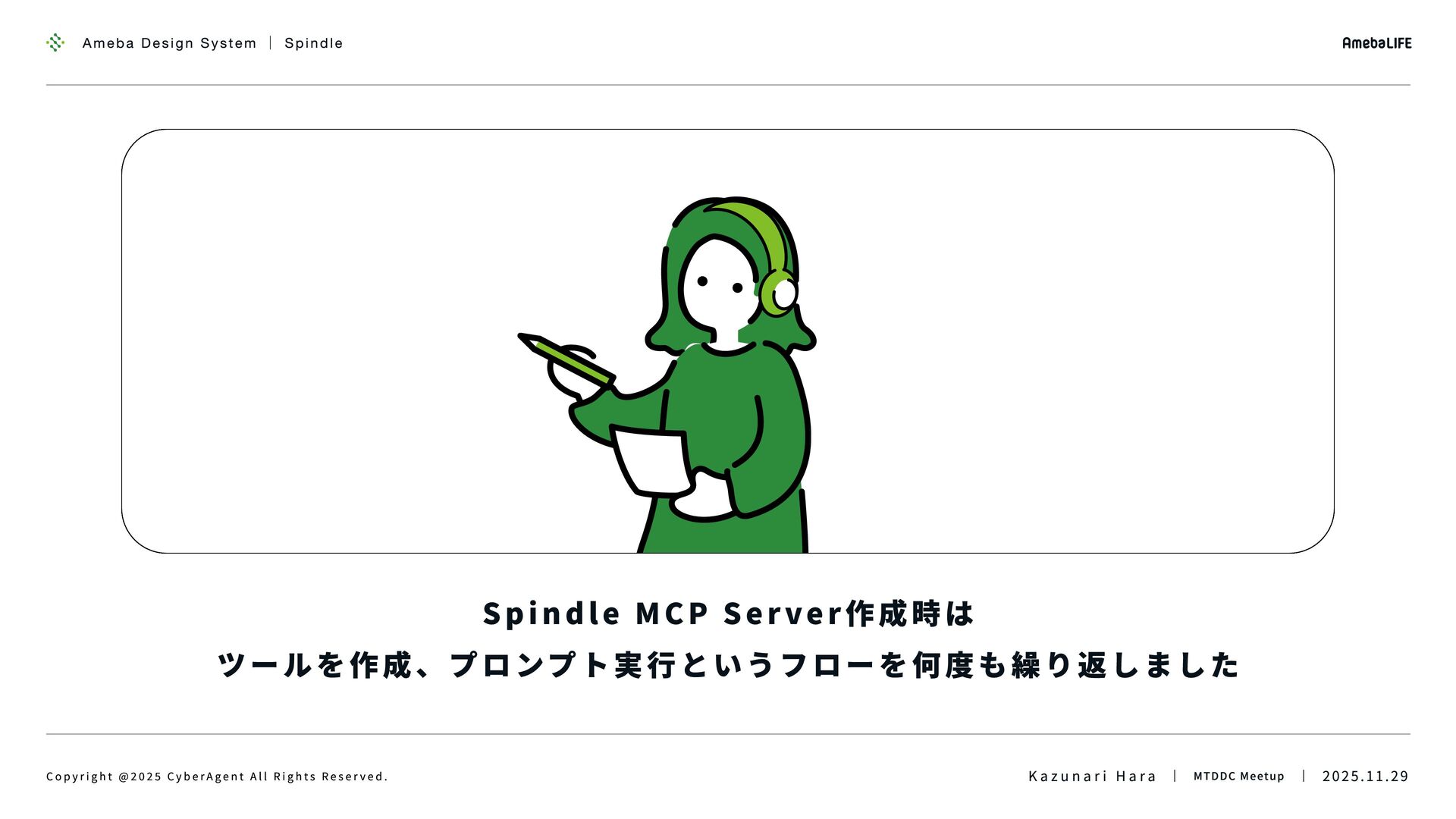 Amebaのデザインシステム「Spindle」を題材に、AIエージェントとデザインシステムが組み合わさるとWeb開発がどう変わるのかを実例ベースで紹介します。2024年までの「人と人の協業」から、2025年に「人とAIの協業」へどうシフトしたのかを、Spindle MCPによるコンテキスト提供、Design Doc自動生成、Figma MCP × Spindle MCPによるDesign to Code、依存モジュール更新やテスト環境整備を含むリポジトリ改善といった具体的な取り組みと数字で解説します。最後に、専門性とAI活用の掛け算がなぜ重要か、AI時代のデザインシステムの役割を提案します。