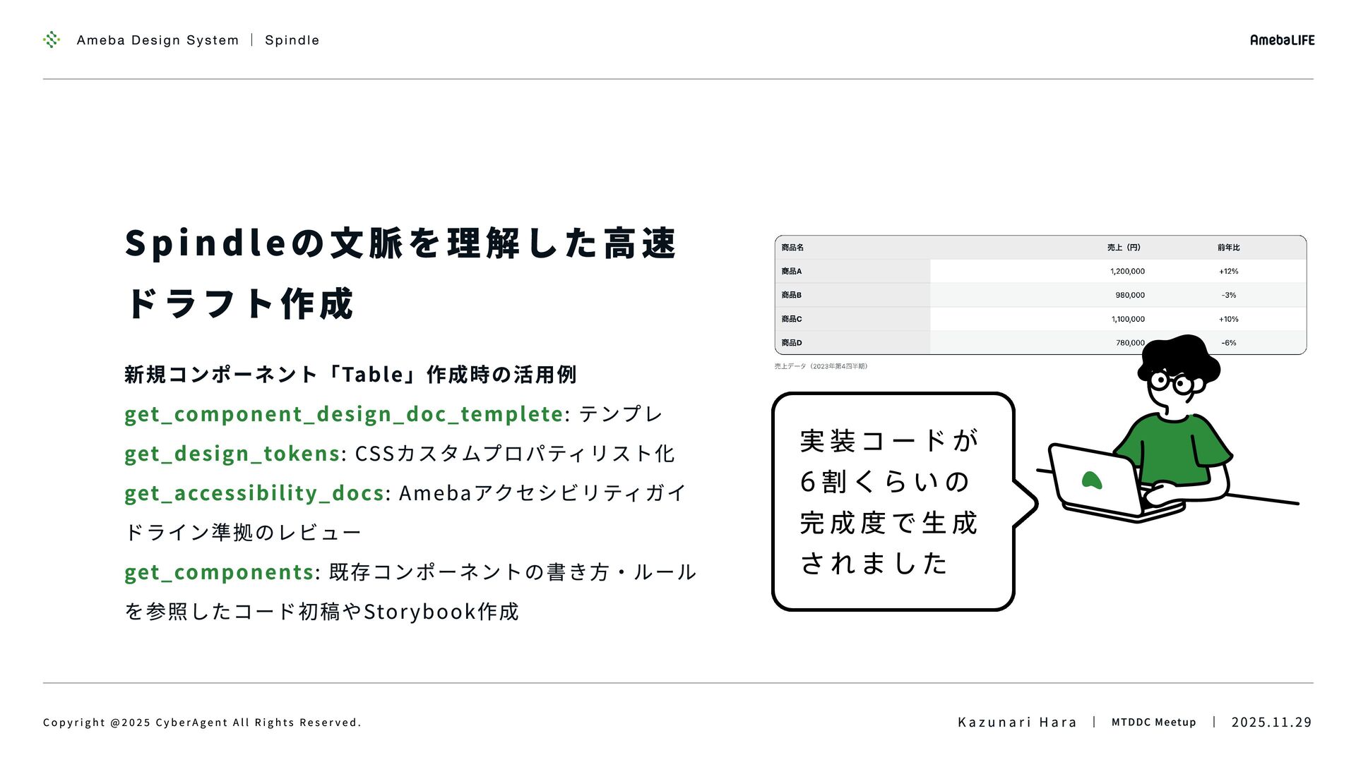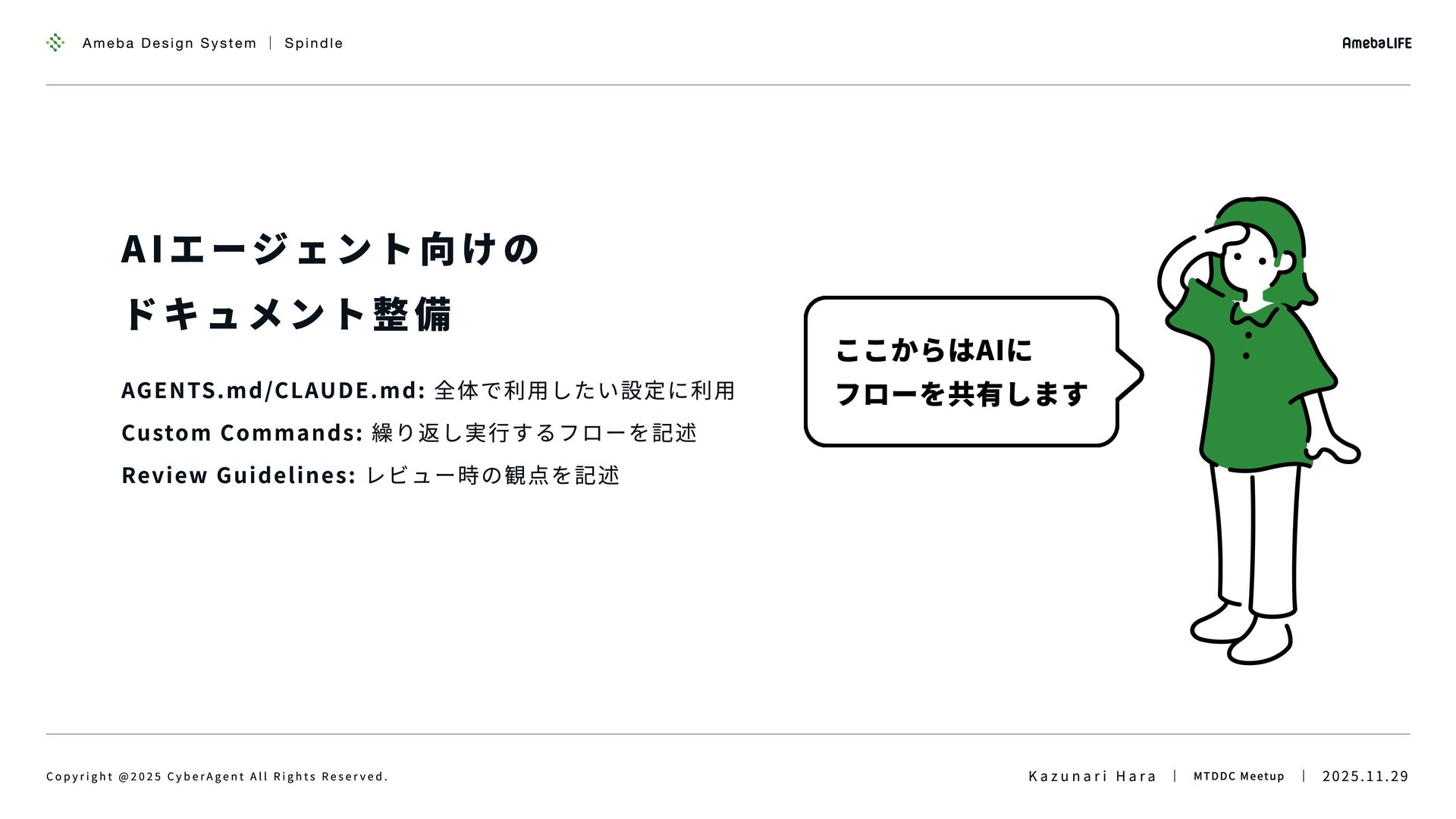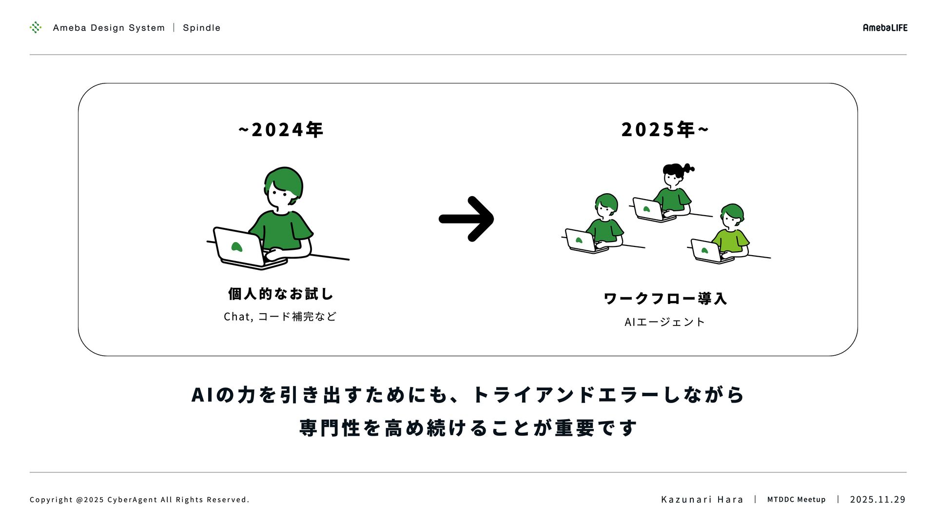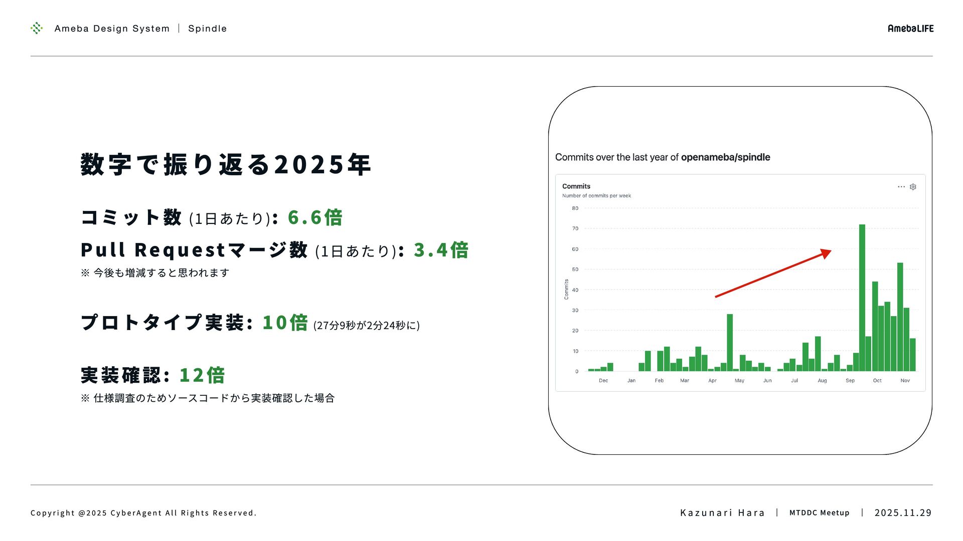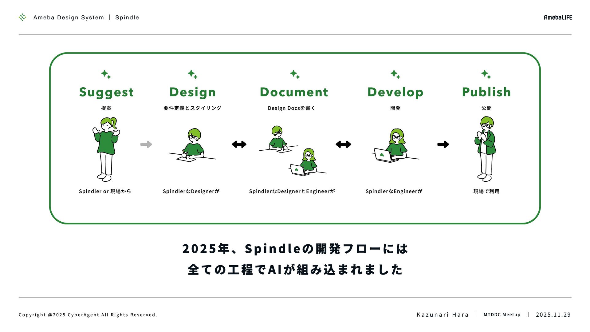 Amebaのデザインシステム「Spindle」を題材に、AIエージェントとデザインシステムが組み合わさるとWeb開発がどう変わるのかを実例ベースで紹介します。2024年までの「人と人の協業」から、2025年に「人とAIの協業」へどうシフトしたのかを、Spindle MCPによるコンテキスト提供、Design Doc自動生成、Figma MCP × Spindle MCPによるDesign to Code、依存モジュール更新やテスト環境整備を含むリポジトリ改善といった具体的な取り組みと数字で解説します。最後に、専門性とAI活用の掛け算がなぜ重要か、AI時代のデザインシステムの役割を提案します。