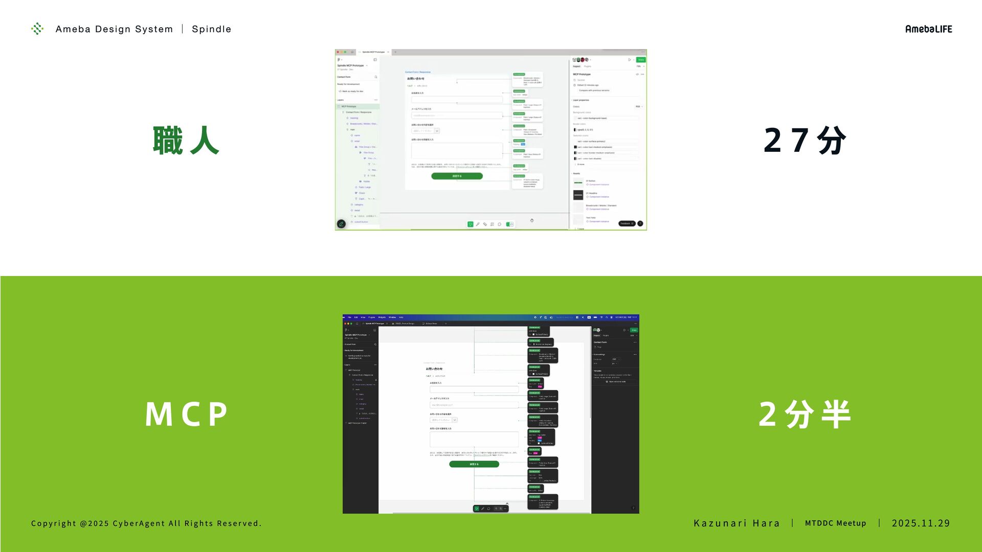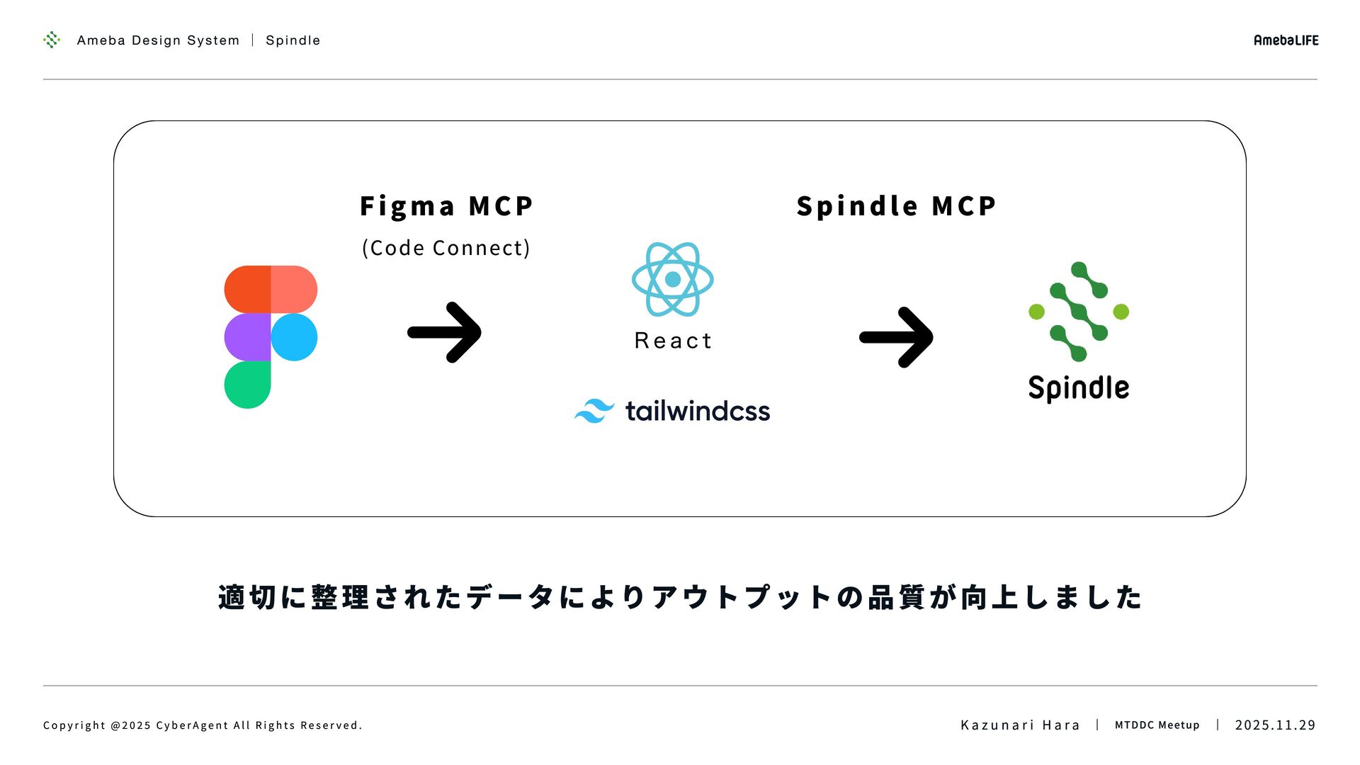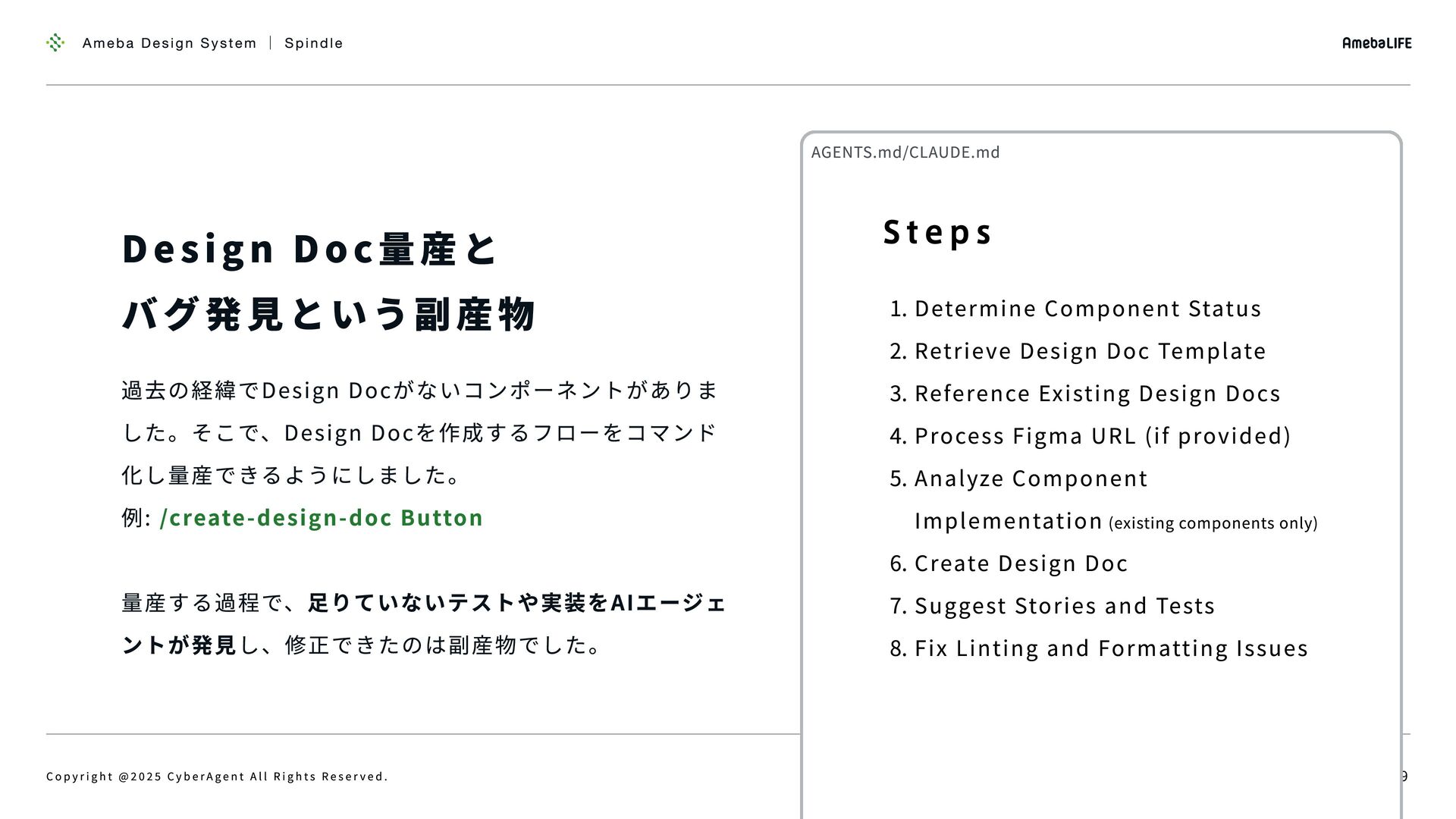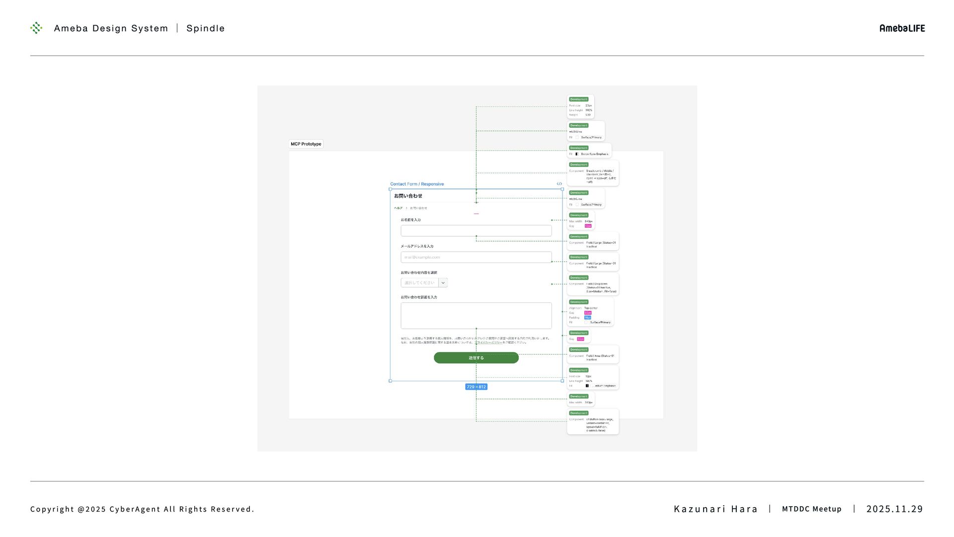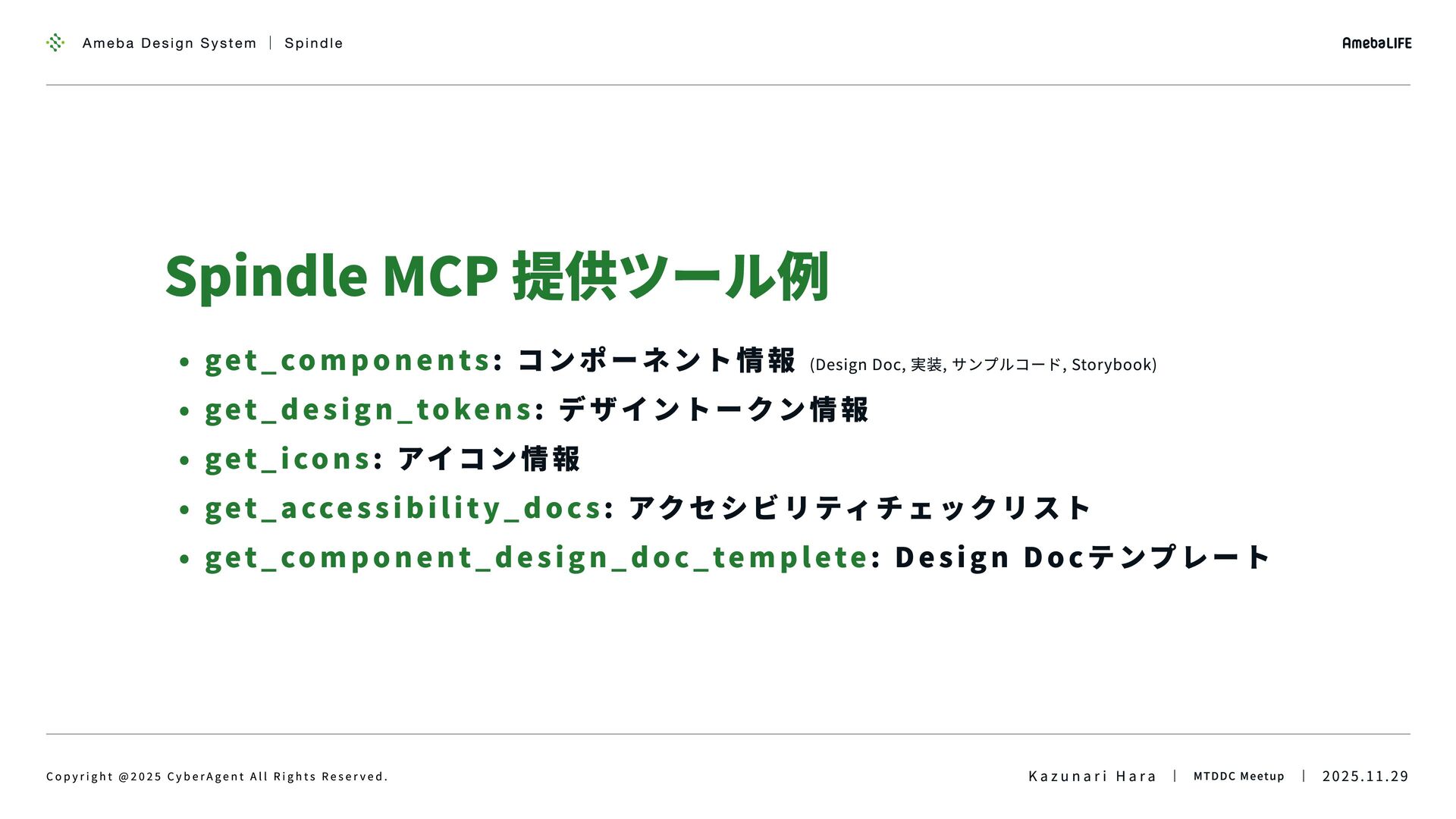 Amebaのデザインシステム「Spindle」を題材に、AIエージェントとデザインシステムが組み合わさるとWeb開発がどう変わるのかを実例ベースで紹介します。2024年までの「人と人の協業」から、2025年に「人とAIの協業」へどうシフトしたのかを、Spindle MCPによるコンテキスト提供、Design Doc自動生成、Figma MCP × Spindle MCPによるDesign to Code、依存モジュール更新やテスト環境整備を含むリポジトリ改善といった具体的な取り組みと数字で解説します。最後に、専門性とAI活用の掛け算がなぜ重要か、AI時代のデザインシステムの役割を提案します。
