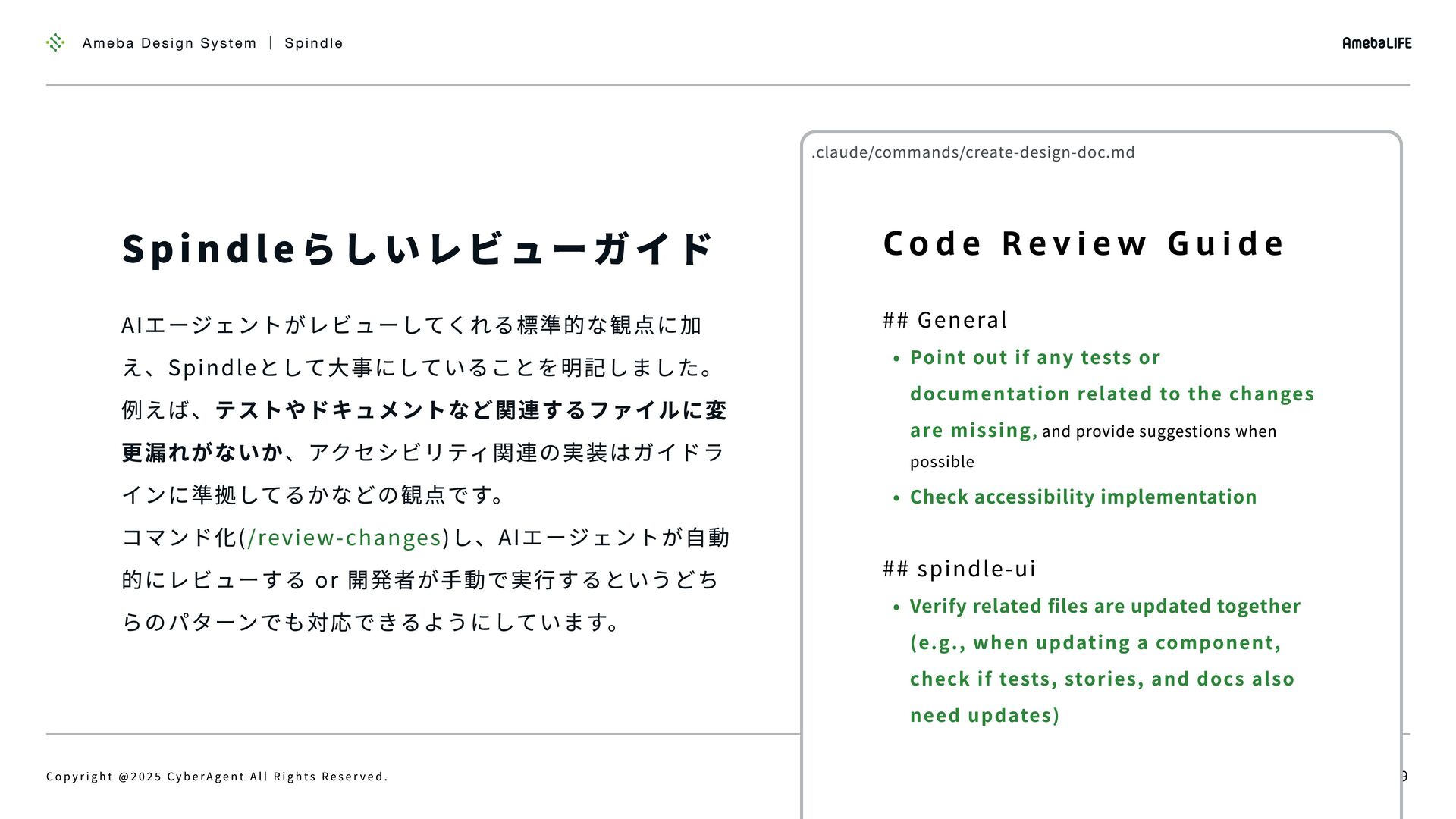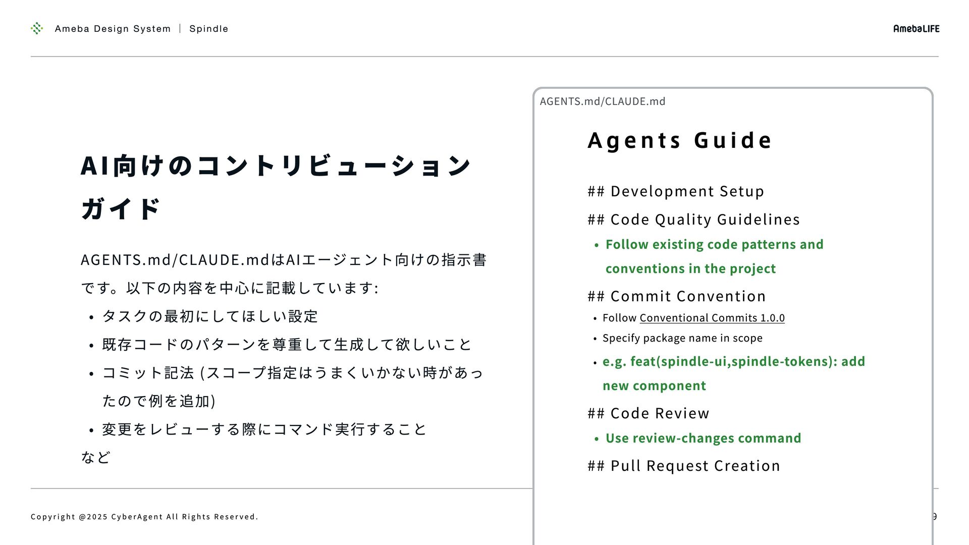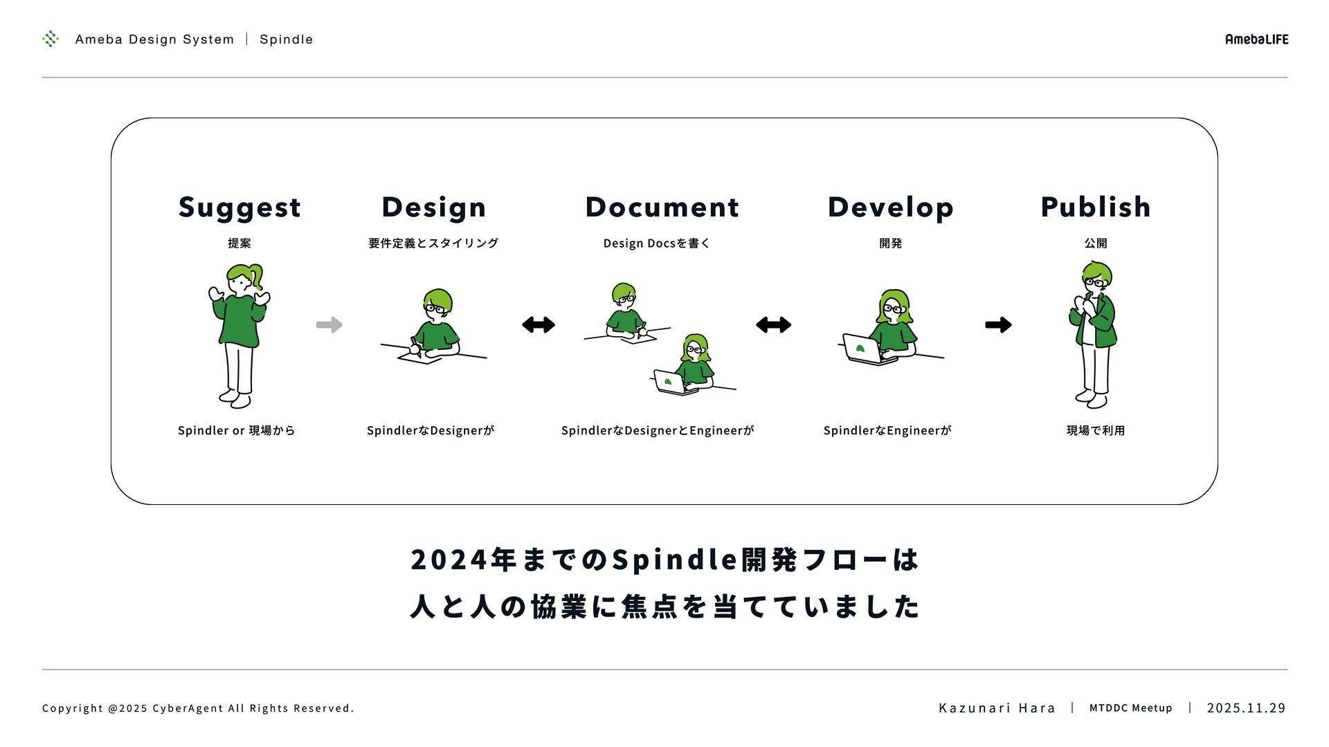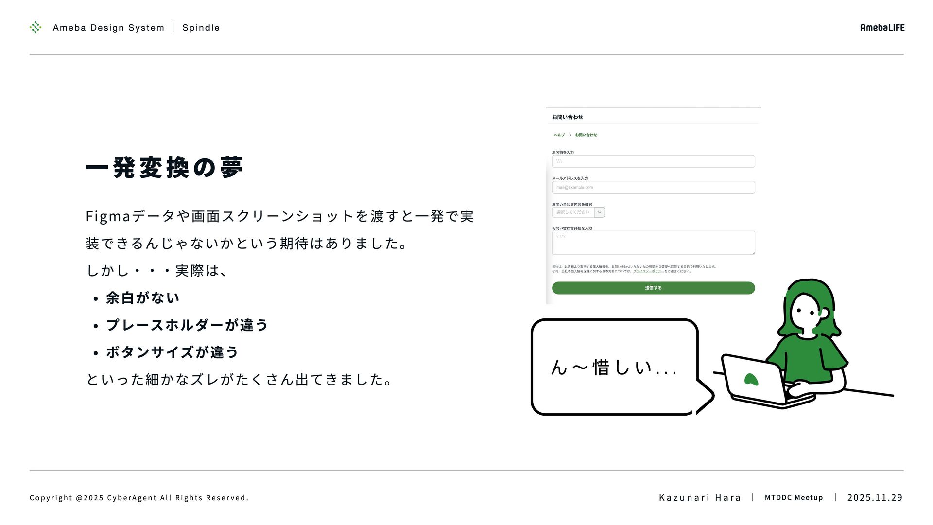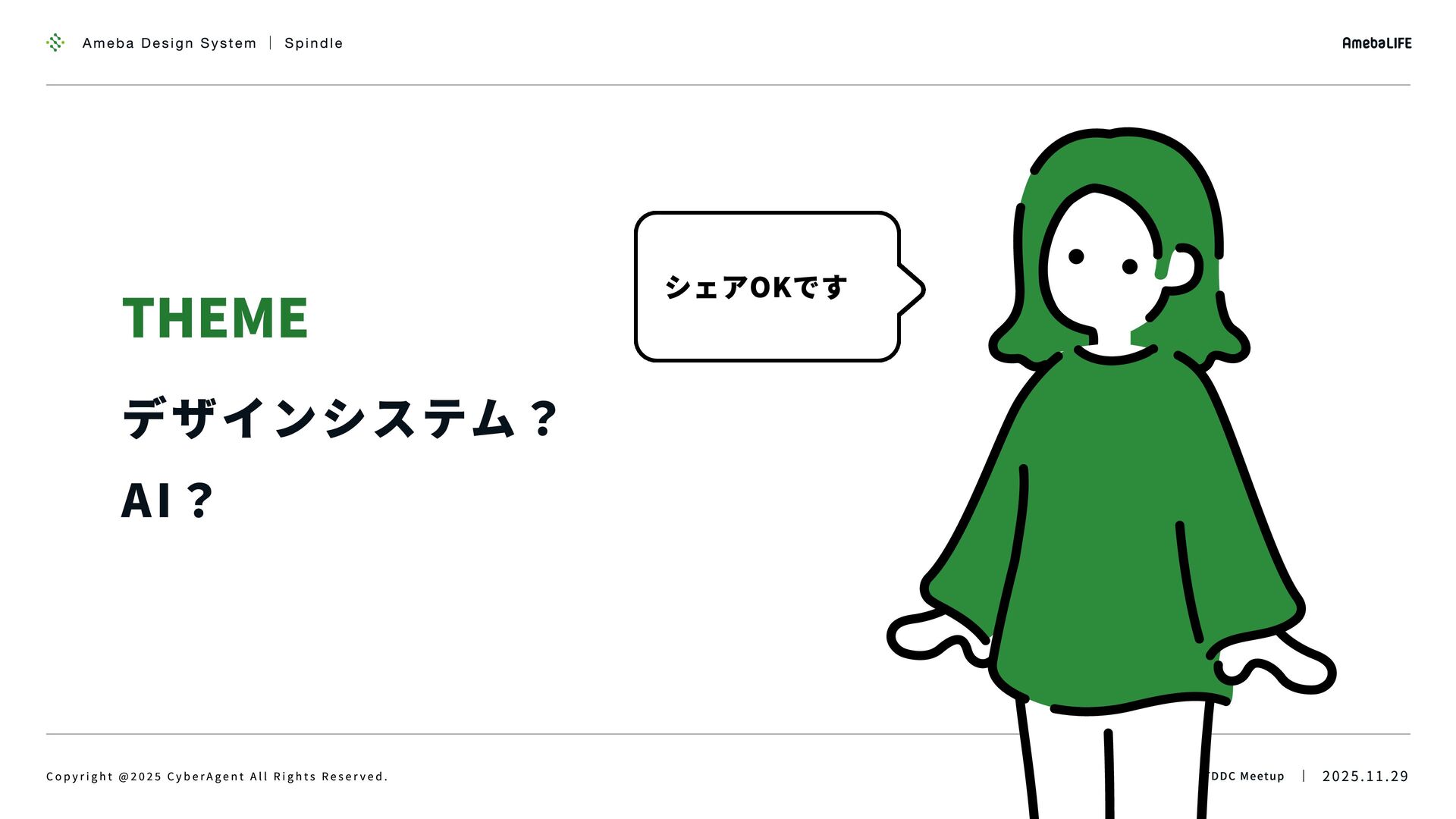 Amebaのデザインシステム「Spindle」を題材に、AIエージェントとデザインシステムが組み合わさるとWeb開発がどう変わるのかを実例ベースで紹介します。2024年までの「人と人の協業」から、2025年に「人とAIの協業」へどうシフトしたのかを、Spindle MCPによるコンテキスト提供、Design Doc自動生成、Figma MCP × Spindle MCPによるDesign to Code、依存モジュール更新やテスト環境整備を含むリポジトリ改善といった具体的な取り組みと数字で解説します。最後に、専門性とAI活用の掛け算がなぜ重要か、AI時代のデザインシステムの役割を提案します。