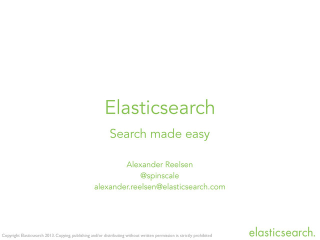 is strictly prohibited What is elasticsearch? • Schema-free, REST & JSON based, distributed document store • Apache License 2.0 • Language specific drivers • Zero configuration • Used by github, soundcloud, stackoverflow, mozilla, klout