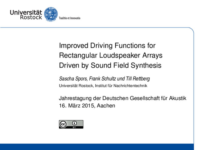 Presentation of the paper Sascha Spors, Frank Schultz, and Till Rettberg. Improved Driving Functions for Rectangular Loudspeaker Arrays Driven by Sound Field Synthesis. In German Annual Conference on Acoustics (DAGA), March 2016.