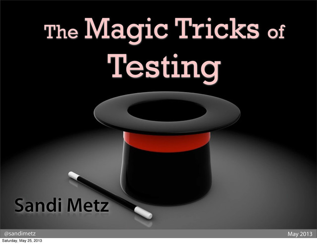 class GearTest < MiniTest::Unit::TestCase def test_calculates_gear_inches gear = Gear.new( chainring: 52, cog: 11, wheel: Wheel.new(26, 1.5)) assert_in_delta(137.1, gear.gear_inches, 0.01) assert_in_delta(29, gear.wheel.diameter, 0.01) end end Redundant: Duplicates Wheel’s tests Saturday, May 25, 2013