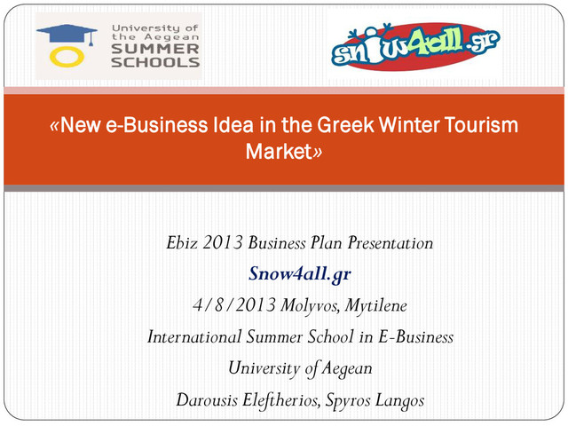 use services •Reliable and instant information for the status of the Greek ski centers/resorts •Mobile and desktop apps for portable and easy access of the offered services •Lack of providing live streaming image from the ski centers •Lack of trust in new entry start-up businesses from consumers Opportunities Threats •Lack of strong competition and opportunity for innovation and entry in the market of winter tourism •Continuous increase in the usage of internet and e-commerce services from Greek people •Possibility of future new innovative entries •Increased competition from overseas markets which offer the winter tourism product in lower prices as a package •Economical crisis in Greece, which affects consumers behavior and preferences •Continuous environmental pollution which affect weather conditions with immediate affect in the winter weather conditions