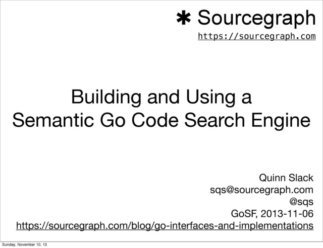 code? • What types implement http.ResponseWriter? • What interfaces does tls.Conn implement? ✱ Sourcegraph https://sourcegraph.com Sunday, November 10, 13