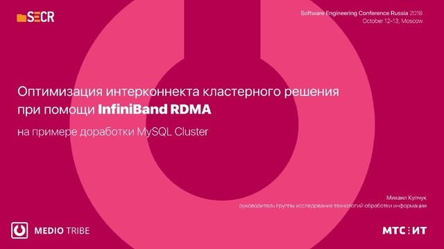 В докладе представлен опыт нашей команды по доработке MySQL Cluster для использования InfiniBand RDMA при взаимодействии узлов и приложений в кластере. В рамках рассмотрения вопроса о горизонтальном расширении промышленного стенда, нами, в качестве альтернативного решения, был разработан рабочий прототип, использующий нативный интерфейс RDMA, который показал 25% увеличение производительности решения (на использованном стенде из четырёх узлов, со 10k до 12.5k бизнес-операций в секунду, каждая из которых содержит в себе до 20-30 оперций с таблицами БД).