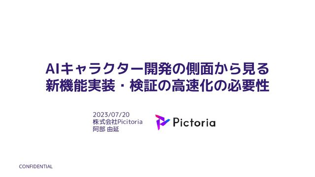 CONFIDENTIAL AIキャラクター開発の側面から見る 新機能実装・検証の高速化の必要性 2023/07/20 株式会社Picitoria 阿部 由延