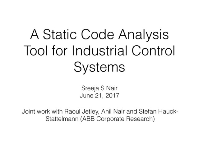 potential error conditions and coding compliance violations in Control system applications • Current focus on Structured Text & Function Block Diagrams; other languages to be targeted in future Sreeja Nair, Raoul Jetley, Anil Nair and Stefan Hauck-Stattelmann, “A Static Code Analysis Tool for Control System Software”, SANER 2015