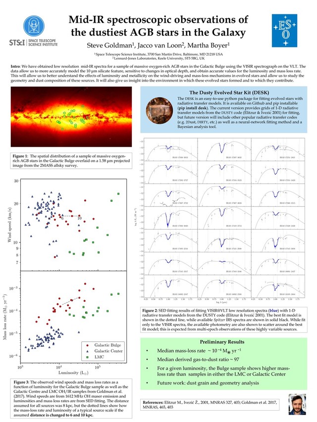 Galaxy Steve Goldman1, Jacco van Loon2, Martha Boyer1 1 Space Telescope Science Institute, 3700 San Martin Drive, Baltimore, MD 21218 USA 2 Lennard-Jones Laboratories, Keele University, ST5 5BG, UK Preliminary Results • Median mass-loss rate ~ 10 −4 M⦿ yr −1 • Median derived gas-to-dust ratio ~ 97 • For a given luminosity, the Bulge sample shows higher mass- loss rate than samples in either the LMC or Galactic Center • Future work: dust grain and geometry analysis Figure 3: The observed wind speeds and mass loss rates as a function of luminosity for the Galactic Bulge sample as well as the Galactic Centre and LMC OH/IR samples from Goldman et al. (2017). Wind speeds are from 1612 MHz OH maser emission and luminosities and mass loss rates are from SED fitting. The distance assumed for all sources was 8 kpc, but the dotted lines show how the mass-loss rate and luminosity of a typical source scale if the assumed distance is changed to 6 and 10 kpc. Figure 2: SED fitting results of fitting VISIR@VLT low resolution spectra (blue) with 1-D radiative transfer models from the DUSTY code (Elitzur & Ivezić 2001). The best fit model is shown in the dotted line, while available Spitzer IRS spectra are shown in solid black. While fit only to the VISIR spectra, the available photometry are also shown to scatter around the best fit model; this is expected from multi-epoch observations of these highly variable sources. Intro: We have obtained low resolution mid-IR spectra for a sample of massive oxygen-rich AGB stars in the Galactic Bulge using the VISIR spectrograph on the VLT. The data allow us to more accurately model the 10 µm silicate feature, sensitive to changes in optical depth, and obtain accurate values for the luminosity and mass loss rate. This will allow us to better understand the effects of luminosity and metallicity on the wind-driving and mass-loss mechanisms in evolved stars and allow us to study the geometry and dust composition of these sources. It will also give us insight into the environment in which these evolved stars formed and to which they contribute. The DESK is an easy-to-use python package for fitting evolved stars with radiative transfer models. It is available on Github and pip installable (pip install desk). The current version provides grids of 1-D radiative transfer models from the DUSTY code (Elitzur & Ivezić 2001) for fitting, but future version will include other popular radiative transfer codes (e.g. 2Dust, DIRTY, etc.) as well as a neural-network fitting method and a Bayesian analysis tool. References: Elitzur M., Ivezić Ž., 2001, MNRAS 327, 403; Goldman et al. 2017, MNRAS, 465, 403 The Dusty Evolved Star Kit (DESK) Figure 1: The spatial distribution of a sample of massive oxygen- rich AGB stars in the Galactic Bulge overlaid on a 1.58 µm projected image from the 2MASS allsky survey.