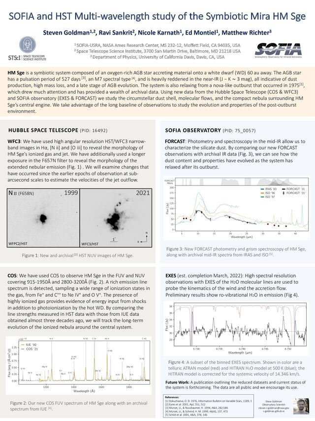 Sge Steven Goldman1,2, Ravi Sankrit2, Nicole Karnath1, Ed Montiel1, Matthew Richter3 1 SOFIA-USRA, NASA Ames Research Center, MS 232-12, Moffett Field, CA 94035, USA 2 Space Telescope Science Institute, 3700 San Martin Drive, Baltimore, MD 21218 USA 3 Department of Physics, University of California Davis, Davis, CA, USA References: [1] Dokuchaeva, O. D. 1976, Information Bulletin on Variable Stars, 1189, 1 [2] Eyres et al. 2001, ApJ, 551, 512 [3] Murset, U., & Nussbaumer, H. 1994, A&A, 282,586 [4] Mürset, U., & Schmid, H. M. 1999, A&AS, 137, 473 [5] Schild et al. 2001, A&A, 378, 146 Figure 3: New FORCAST photometry and grism spectroscopy of HM Sge, along with archival mid-IR spectra from IRAS and ISO [5]. FORCAST: Photometry and spectroscopy in the mid-IR allow us to characterize the silicate dust. By comparing our new FORCAST observations with archival IR data (Fig. 3), we can see how the dust content and properties have evolved as the system has relaxed after its outburst. SOFIA OBSERVATORY (PID: 75_0057) WFC3: We have used high angular resolution HST/WFC3 narrow- band images in Hα, [N ii] and [O iii] to reveal the morphology of HM Sge’s ionized gas and jet. We have additionally used a longer exposure in the F657N filter to reveal the morphology of the extended nebular emission (Fig. 1) . We will examine changes that have occurred since the earlier epochs of observation at sub- arcsecond scales to estimate the velocities of the jet outflow. HUBBLE SPACE TELESCOPE (PID: 16492) Figure 2: Our new COS FUV spectrum of HM Sge along with an archival spectrum from IUE [4]. Figure 1: New and archival[2] HST NUV images of HM Sge. HM Sge is a symbiotic system composed of an oxygen-rich AGB star accreting material onto a white dwarf (WD) 60 au away. The AGB star has a pulsation period of 527 days [3], an M7 spectral type[4], and is heavily reddened in the near-IR (J − K ∼ 3 mag), all indicative of dust production, high mass loss, and a late stage of AGB evolution. The system is also relaxing from a nova-like outburst that occurred in 1975[1], which drew much attention and has provided a wealth of archival data. Using new data from the Hubble Space Telescope (COS & WFC3) and SOFIA observatory (EXES & FORCAST) we study the circumstellar dust shell, molecular flows, and the compact nebula surrounding HM Sge’s central engine. We take advantage of the long baseline of observations to study the evolution and properties of the post-outburst environment. Future Work: A publication outlining the reduced datasets and current status of the system is forthcoming. The data are all public and we encourage its use. 1999 2021 WFPC2/HST NII (F658N) WFC3/HST 1ʺ COS: We have used COS to observe HM Sge in the FUV and NUV covering 915-1950Å and 2800-3200Å (Fig. 2). A rich emission line spectrum is detected, sampling a wide range of ionization states in the gas, from Fe+ and C++ to Ne IV+ and O V+. The presence of highly ionized gas provides evidence of energy input from shocks in addition to photoionization by the hot WD. By comparing the line strengths measured in HST data with those from IUE data obtained almost three decades ago, we will track the long-term evolution of the ionized nebula around the central system. EXES (est. completion March, 2022): High spectral resolution observations with EXES of the H2O molecular lines are used to probe the kinematics of the wind and the accretion flow. Preliminary results show ro-vibrational H2O in emission (Fig 4). Figure 4: A subset of the binned EXES spectrum. Shown in color are a telluric ATRAN model (red) and HITRAN H2O model at 500 K (blue); the HITRAN model is corrected for the systemic velocity of 14.346 km/s. Steve Goldman Observatory Scientist