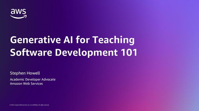 Web Services, Inc. or its affiliates. All rights reserved. About the Speaker Stephen Howell is a technologist and educator with over 25 years of experience in software engineering, lecturing, program management, and education. As a software engineer, he worked on diverse projects involving technologies from finance to IoT systems. For over a decade, he was a computing lecturer at universities including Dublin City University and Institute of Technology Tallaght (now Technological University Dublin). He taught modules covering algorithms, data structures, object- oriented programming, software engineering, cloud computing, computer graphics, visual design, and interactive media. Currently at Amazon Web Services, Stephen is an Academic Developer Advocate supporting students and faculty in building cloud and AI skills. 20